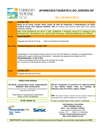 APARECIDA/TAUBATÉ/C.DO JORDÃO-SP 26 a 28.Abril.2013 1º dia Curitiba (PR) Saída às 22 horas (chegar 30min antes) da Sala de Embarque e Desembarque do SESC Turismo Social, Rua Augusto Stellfeld, 640, em ônibus leito turismo (semi leito) com música ambiente e toalete. OBS: POR EXIGÊNCIA DA ANTT E DER, SOMENTE A PESSOA (ADULTO E CRIANÇA) QUE APRESENTAR DOCUMENTO DE IDENTIDADE ORIGINAL PODERÁ EMBARCAR NO ÔNIBUS. 2º dia Aparecida(SP) Chegada prevista às 07 horas. Visita ao Santuário de Aparecida. . 2ºao 3ºdia Taubaté/Campos do Jordão (SP) Hospedagem no San Michel Palace Hotel (Tel: 0xx12-2125-5944) em Taubaté, em apartamentos duplos para casais e triplos para individuais. Liberação dos apartamentos apartir da 12h. PROGRAMAÇÃO: 2º AO 3º DIA: - Visita ao principais pontos turísticos de Campos do Jordão. Às 14 horas do 3º dia saída de retorno a Curitiba. 3° dia Curitiba (PR) Chegada prevista às 23 horas. PREÇO POR PESSOA R$ 450,00 - Comerciários, Emp. e Dependentes R$495,00 - Não Comerciários Prazo de inscrição até 15.02.13. Indispensavel a apresentação do cartão de cliente do SESC. Preço base em apartamento duplo/triplo. Grupo mínimo 30 pessoas Nº DE VAGAS: 40 INCLUI: Transporte, 01 pernoite e 01 cafés da manhã no San Michel Palace Hotel em Taubaté, 02 refeições, guia de turismo, seguro viagem. OBS: Não estão incluídas as demais taxas de visitação, refeições não especificadas acima, bebidas e despesas de caráter pessoal. O preço e programação estão sujeitos a alteração. Informações e Inscrições SESC TURISMO SOCIAL MTur – PR. 18.025381.10.0028-3 Rua Visconde do Rio Branco, 969 Curitiba - PR FONE: (41) 3304.2204 E-mail: [email protected] Site: www.sescpr.com.br IMPORTANTE! Leia atentamente as condições gerais para participação nas excursões organizadas pelo SESC.