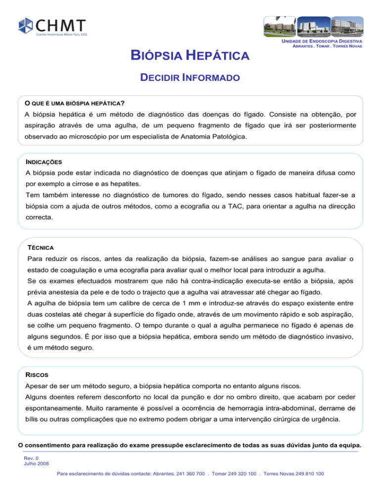 UNIDADE DE ENDOSCOPIA DIGESTIVA ABRANTES . TOMAR . TORRES NOVAS BIÓPSIA HEPÁTICA DECIDIR INFORMADO O QUE É UMA BIÓSPIA HEPÁTICA? A biópsia hepática é um método de diagnóstico das doenças do fígado. Consiste na obtenção, por aspiração através de uma agulha, de um pequeno fragmento de fígado que irá ser posteriormente observado ao microscópio por um especialista de Anatomia Patológica. INDICAÇÕES A biópsia pode estar indicada no diagnóstico de doenças que atinjam o fígado de maneira difusa como por exemplo a cirrose e as hepatites. Tem também interesse no diagnóstico de tumores do fígado, sendo nesses casos habitual fazer-se a biópsia com a ajuda de outros métodos, como a ecografia ou a TAC, para orientar a agulha na direcção correcta. TÉCNICA Para reduzir os riscos, antes da realização da biópsia, fazem-se análises ao sangue para avaliar o estado de coagulação e uma ecografia para avaliar qual o melhor local para introduzir a agulha. Se os exames efectuados mostrarem que não há contra-indicação executa-se então a biópsia, após prévia anestesia da pele e de todo o trajecto que a agulha vai atravessar até chegar ao fígado. A agulha de biópsia tem um calibre de cerca de 1 mm e introduz-se através do espaço existente entre duas costelas até chegar à superfície do fígado onde, através de um movimento rápido e sob aspiração, se colhe um pequeno fragmento. O tempo durante o qual a agulha permanece no fígado é apenas de alguns segundos. É por isso que a biópsia hepática, embora sendo um método de diagnóstico invasivo, é um método seguro. RISCOS Apesar de ser um método seguro, a biópsia hepática comporta no entanto alguns riscos. Alguns doentes referem desconforto no local da punção e dor no ombro direito, que acabam por ceder espontaneamente. Muito raramente é possível a ocorrência de hemorragia intra-abdominal, derrame de bílis ou outras complicações que no extremo podem obrigar a uma intervenção cirúrgica de urgência. O consentimento para realização do exame pressupõe esclarecimento de todas as suas dúvidas junto da equipa. Rev. 0 Julho 2008 Para esclarecimento de dúvidas contacte: Abrantes: 241 360 700 . Tomar 249 320 100 . Torres Novas 249 810 100
