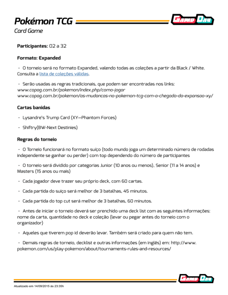 Pokémon TCG Card Game Participantes: 02 a 32 Formato: Expanded ɱɱ O torneio será no formato Expanded, valendo todas as coleções a partir da Black / White. Consulta a lista de coleções válidas. ɱɱ Serão usadas as regras tradicionais, que podem ser encontradas nos links: www.copag.com.br/pokemon/index.php/como-jogar www.copag.com.br/pokemon/as-mudancas-no-pokemon-tcg-com-a-chegada-da-expansao-xy/ Cartas banidas ɱɱ Lysandre’s Trump Card (XY—Phantom Forces) ɱɱ Shiftry(BW-Next Destinies) Regras do torneio ɱɱ O Torneio funcionará no formato suíço (todo mundo joga um determinado número de rodadas independente se ganhar ou perder) com top dependendo do número de participantes ɱɱ O torneio será dividido por categorias Junior (10 anos ou menos), Senior (11 a 14 anos) e Masters (15 anos ou mais) ɱɱ Cada jogador deve trazer seu próprio deck, com 60 cartas. ɱɱ Cada partida do suiço será melhor de 3 batalhas, 45 minutos. ɱɱ Cada partida do top cut será melhor de 3 batalhas, 60 minutos. ɱɱ Antes de iniciar o torneio deverá ser prenchido uma deck list com as seguintes informações: nome da carta, quantidade no deck e coleção (levar ou pegar antes do torneio com o organizador) ɱɱ Aqueles que tiverem pop id deverão levar. Também será criado para quem não tem. ɱɱ Demais regras de torneio, decklist e outras informações (em inglês) em: http://www. pokemon.com/us/play-pokemon/about/tournaments-rules-and-resources/ Atualizado em 14/09/2015 às 23:35h