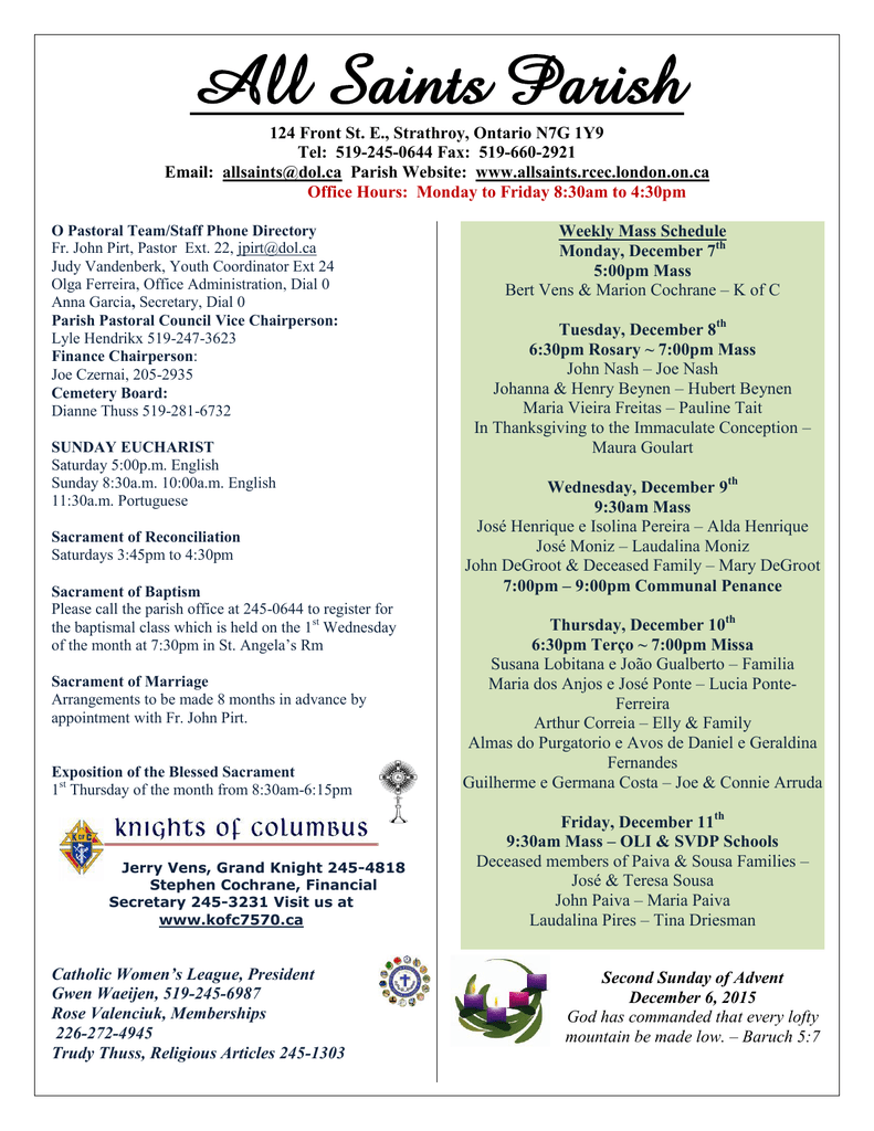 All Saints Parish 124 Front St. E., Strathroy, Ontario N7G 1Y9 Tel: 519-245-0644 Fax: 519-660-2921 Email: [email protected] Parish Website: www.allsaints.rcec.london.on.ca Office Hours: Monday to Friday 8:30am to 4:30pm O Pastoral Team/Staff Phone Directory Fr. John Pirt, Pastor Ext. 22, [email protected] Judy Vandenberk, Youth Coordinator Ext 24 Olga Ferreira, Office Administration, Dial 0 Anna Garcia, Secretary, Dial 0 Parish Pastoral Council Vice Chairperson: Lyle Hendrikx 519-247-3623 Finance Chairperson: Joe Czernai, 205-2935 Cemetery Board: Dianne Thuss 519-281-6732 SUNDAY EUCHARIST Saturday 5:00p.m. English Sunday 8:30a.m. 10:00a.m. English 11:30a.m. Portuguese Sacrament of Reconciliation Saturdays 3:45pm to 4:30pm Sacrament of Baptism Please call the parish office at 245-0644 to register for the baptismal class which is held on the 1st Wednesday of the month at 7:30pm in St. Angela’s Rm Sacrament of Marriage Arrangements to be made 8 months in advance by appointment with Fr. John Pirt. Exposition of the Blessed Sacrament 1st Thursday of the month from 8:30am-6:15pm Jerry Vens, Grand Knight 245-4818 Stephen Cochrane, Financial Secretary 245-3231 Visit us at www.kofc7570.ca Catholic Women’s League, President Gwen Waeijen, 519-245-6987 Rose Valenciuk, Memberships 226-272-4945 Trudy Thuss, Religious Articles 245-1303 Weekly Mass Schedule Monday, December 7th 5:00pm Mass Bert Vens & Marion Cochrane – K of C Tuesday, December 8th 6:30pm Rosary ~ 7:00pm Mass John Nash – Joe Nash Johanna & Henry Beynen – Hubert Beynen Maria Vieira Freitas – Pauline Tait In Thanksgiving to the Immaculate Conception – Maura Goulart Wednesday, December 9th 9:30am Mass José Henrique e Isolina Pereira – Alda Henrique José Moniz – Laudalina Moniz John DeGroot & Deceased Family – Mary DeGroot 7:00pm – 9:00pm Communal Penance Thursday, December 10th 6:30pm Terço ~ 7:00pm Missa Susana Lobitana e João Gualberto – Familia Maria dos Anjos e José Ponte – Lucia PonteFerreira Arthur Correia – Elly & Family Almas do Purgatorio e Avos de Daniel e Geraldina Fernandes Guilherme e Germana Costa – Joe & Connie Arruda Friday, December 11th 9:30am Mass – OLI & SVDP Schools Deceased members of Paiva & Sousa Families – José & Teresa Sousa John Paiva – Maria Paiva Laudalina Pires – Tina Driesman Second Sunday of Advent December 6, 2015 God has commanded that every lofty mountain be made low. – Baruch 5:7 93 DATE (do not change anything here, we’ll put a correct header each week) Meetings at All Saints Monday, December 7 1:00pm K of C Cards/Pool, Col. Rm 6:00pm CWL/KofC Christmas Social, Parish Centre Tuesday, December 8 1:30pm Al-anon, St. Angela’s Rm 7:00pm Helping Hands Meeting, St. Angela’s Rm 7:30pm RCIA, St. Patrick’s Rm Wednesday, December 9 12:00pm Pastoral Care Christmas, Col. Rm 1:00pm Prayer Group, St. Patrick’s Rm Thursday, December 10 6:30pm Senior’s Euchre, Col. Rm 6:30pm Mini Saints Club, Parish Centre Diocesan Prayer Calendar May we remember in prayer, the priest, deacons, religious women and men and seminarians of the Diocese of London. May they be faithful to the charge given them by the Lord. Dec 6 – Mr. Evan Thompson, Youth Ministry Dec 7 – Deacon Lyle Lalonge Dec 8 – Rev. Bernard Pinsonneault, C.S.B. Dec 9 – Mrs. Colleen Keane, Pastoral Minister Dec 10 – Mrs. Christine Coyle, Youth Minister Dec 11 – Rev. Steve Wlusek Dec 12 – Ms. Suzanne Walton, Pastoral Minister CWL & K of C Christmas Social Monday, December 7th. We will be starting with Mass at 5pm. Doors open at 6 pm. Dinner at 6:30 pm. Cost is $10 per person and we ask that you bring a non-perishable food item. A grateful thank you! Thank you to all those who filled Christmas Child shoeboxes. This year we gathered 77 boxes for children in places where no gifts are ever seen except for these. The Angel Tree will be in the Narthex starting this weekend. Please take an angel for the age and gender you wish to buy for and bring an UNWRAPPED gift for the poor and bring the Light of Jesus into their hearts if even for one day. We will be collecting up to December 20 and distributing them to the local food bank, Women’s Rural Resources and local Children’s Services office. It is our Christmas food collection and we thank those who donate on a regular basis. Your donations go to the food bank, Women’s Shelter and CAS. Please find a few extra groceries for those in need. Thanks. ANGEL TREE On the Christmas tree in the narthex, there are angels which you may take as a reminder to return a gift for a needy child in our community. Please return the toys, unwrapped, with the angel, so that they can be distributed before Christmas. ÁRVORE DE ANJO Na árvore de Natal no tapa vente, existem anjos que você pode tomar como um lembrete para devolver um presente para uma criança carente em nossa comunidade. Por favor, devolvam os brinquedos, desembrulhados, com o anjo, para que eles possam ser distribuídos antes do Natal. The St. Vincent de Paul Society is asking you to be generous for the annual CHRISTMAS FOOD DRIVE Grocery bags are being provided as a reminder to return them filled with dry goods and other groceries that can be stored. (Great examples of things to donate are; cereals, pasta, pasta sauces, canned fruits/veggies, peanut butter, soups, etc.) A Sociedade de St. Vincent de Paul está lhe pedindo para ser generoso para a Campanha Anual de ALIMENTOS do NATAL Sacos de supermercado estão sendo fornecidos como um lembrete para devolvê-los preenchidos com produtos secos e outros alimentos que podem ser guardados. (exemplos de coisas para doar são: cereais, massas, molhos para massas, conservas de frutas / vegetais, manteiga de amendoim, sopas, etc.) Adopt a Family Would you and your family like to share some of your food and gifts with a less fortunate family? Or do you know of a parish family who has little or no money for food and gifts at Christmas? Please contact the parish office