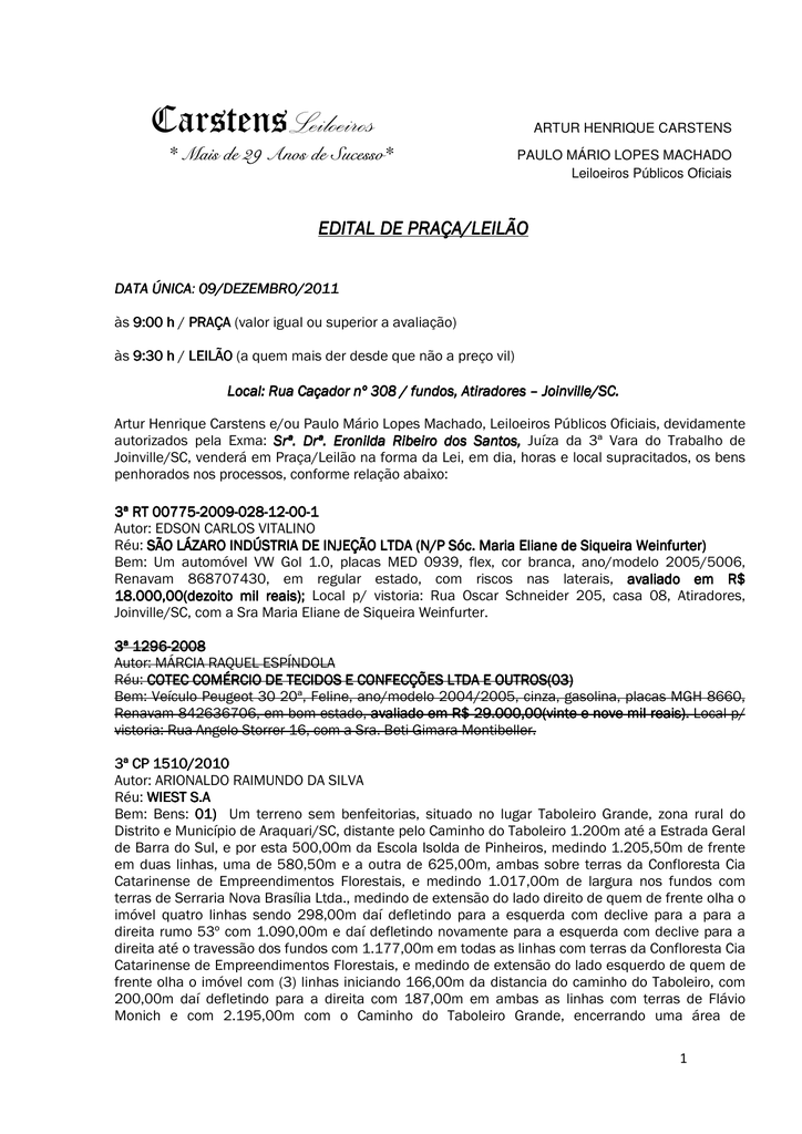 CarstensLeiloeiros *Mais de 29 Anos de Sucesso * ARTUR HENRIQUE CARSTENS PAULO MÁRIO LOPES MACHADO Leiloeiros Públicos Oficiais EDITAL DE PRAÇA/LEILÃO DATA ÚNICA: ÚNICA 09/DEZEMBRO/2011 às 9:00 h / PRAÇA (valor igual ou superior a avaliação) às 9:30 h / LEILÃO (a quem mais der desde que não a preço vil) Local: Rua Caçador nº 308 / fundos, Atiradores – Joinville/SC. Artur Henrique Carstens e/ou Paulo Mário Lopes Machado, Leiloeiros Públicos Oficiais, devidamente autorizados pela Exma: Srª. Drª. Eronilda Ribeiro dos Santos, Juíza da 3ª Vara do Trabalho de Joinville/SC, venderá em Praça/Leilão na forma da Lei, em dia, horas e local supracitados, os bens penhorados nos processos, conforme relação abaixo: 3ª RT 0077500775-20092009-028028-1212-0000-1 Autor: EDSON CARLOS VITALINO Réu: SÃO LÁZARO INDÚSTRIA DE INJEÇÃO LTDA (N/P Sóc. Maria Eliane de Siqueira Weinfurter) Bem: Um automóvel VW Gol 1.0, placas MED 0939, flex, cor branca, ano/modelo 2005/5006, Renavam 868707430, em regular estado, com riscos nas laterais, avaliado em R$ 18.000,00(dezoito mil reais); Local p/ vistoria: Rua Oscar Schneider 205, casa 08, Atiradores, Joinville/SC, com a Sra Maria Eliane de Siqueira Weinfurter. 3ª 12961296-2008 Autor: MÁRCIA RAQUEL ESPÍNDOLA Réu: COTEC COMÉRCIO DE TECIDOS E CONFECÇÕES LTDA E OUTROS(03) Bem: Veículo Peugeot 30 20ª, Feline, ano/modelo 2004/2005, cinza, gasolina, placas MGH 8660, Renavam 842636706, em bom estado, avaliado em R$ 29.000,00(vinte e nove mil reais). reais). Local p/ vistoria: Rua Angelo Storrer 16, com a Sra. Beti Gimara Montibeller. 3ª CP 1510/2010 Autor: ARIONALDO RAIMUNDO DA SILVA Réu: WIEST S.A Bem: Bens: 01) Um terreno sem benfeitorias, situado no lugar Taboleiro Grande, zona rural do Distrito e Município de Araquari/SC, distante pelo Caminho do Taboleiro 1.200m até a Estrada Geral de Barra do Sul, e por esta 500,00m da Escola Isolda de Pinheiros, medindo 1.205,50m de frente em duas linhas, uma de 580,50m e a outra de 625,00m, ambas sobre terras da Confloresta Cia Catarinense de Empreendimentos Florestais, e medindo 1.017,00m de largura nos fundos com terras de Serraria Nova Brasília Ltda., medindo de extensão do lado direito de quem de frente olha o imóvel quatro linhas sendo 298,00m daí defletindo para a esquerda com declive para a para a direita rumo 53º com 1.090,00m e daí defletindo novamente para a esquerda com declive para a direita até o travessão dos fundos com 1.177,00m em todas as linhas com terras da Confloresta Cia Catarinense de Empreendimentos Florestais, e medindo de extensão do lado esquerdo de quem de frente olha o imóvel com (3) linhas iniciando 166,00m da distancia do caminho do Taboleiro, com 200,00m daí defletindo para a direita com 187,00m em ambas as linhas com terras de Flávio Monich e com 2.195,00m com o Caminho do Taboleiro Grande, encerrando uma área de 1 2.771.023,69m². Cadastrado no INCRA sob nº 801.011.003.646 – 801.011.007.064 e 801.011.012.602, Matrícula nº 7.200 no Cartório de Registro de Imóveis da 2ª Circunscrição da Comarca de São Francisco do Sul/SC. Avaliado em R$ 4.156.534,00(quatro milhões cento e cinquenta e seis mil quinhentos e trinta e quatro reais). Consta penhora no processo 2009.72.01.002100-9 da Vara das execuções Fiscais de Joinville.. 02) Um terreno, sem benfeitorias, situado no lugar Tabuleiro Grande, zona rural do Distrito e Municipio de Araquari-SC, distante 2.086,00m da Estrada Geral de Barra do Sul pelo caminho do Tabuleiro e de lá 500,00m da Escola Isolada de Pinheiros, medindo 1.346,00m de frente para o lado ímpar Caminho do Taboleiro ou terras da Simesc S.A., medindo de largura nos fundos da direita para a esquerda de quem de frente olha o imóvel 1.362,00m com a margem esquerda do Rio Vemelho, daí defletindo para a esquerda com 592,00m defletindo para a direita com 290,00m rumo aos fundos até o Rio Vermelho com 720,00m em todas as três linhas com terras de Conterras Ltda., defletindo para a esquerda com 700,00m sobre a margem esquerda do Rio Vermelho e medindo de extensão do lado direito de quem de frente olha o imóvel 786,00m com terras de Serraria Nova Brasília Ltda., e medindo de extensão do lado esquerdo três linhas, iniciando da frente para os fundos com 391,00m defletindo para a direita com 335,00m rumo aos fundos até o Rio Vermelho com 649,00m, todas as linhas com terras de Flavio Monich encerrando uma área de 991.822,05m². Cadastrado no INCRA sob nº 801.011.003.646 – 801.011.012.602 – 801.011.007.064 e 801.011.012.580. Matrícula nº 7.267 no Cartório de Registro de Imóveis da 2ª Circunscrição da Comarca de São Francisco do Sul/SC. Avaliado em R$ 1.487.733,00(hum milhão quatrocentos e oitenta e sete mil e setecentos e trinta e três reais). TOTAL DAS AVALIAÇÕES R$ 5.644,267,00(cinco 5.644,267,00(cinco milhões seiscentos e quarenta e quatro mil duzentos e sessenta e sete reais). 3ª VT 3126/2010 Autor: UNIÃO FAZENDA NACIONAL Réu: COTEC COMERCIO DE TECIDOS E CONFECÇÕES LTDA Bens: 01) Uma máquina de costura com três agulhas, com Catr. Corrente – Kansai Special, modelo DLR 1503 – PTF n KS 238950, completa, usada, em funcionamento, avaliada em R$ 1.500,00(hum mil e quinhentos reais); 02) Máquina de costura reta, marca Brother, modelo DB2B-755.3 série A 6544406, usada, em funcionamento, avaliada avaliada em R$ 1.200,00(hum mil e duzentos reais); 03) 03 Máquina de costura reta, marca Columbia – Modelo 430-3, N.U. 339057, completa, usada, em funcionamento, avaliada em R$ 500,00 (quinhentos reais); 04) Máquina de costura reta, marca Feng Gomg, modelo GC1-6, completa, usada, em funcionamento, avaliada em R$ 500,00(quinhentos reais); 05) Máquina de costura reta, marca Gemsy – modelo GC1-7, completa, usada, em funcionamento, avaliada em R$ 700,00(setecentos reais); 06) Máquina de costura reta, marca Pfaff – modelo 563, N. 1565866 completa, usada, em funcionamento, avaliada em R$ 600,00(seiscent