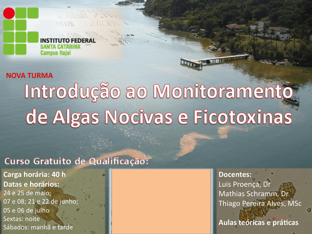 Introdução as Algas nocivas Luis Antonio de Oliveira Proença Mathias Alberto Schramm Thiago Pereira Alves Literatura As algas e sua importância “Serviços ao ambiente” “Serviços ao homem" • História da terra • Metabolismo do planeta • Ciclos dos gases e nutrientes • Cadeia trófica • Etc.. • • • • • • Alimentos Cosméticos Químicos Fármacos Biocombustíveis Suplementos alimentares • Alimento • Etc.. English: Under certain conditions, en:Emiliania huxleyi can form massive blooms which can be detected by satellite remote sensing. What looks like white clouds in the water, is in fact the reflected light from billions of coccoliths floating in the water-column. en:Landsat image from 24th July en:1999, courtesy of Steve Groom, en:Plymouth Marine Laboratory. This bloom attracted considerable coverage in the UK media. Emiliania huxleyi. Illustration by: Glynn Gorick. O que são as algas? • O que chamamos de algas inclui organismos de um grupo muito diverso e não não natural. Atualmente as ideias sobre a filogenia e evolução das algas são baseadas em uma combinação de dados ultraestruturais, bioquímicos e moleculares. Depois da descoberta de que cloroplastos das algas eucarióticas surgiram a partir de um ou mais eventos de simbióticos, o termo é agora usado como um termo coloquial, para plantas primitivas, incluindo organismos tanto procarióticas como eucarióticas (Moestrup 2006). O que são algas? Lineu agrupou os vegetais que não tinham órgãos reprodutivos, como flores e sementes, em uma classe chamada Criptogamia. O termo alga se encontra entre aqueles que não tem sustentação na classificação natural. van den Hoek et all 1995 Porém, as vezes é necessário o uso de uma definição, como por exemplo para efeitos legais de proteção ou controle. Nesse caso, poderia ser utilizada uma definição funcional. Uma definição funcional: As algas são organismos autotróficos, base da cadeia trófica aquática, que não possuem estruturas complexas de reprodução, em geral não possuem tecidos tão diferenciados como plantas terrestres (ex: xilema floema) e que vivem, na maior parte, no ambiente aquático. Algumas algas não são autotróficas! Figure 1. Phylogenetic tree, illustrating present ideas on the relationships between algal and other groups of protists. Six main branches (‘kingdoms’) have been drawn to radiate from approximately the same point, indicating that the branches appeared at approximately the same time during the history of the Earth. (After Simpson and Roger (2004). Do ponto de vista de seu tamanho, as algas podem ser agrupadas em Macroalgas e Microalgas Macroalgas Microalgas Embora algumas macroalgas possam ser consideradas nocivas, o foco desse curso esta nas microalgas • Relembrando o ambiente aquático As Microalgas • As microalgas estão presentes nos ambientes bentônicos, como no ambiente planctônico. • Quanto ao hábito de vida, as microalgas podem ser agrupadas em: fitobentos, fitoplâncton e ticoplâncton, • Algumas vivem em exclusividade em um ou outro ambiente, outras transitam entre os dois. A maior parte das algas nocivas, como definida adiante, são do fitoplâncton • O fitoplâncton é formado por microalgas adaptadas a vida tridimensional na coluna de água e que apresentam mobilidade restrita. • As águas vivas, por exemplo estão incluídas no zooplâncton (animais). No zooplâncton estão diversos grupos de animais, como protozoários, crustáceos, moluscos, cnidários, anelídeos e outros. Ainda quanto ao tamanho do plâncton • Ainda existem o bacterioplâncton (bactérias) e virioplâncton (virus) e outros. • Esta classificação considera a o grupo de organismos. Uma outra, considera o tamanho, e os classifica em: • • • • • • • fentoplâncton (0,02-0,2 µm), picoplâncton (0,2 - 2 µm), nanoplâncton (2,0 - 20 µm), microplâncton (20 - 200 µm), mesoplâncton (0,2 - 20 mm), macroplâncton (2 - 20 cm), megaplâncton (20 - 200 cm). • (um micrômetro - µm é igual a 0,001 mm um fio de cabelo tem em média 70µm ). Grupos de microalgas • São vários os grupos de microalgas presentes tanto no ambiente epicontinental, como no ambiente marinho: • Praticamente todas as classes, desde das relativamente simples cianobactérias até os complexos dinoflagelados. • Do ponto de vista funcional, inclusive alguns ciliados se comportam como algas. Grupos de microalgas Algas Nocivas..... • O conceito nocivo é relativo. Ele se aplica sob o ponto de vista cultural humano. • no.ci.vo adj (lat nocivu) 1 Que causa dano. 2 Pernicioso, prejudicial. Antôn: útil, vantajoso. Algas nocivas x marés vermelhas • Em certas circunstâncias, em condições favoráveis, pode ocorrer uma grande proliferação de microalgas. A abudância de células é tanta, que a água toma a cor dos organismos. Os dinoflagelados possuem, além da clorofila, também um pigmento fotossintético avermelhado chamado de peridinina. Assim, na presença de um grande número de dinoflagelados uma água azul pode se tornar vermelha. • O evento foi chamado de maré vermelha (do inglês: red tides, espanhol: marea roja francês marée rouge). Algumas espécies de dinoflagelados produzem toxinas ou substâncias nocivas a organimos marinhos ou até mesmo ao homem. Dessa forma, há uma associação entre a corrência de uma doloração da água e eventos nocivos, como por exemplos uma grande mortandade de peixes. As florações ocorrem sob certas condições ambientais A partir de uns poucos indivíduos, uma alta taxa de multiplicação associada a diminuição das perdas, a abundância pode ser tal que causa coloração na água. Florações de organismos relativamente pequenos, como por exemplo a rafidofita Heterosigma akashiwo, se caracterizam com contagens por volta de 1 x 106 células por litro de água. Mandala de Margalef Do ponto de vista cultural humano, as algas podem ser nocivas: • A sa