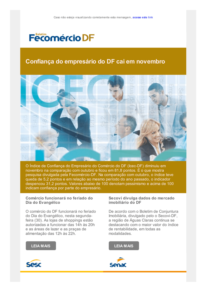 Caso não esteja visualizando corretamente esta mensagem, acesse este link Confiança do empresário do DF cai em novembro O Índice de Confiança do Empresário do Comércio do DF (Icec-DF) diminuiu em novembro na comparação com outubro e ficou em 81,8 pontos. É o que mostra pesquisa divulgada pela Fecomércio-DF. Na comparação com outubro, o índice teve queda de 5,2 pontos e em relação ao mesmo período do ano passado, o indicador despencou 31,2 pontos. Valores abaixo de 100 denotam pessimismo e acima de 100 indicam confiança por parte do empresário. Comércio funcionará no feriado do Dia do Evangélico Secovi divulga dados do mercado imobiliário do DF O comércio do DF funcionará no feriado do Dia do Evangélico, nesta segundafeira (30). As lojas de shoppings estão autorizadas a funcionar das 14h às 20h e as áreas de lazer e as praças de alimentação das 12h às 22h. De acordo com o Boletim de Conjuntura Imobiliária, divulgado pelo o Secovi-DF, a região de Águas Claras continua se destacando com o maior valor do índice de rentabilidade, em todas as modalidades. LEIA MAIS LEIA MAIS Sesc e embaixada do México levam homens pássaro para Estádio Nacional Senac divulga vencedores do Prêmio Excelência Os Voadores de Papantla, conhecidos também como “homens pássaro”, se apresentarão pela primeira vez no Distrito Federal neste sábado (28), no estádio Mané Garrincha. A entrada custa R$ 10 (inteira) e R$ 5 (meia). O Senac premiou os alunos que tiveram o melhor desempenho na competição por ocupação e a unidade que se destacou nas propostas de integração da 2ª Edição do Projeto Educacional Prêmio Excelência Senac-DF. LEIA MAIS LEIA MAIS Inform ativo produzido pela Assessoria de Com unicação e Marketing do Sistem a Fecom ércio DF Coordenador de Com unicação: Diego Recena | Edição: Daniel Alcântara, Diego Recena e Fabíola Souza | Redação: Andréa Ventura, Daniel Alcântara, Fabíola Souza, Luciana Corrêa, Liliam Rezende, Sacha Bourdette e Silvia Melo. Fotografia: Raphael Carmona e Joel Rodrigues Contatos: 61 3038-7527 | [email protected] Não quer mais receber nossos emails? Descadastre-se Compartilhe nas redes sociais: