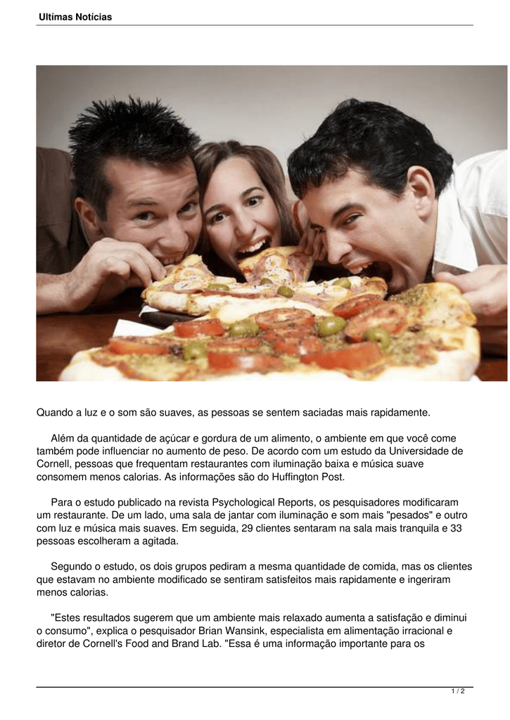 Ultímas Notícias Quando a luz e o som são suaves, as pessoas se sentem saciadas mais rapidamente. Além da quantidade de açúcar e gordura de um alimento, o ambiente em que você come também pode influenciar no aumento de peso. De acordo com um estudo da Universidade de Cornell, pessoas que frequentam restaurantes com iluminação baixa e música suave consomem menos calorias. As informações são do Huffington Post. Para o estudo publicado na revista Psychological Reports, os pesquisadores modificaram um restaurante. De um lado, uma sala de jantar com iluminação e som mais "pesados" e outro com luz e música mais suaves. Em seguida, 29 clientes sentaram na sala mais tranquila e 33 pessoas escolheram a agitada. Segundo o estudo, os dois grupos pediram a mesma quantidade de comida, mas os clientes que estavam no ambiente modificado se sentiram satisfeitos mais rapidamente e ingeriram menos calorias. "Estes resultados sugerem que um ambiente mais relaxado aumenta a satisfação e diminui o consumo", explica o pesquisador Brian Wansink, especialista em alimentação irracional e diretor de Cornell's Food and Brand Lab. "Essa é uma informação importante para os 1/2 Ultímas Notícias restaurantes de fast food, que são muitas vezes acusados de contribuir para a obesidade: fazer mudanças simples pode ser um caminho para reduzir excessos - e aumentar a satisfação de seus clientes ao mesmo tempo". 2/2