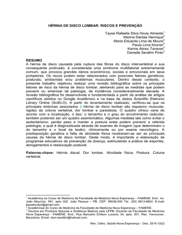 HÉRNIA DE DISCO LOMBAR: RISCOS E PREVENÇÃO Taysa Rafaella Silva Houly Almeida1 Marina Dantas Henrique2 Maria Eduarda Lima de Moura2 Paula Lima Kirzner2 Karine Abreu Tavares2 Danielle Serafim Pinto3 RESUMO A hérnia de disco causada pela ruptura das fibras do disco intervertebral e sua consequente protrusão, é considerada uma síndrome multifatorial extremamente comum, que provoca grandes danos econômicos, sociais e emocionais em seus portadores. Os riscos podem estar relacionados com possíveis fatores genéticos, posturais, ambientais e/ou problemas musculares. Dentro desse contexto, o presente trabalho objetivou realizar uma revisão bibliográfica sobre os principais fatores de risco da hérnia de disco lombar, alertando para as medidas que podem prevenir ou amenizar tal patologia, de incidência consideravelmente elevada. A revisão bibliográfica foi desenvolvida e fundamentada a partir da análise de artigos científicos obtidos no Google Acadêmico e na base de dados Scientific Eletronic Library Online (SciELO). A partir do levantamento realizado, verificou-se que os principais sintomas associados à hérnia de disco lombar são espasmo muscular, rigidez da coluna vertebral, dor lombar e parestesia. O quadro clínico varia de acordo com a localização, o tipo, o tamanho e o grau do envolvimento radicular, também podendo ser um quadro assintomático. Algumas medidas tais como evitar o sedentarismo, perder peso e manter a postura ereta podem prevenir a referida patologia, a qual é diagnosticada através de exames de imagem (que determinam o do tamanho e o local da lesão), clinicamente ou por exame neurológico. A predisposição genética e falta de atividade física mostraram-se ser as principais causas da hérnia de disco lombar. Deste modo, é importante a elaboração de programas educativos de prevenção da doença, estimulando a prática de esportes, alongamentos e reeducação postural. Palavras-chave: Hérnia discal. Dor lombar. Atividade física. Postura. Coluna vertebral. 1 Acadêmica do Curso de Medicina da Faculdade de Medicina Nova Esperança – FAMENE. End.: Av. João Maurício, 581, apto 402. João Pessoa – PB. CEP: 58038-000 Tel.: (83) 9813-6824. E-mail: [email protected]. 2 Acadêmicas do Curso de Medicina da Faculdade de Medicina Nova Esperança – FAMENE. 3 Doutora em Produtos Naturais e Sintéticos Biativos pela UFPB. Docente da Faculdade de Medicina Nova Esperança - FAMENE. End.: Rua Bancário Enilson Lucena, 34, apto. 201, Res. Vancouver, Bancários. Email: [email protected]. Rev. Ciênc. Saúde Nova Esperança – Dez. 2014;12(2) INTRODUÇÃO A hérnia de disco, patologia bastante frequente nos dias atuais, é causada por uma lesão dos discos que compõem a coluna vertebral. Consiste em uma doença crônico-degenerativa da coluna, sendo atualmente considerada uma síndrome multifatorial com grandes impactos econômicos e emocionais de alta prevalência, podendo afastar indivíduos economicamente ativos de suas atividades sociais e laborais1. No Brasil, as lombalgias têm se tornado a 1ª causa de pagamento de auxíliodoença e a 3ª causa de aposentadoria por invalidez, gerando repercussões sobre a economia2. Vários estudos científicos comprovam que a inatividade física é um fator preocupante para saúde, estando claramente associado com diversos tipos de doenças. No século passado, o sedentarismo progressivo chegou a prevalências extremamente elevadas em todo o mundo. A falta de exercício físico constitui um fator de risco para o aumento da incidência de doenças cardiovasculares, em especial a aterosclerose e a hipertensão arterial, além de também complicar as doenças das articulações, músculos e da coluna vertebral3. Diferentemente de nossos antepassados, que dependiam de suas habilidades psicomotoras para a sobrevivência alimentar, atualmente, alcançam-se tais objetivos através de atitudes que requerem uma capacidade cognitiva bem superior às destrezas motoras primitivas, priorizando, cada vez mais, comportamentos estáticos e sedentários. Basta que observemos os trabalhadores de escritório dos dias de hoje: eles permanecem, em média 6 horas diárias, sentados (com pequenas pausas), numa jornada de 40 horas semanais. Isso significa que, ao final de 35 anos de trabalho, é como se eles estivessem 6 anos ininterruptos sentados sobre uma cadeira, quase que inertes do ponto de vista motor. A permanência constante do indivíduo na posição sentada pode levar a uma semi-retificação da curvatura lombar e, 4 consequentemente, a uma lombalgia . Uma das causas da lombalgia pode ser a hérnia de disco lombar, que se caracteriza pela deformidade do disco intervertebral. Ele tem por função dar mobilidade e amenizar o impacto da força da gravidade a que estamos submetidos permanentemente. O núcleo, sob tensão, pode se deslocar e, até mesmo, romper o anel fibroso5. Sempre que se mantém uma postura inadequada, sobrecarrega-se nossa coluna, fazendo com que os discos intervertebrais sofram cargas anormais. Desta forma, a postura correta consiste em uma forma de prevenção de doenças da coluna vertebral. Diante desse contexto, o presente trabalho objetivou realizar uma revisão bibliográfica sobre os principais fatores de risco da hérnia de disco lombar, alertando para as medidas que podem prevenir ou amenizar tal patologia, de incidência consideravelmente elevada. METODOLOGIA Neste estudo, optou-se por realizar uma revisão bibliográfica sobre os principais fatores de risco da hérnia de disco lombar, bem como suas medidas de prevenção. A revisão bibliográfica foi desenvolvida e fundamentada a partir da análise de artigos científicos, obtidos no Google Acadêmico e na base de dados Scientific Eletronic Library Online (SciELO). Os descritores utilizados durante a pesquisa foram hérnia de Rev. Ciênc. Saúde Nova Esperança – Dez. 2014;12(2) disco, dor lombar, tratamento de hérnia discal, lombalgia, protrus