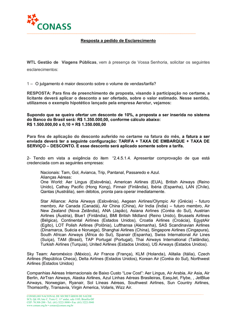 _________________________________________________________________________________________ Resposta a pedido de Esclarecimento WTL Gestão de Viagens Públicas, vem à presença de Vossa Senhoria, solicitar os seguintes esclarecimentos: 1 – O julgamento é maior desconto sobre o volume de vendas/tarifa? RESPOSTA: Para fins de preenchimento de proposta, visando à participação no certame, a licitante deverá aplicar o desconto a ser ofertado, sobre o valor estimado. Nesse sentido, utilizamos o exemplo hipotético lançado pela empresa Aerotur, vejamos: Supondo que se queira ofertar um desconto de 10%, a proposta a ser inserida no sistema do Banco do Brasil será: R$ 1.350.000,00, conforme cálculo abaixo: R$ 1.500.000,00 x 0,10 = R$ 1.350.000,00 Para fins de aplicação do desconto auferido no certame na fatura do mês, a fatura a ser enviada deverá ter a seguinte configuração: TARIFA + TAXA DE EMBARQUE + TAXA DE SERVIÇO – DESCONTO. E esse desconto será aplicado somente sobre a tarifa. 2- Tendo em vista a exigência do item “2.4.5.1.4. Apresentar comprovação de que está credenciada com as seguintes empresas: Nacionais: Tam, Gol, Avianca, Trip, Pantanal, Passaredo e Azul. Alianças Aéreas: One World: Aer Lingus (Eslovênia), American Airlines (EUA), British Airways (Reino Unido), Cathay Pacific (Hong Kong), Finnair (Finlândia), Ibéria (Espanha), LAN (Chile), Qantas (Austrália), sem débitos, pronta para operar imediatamente. Star Alliance: Adria Airways (Eslovênia), Aegean Airlines/Olympic Air (Grécia) - futuro membro, Air Canada (Canadá), Air China (China), Air India (Índia) – futuro membro, Air New Zealand (Nova Zelândia), ANA (Japão), Asiana Airlines (Coréia do Sul), Austrian Airlines (Áustria), Blue1 (Finlândia), BMI British Midland (Reino Unido), Brussels Airlines (Bélgica), Continental Airlines (Estados Unidos), Croatia Airlines (Croácia), EgyptAir (Egito), LOT Polish Airlines (Polônia), Lufthansa (Alemanha), SAS Scandinavian Airlines (Dinamarca, Suécia e Noruega), Shanghai Airlines (China), Singapore Airlines (Cingapura), South African Airways (África do Sul), Spanair (Espanha), Swiss International Air Lines (Suíça), TAM (Brasil), TAP Portugal (Portugal), Thai Airways International (Tailândia), Turkish Airlines (Turquia), United Airlines (Estados Unidos), US Airways (Estados Unidos). Sky Team: Aeroméxico (México), Air France (França), KLM (Holanda), Alitalia (Itália), Czech Airlines (República Checa), Delta Airlines (Estados Unidos), Korean Air (Coréia do Sul), Northwest Airlines (Estados Unidos) Companhias Aéreas Internacionais de Baixo Custo “Low Cost”: Aer Lingus, Air Arabia, Air Asia, Air Berlin, AirTran Airways, Alaska Airlines, Azul Linhas Aéreas Brasileiras, EasyJet, Flybe, , JetBlue Airways, Norwegian, Ryanair, Sol Líneas Aéreas, Southwest Airlines, Sun Country Airlines, Thomsonfly, Transavia, Virgin America, Volaris, Wizz Air. ____________________________________________________________________________________________________________________________________ _ CONSELHO NACIONAL DE SECRETÁRIOS DE SAÚDE SCS, Qd. 09, lote C, Torre C, 11º andar, sala 1105, Brasília-DF CEP: 70.308-200 - Tel.: (61) 3222-3000 • Fax: (61) 3222-3040 www.conass.org.br • [email protected] _________________________________________________________________________________________ 2.4.5.1.5. Apresentar comprovação por meio de declaração que possui no mínimo um terminal interligado com as companhias aéreas citadas no item anterior. Quanto a solicitação acima, será aceito comprovação por agencia consolidadora, conforme acordão TCU? RESPOSTA: A referida comprovação visa exclusivamente garantir que havendo a necessidade de emissão em qualquer das companhias aéreas citadas, a empresa ora contratada, tenha condições de fazê-lo sem qualquer dificuldade. Nesse sentido, desde que seja garantida a emissão, a comprovação pode ser feita mediante apresentação do certificado IATA em conjunto com as declarações da empresa licitante. ____________________________________________________________________________________________________________________________________ _ CONSELHO NACIONAL DE SECRETÁRIOS DE SAÚDE SCS, Qd. 09, lote C, Torre C, 11º andar, sala 1105, Brasília-DF CEP: 70.308-200 - Tel.: (61) 3222-3000 • Fax: (61) 3222-3040 www.conass.org.br • [email protected]