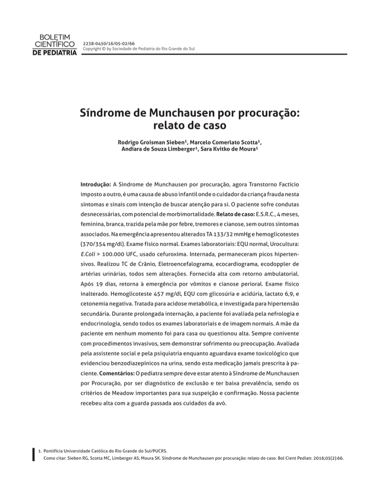 2238-0450/16/05-02/66 Copyright © by Sociedade de Pediatria do Rio Grande do Sul Síndrome de Munchausen por procuração: relato de caso Rodrigo Groisman Sieben1, Marcelo Comerlato Scotta1, Andiara de Souza Limberger1, Sara Kvitko de Moura1 Introdução: A Síndrome de Munchausen por procuração, agora Transtorno Factício imposto a outro, é uma causa de abuso infantil onde o cuidador da criança frauda nesta sintomas e sinais com intenção de buscar atenção para si. O paciente sofre condutas desnecessárias, com potencial de morbimortalidade. Relato de caso: E.S.R.C., 4 meses, feminina, branca, trazida pela mãe por febre, tremores e cianose, sem outros sintomas associados. Na emergência apresentou alterados TA 133/32 mmHg e hemoglicotestes (370/354 mg/dl). Exame físico normal. Exames laboratoriais: EQU normal, Urocultura: E.Coli > 100.000 UFC, usado cefuroxima. Internada, permaneceram picos hipertensivos. Realizou TC de Crânio, Eletroencefalograma, ecocardiograma, ecodoppler de artérias urinárias, todos sem alterações. Fornecida alta com retorno ambulatorial. Após 19 dias, retorna à emergência por vômitos e cianose perioral. Exame físico inalterado. Hemoglicoteste 457 mg/dl, EQU com glicosúria e acidúria, lactato 6,9, e cetonemia negativa. Tratada para acidose metabólica, e investigada para hipertensão secundária. Durante prolongada internação, a paciente foi avaliada pela nefrologia e endocrinologia, sendo todos os exames laboratoriais e de imagem normais. A mãe da paciente em nenhum momento foi para casa ou questionou alta. Sempre conivente com procedimentos invasivos, sem demonstrar sofrimento ou preocupação. Avaliada pela assistente social e pela psiquiatria enquanto aguardava exame toxicológico que evidenciou benzodiazepínicos na urina, sendo esta medicação jamais prescrita à paciente. Comentários: O pediatra sempre deve estar atento à Síndrome de Munchausen por Procuração, por ser diagnóstico de exclusão e ter baixa prevalência, sendo os critérios de Meadow importantes para sua suspeição e confirmação. Nossa paciente recebeu alta com a guarda passada aos cuidados da avó. 1. Pontifícia Universidade Católica do Rio Grande do Sul/PUCRS. Como citar: Sieben RG, Scotta MC, Limberger AS, Moura SK. Síndrome de Munchausen por procuração: relato de caso. Bol Cient Pediatr. 2016;05(2):66.