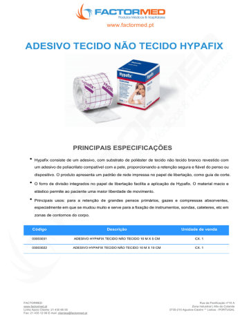 www.factormed.pt ADESIVO TECIDO NÃO TECIDO HYPAFIX PRINCIPAIS ESPECIFICAÇÕES Hypafix consiste de um adesivo, com substrato de poliéster de tecido não tecido branco revestido com um adesivo de poliacrilato compatível com a pele, proporcionando a retenção segura e fiável do penso ou dispositivo. O produto apresenta um padrão de rede impressa no papel de libertação, como guia de corte. O forro de divisão integrados no papel de libertação facilita a aplicação de Hypafix. O material macio e elástico permite ao paciente uma maior liberdade de movimento. Principais usos: para a retenção de grandes pensos primários, gazes e compressas absorventes, especialmente em que se mudou muito e serve para a fixação de instrumentos, sondas, cateteres, etc em zonas de contornos do corpo. Código Descrição Unidade de venda 03003031 ADESIVO HYPAFIX TECIDO NÃO TECIDO 10 M X 5 CM CX. 1 03003022 ADESIVO HYPAFIX TECIDO NÃO TECIDO 10 M X 10 CM CX. 1 FACTORMED www.factormed.pt Linha Apoio Cliente: 21 435 66 00 Fax: 21 435 12 08 E-mail: [email protected] Rua da Panificação nº10 A Zona Industrial | Alto do Colaride 2735-210 Agualva-Cacém ** Lisboa - PORTUGAL
