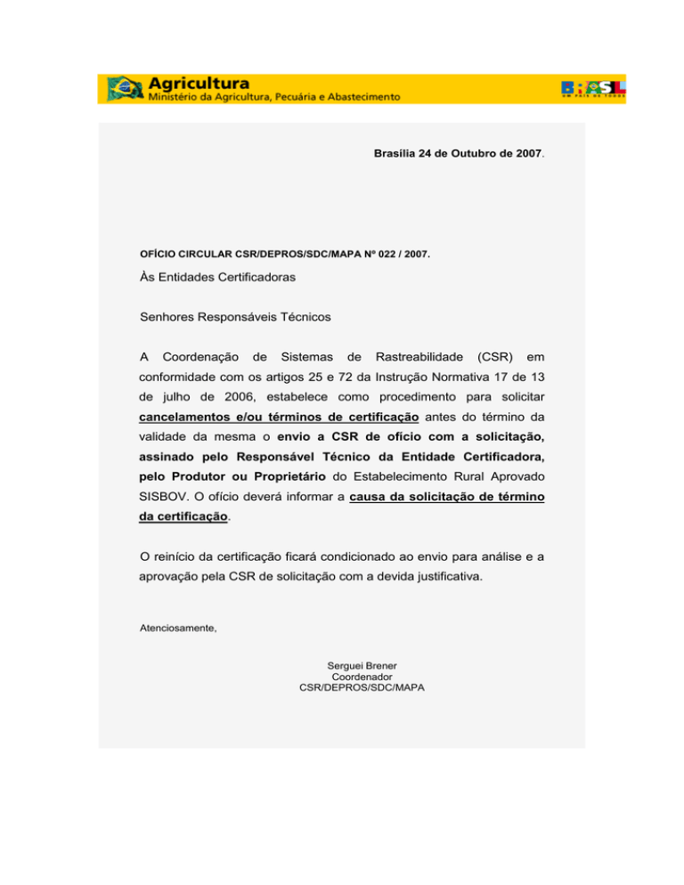 Brasília 24 de Outubro de 2007. OFÍCIO CIRCULAR CSR/DEPROS/SDC/MAPA Nº 022 / 2007. Às Entidades Certificadoras Senhores Responsáveis Técnicos A Coordenação de Sistemas de Rastreabilidade (CSR) em conformidade com os artigos 25 e 72 da Instrução Normativa 17 de 13 de julho de 2006, estabelece como procedimento para solicitar cancelamentos e/ou términos de certificação antes do término da validade da mesma o envio a CSR de ofício com a solicitação, assinado pelo Responsável Técnico da Entidade Certificadora, pelo Produtor ou Proprietário do Estabelecimento Rural Aprovado SISBOV. O ofício deverá informar a causa da solicitação de término da certificação. O reinício da certificação ficará condicionado ao envio para análise e a aprovação pela CSR de solicitação com a devida justificativa. Atenciosamente, Serguei Brener Coordenador CSR/DEPROS/SDC/MAPA