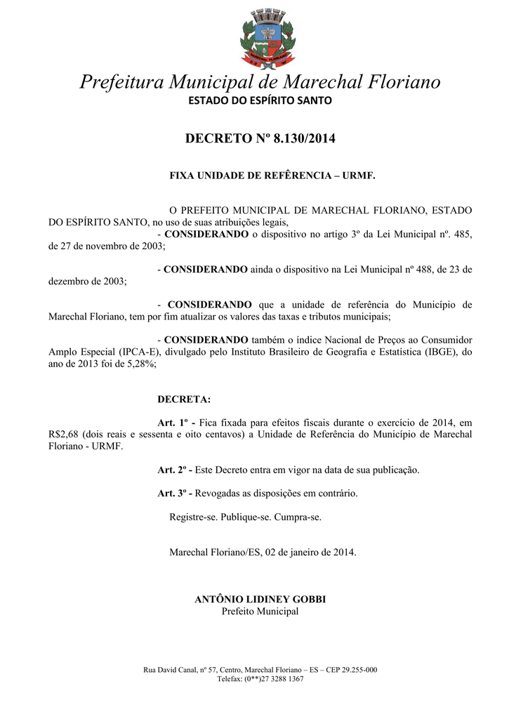 Prefeitura Municipal de Marechal Floriano ESTADO DO ESPÍRITO SANTO DECRETO Nº 8.130/2014 FIXA UNIDADE DE REFÊRENCIA – URMF. O PREFEITO MUNICIPAL DE MARECHAL FLORIANO, ESTADO DO ESPÍRITO SANTO, no uso de suas atribuições legais, - CONSIDERANDO o dispositivo no artigo 3º da Lei Municipal nº. 485, de 27 de novembro de 2003; - CONSIDERANDO ainda o dispositivo na Lei Municipal nº 488, de 23 de dezembro de 2003; - CONSIDERANDO que a unidade de referência do Município de Marechal Floriano, tem por fim atualizar os valores das taxas e tributos municipais; - CONSIDERANDO também o índice Nacional de Preços ao Consumidor Amplo Especial (IPCA-E), divulgado pelo Instituto Brasileiro de Geografia e Estatística (IBGE), do ano de 2013 foi de 5,28%; DECRETA: Art. 1º - Fica fixada para efeitos fiscais durante o exercício de 2014, em R$2,68 (dois reais e sessenta e oito centavos) a Unidade de Referência do Município de Marechal Floriano - URMF. Art. 2º - Este Decreto entra em vigor na data de sua publicação. Art. 3º - Revogadas as disposições em contrário. Registre-se. Publique-se. Cumpra-se. Marechal Floriano/ES, 02 de janeiro de 2014. ANTÔNIO LIDINEY GOBBI Prefeito Municipal Rua David Canal, nº 57, Centro, Marechal Floriano – ES – CEP 29.255-000 Telefax: (0**)27 3288 1367