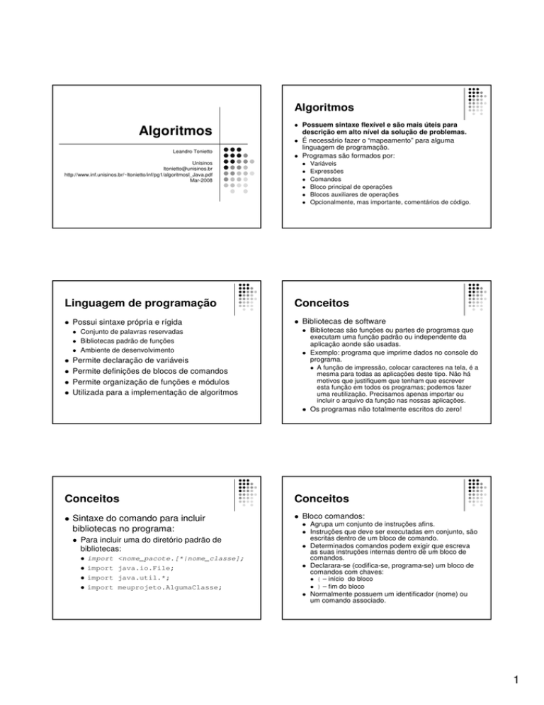 Algoritmos Algoritmos Leandro Tonietto Unisinos [email protected] http://www.inf.unisinos.br/~ltonietto/inf/pg1/algoritmosI_Java.pdf Mar-2008 Possuem sintaxe flexível e são mais úteis para descrição em alto nível da solução de problemas. É necessário fazer o “mapeamento” para alguma linguagem de programação. Programas são formados por: Linguagem de programação Possui sintaxe própria e rígida Conceitos Conjunto de palavras reservadas Bibliotecas padrão de funções Ambiente de desenvolvimento Bibliotecas de software Permite declaração de variáveis Permite definições de blocos de comandos Permite organização de funções e módulos Utilizada para a implementação de algoritmos Conceitos Sintaxe do comando para incluir bibliotecas no programa: Para incluir uma do diretório padrão de bibliotecas: import import import import <nome_pacote.[*|nome_classe]; java.io.File; java.util.*; meuprojeto.AlgumaClasse; Variáveis Expressões Comandos Bloco principal de operações Blocos auxiliares de operações Opcionalmente, mas importante, comentários de código. Bibliotecas são funções ou partes de programas que executam uma função padrão ou independente da aplicação aonde são usadas. Exemplo: programa que imprime dados no console do programa. A função de impressão, colocar caracteres na tela, é a mesma para todas as aplicações deste tipo. Não há motivos que justifiquem que tenham que escrever esta função em todos os programas; podemos fazer uma reutilização. Precisamos apenas importar ou incluir o arquivo da função nas nossas aplicações. Os programas não totalmente escritos do zero! Conceitos Bloco comandos: Agrupa um conjunto de instruções afins. Instruções que deve ser executadas em conjunto, são escritas dentro de um bloco de comando. Determinados comandos podem exigir que escreva as suas instruções internas dentro de um bloco de comandos. Declarara-se (codifica-se, programa-se) um bloco de comandos com chaves: { – início do bloco } – fim do bloco Normalmente possuem um identificador (nome) ou um comando associado. 1 Conceitos Bloco comandos: Conceitos Sintaxe para blocos de instruções: <tipo> <nome> ([<parâmetros>]) { <comandos...> } Bloco comandos principal: Sintaxe para blocos instruções para comandos: <comando> (<expressão>) { <comandos,...> public static void main(String args[]){ <comandos,...> } } Veremos mais sobre blocos auxiliares e comandos mais adiante. Por enquanto, isto é o suficiente... Conceitos Comentários: Comentários: Documentar o programa. Para explicar algum trecho importante do algoritmo. Para colocar meta-informações. Exemplos: /** Esta classe realiza um operação * matemática... * @autor Fulano de tal * @version 01/04/2008 */ Dois tipos: Conceitos Servem para: É por onde começa a execução do algoritmo ou programa. É obrigatório. O compilador precisa saber por onde começar... Em Java, deve-se declarar um bloco chamado main: // - comentário de linha /* <informações> */ - comentário de bloco /** <comentários e tags> */ - comentário Javadoc /* Trecho de código abaixo... */ // a linha abaixo calcula a média dos valores Conceitos Conceitos Dados: São informações sobre determinados objetos, campos ou atributos. Tipos de dados: Numéricos: Inteiros: int, long, short e byte Ponto-flutuante: double, float (diferencia do double pela letra f após o número). Texto: char: um único caracter. Deve ser informado entre aspas simples (‘ ’). Cadeia de caracteres (strings): deve ser informado entre aspas duplas (“ ”). Classe String. Em Java, classe String é um tipo especial de classe, que pode ser usado também como tipo de dado. Booleano boolean: representa um estado binário. 1 ou 0, ligado ou desligado. Deve-se informar true ou false. Variáveis: São posições de memória que guardam valores e podem ser referenciadas ao longo do programa. Representam os dados do programa. Conteúdo não constante, permitem alterações. São utilizadas com algum tipo de dado associado. Para se usar um dado (uma variável) deve-se declará-las antes de ser usada. Por exemplo: se é necessário solicitar que o usuário digite o seu CPF para fazer alguma busca, então é necessário antes declarar uma variável que comporte esta informação. 2 Conceitos Conceitos Variáveis: Sintaxe para declaração em C/C++: <tipo> <nome> [ = <inicialização>]; int idade = 32; long cpf; float angulo = 45.0f; double total = 0.0; double media = total / numPessoas; char opcao = ‘A’; String nome = “Fulano de Tal”; String endereco = “Rua XYZ, 123”; boolean achouRegistro = false; Conceitos As declarações abaixo são válidas? int nome; E quais delas são boolean angulo = 45.0f; válidas de acordo com a double media = 1; lógica de programação? char idade = ‘8’; String cpf = “123.981.329-36”; Testar no ambiente de desenvolvimento... Erros de sintaxe o compilador avisa Erros de lógica só testando o programa mesmo!! Necessita maior cuidado na declaração. Decidir isto na etapa de pensar na solução = algoritmo. Conceitos – Exemplo 1 Comentários Escopo da variável: Variáveis: Um bloco de comandos define o escopo das variáveis declaradas dentro dele. Portanto, a “vida útil” ou a validade de uma variável está dependente do bloco em que foi declarada. Isto será revisto na aula sobre memória e ponteiros. /* Este baita programa executa duas tarefas: 1) Aloca dados para descrever uma pessoa. 2) Imprime os dados do vivente. Inclusão de bibliotecas */ import java.util.Datel // inclusão bibliotecas auxiliares, veremos mais tarde... public static void main(String args[]){ // declaração; dados do vivente ; int idade = 32; ; char sexo = ‘M’; Bloco principal do programa String nome = “Fulano de Tal”; ; // impressão dos dados ; System.out.println(“Dados ;do vivente:”); System.out.println(“Nome: ” + nome); ; System.out.println(“ – Idade: ” + idade); System.out.printl