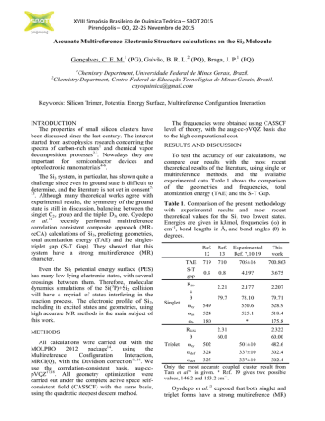 XVIII Simpósio Brasileiro de Química Teórica – SBQT 2015 Pirenópolis – GO, 22-25 Novembro de 2015 Accurate Multireference Electronic Structure calculations on the Si3 Molecule Gonçalves, C. E. M.1 (PG), Galvão, B. R. L.2 (PQ), Braga, J. P.1 (PQ) 1 Chemistry Department, Universidade Federal de Minas Gerais, Brazil. Chemistry Department, Centro Federal de Educação Tecnológica de Minas Gerais, Brazil. [email protected] 2 Keywords: Silicon Trimer, Potential Energy Surface, Multireference Configuration Interaction INTRODUCTION The properties of small silicon clusters have been discussed since the last century. The interest started from astrophysics research concerning the spectra of carbon-rich stars1 and chemical vapor decomposition processes2,3. Nowadays they are important for semiconductor devices and optoelectronic nanomaterials4-6. The Si3 system, in particular, has shown quite a challenge since even its ground state is difficult to determine, and the literature is not yet in consent713 . Although many theoretical works agree with experimental results, the symmetry of the ground state is still in discussion, balancing between the singlet C2v group and the triplet D3h one. Oyedepo et al.13 recently performed multireference correlation consistent composite approach (MRccCA) calculations of Si3, predicting geometries, total atomization energy (TAE) and the singlettriplet gap (S-T Gap). They showed that this system have a strong multireference (MR) character. Even the Si2 potential energy surface (PES) has many low lying electronic states, with several crossings between them. Therefore, molecular dynamics simulations of the Si(3P)+Si2 collision will have a myriad of states interfering in the reaction process. The electronic profile of Si3, including its excited states and geometries, using high accurate MR methods is the main subject of this work. The frequencies were obtained using CASSCF level of theory, with the aug-cc-pVQZ basis due to the high computational cost. RESULTS AND DISCUSSION To test the accuracy of our calculations, we compare our results with the most recent theoretical results of the literature, using single or multireference methods, and the available experimental data. Table 1 shows the comparison of the geometries and frequencies, total atomization energy (TAE) and the S-T Gap. Table 1. Comparison of the present methodology with experimental results and most recent theoretical values for the Si3 two lowest states. Energies are given in kJ/mol, frequencies (ω) in cm−1, bond lengths in Å, and bond angles (θ) in degrees. Ref. 13 Experimental Ref. 7,10,19 This work TAE 719 710 705±16 700.863 S-T gap 0.8 0.8 4.19? 3.675 2.21 2.177 2.207 79.7 78.10 79.71 RSiSi θ Singlet METHODS All calculations were carried out with the MOLPRO 2012 package14, using the Multireference Configuration Interaction, MRCI(Q), with the Davidson correction15,16. We use the correlation-consistent basis, aug-ccpVQZ17,18. All geometry optimization were carried out under the complete active space selfconsistent field (CASSCF) with the same basis, using the quadratic steepest descent method. Ref. 12 Triplet ωsy 549 550.6 528.9 ωas 524 525.1 518.4 ωb 180 * 175.8 RSiSi 2.31 2.322 θ 60.0 60.00 ωsy 502 501±10 482.6 ωdef 324 337±10 302.4 ωdef 325 337±10 302.4 Only the most accurate coupled cluster result from Tam et al12 is given. * Ref. 19 gives two possible values, 146.2 and 153.2 cm−1. Oyedepo et al.13 exposed that both singlet and triplet forms have a strong multirefrence (MR) XVIII Simpósio Brasileiro de Química Teórica – SBQT 2015 Pirenópolis – GO, 22-25 Novembro de 2015 character. A system with strong MR effects shows a (the magnitude of the SCF configurations to the CASSCF wave functions) value less than 0.90 while the T1 and D1 diagnostics20-22 are larger than the generally accepted cutoff of 0.02 and 0.05. The Si3 singlet state parameters are , T1 = 0.032 and D1 = 0.082, therefore not properly described by a single-reference method by any of those criterion. The triplet state with , T1 = 0.031 and D1 = 0.082 also fails the tests. Tam et al.12 most accurate calculations used single reference coupled cluster with the large aug-cc-pVXZ basis expanded with tight dfunctions, extrapolated to the complete basis set limit (CBS), including scalar relativistic, corevalence and spin-orbit corrections. Their best result for TAE (719 kJ/mol) deviates from the experimental value more than Oyedepo et al.13 (710 kJ/mol), probably because of the strong MR character of this molecule. We made, instead of MR composite approach of Oyedepo et al.13, full MRCI(Q) calculations, with the large aug-cc-pVQZ basis. Our result, 700.863 kJ/mol, considering the zero point energy (ZPE), is closer to the experiment than Oyedepo’s. All our geometries are in excellent agreement with experiments, but our frequencies were systematically below experimental values, probably due to the lower level of theory in the calculations. If the interest is to study the collisions that lead to Si3, there will be a myriad of electronic states involved. The Si2 molecule has two nearly degenerate states, 3Πu and 3Σg-, and they alternate for the ground state with the distance. Figure 1 shows the PES of the Si2 molecule, including some low-lying excited states that may not be accessible under normal circumstances, but are still below the dissociation limit. Exploring a “T shaped” profile of the system, in which a silicon atom approaches the Si2 molecule perpendicular to the bond axis and in its center-of-mass, one can have a preliminary insight of the collision reaction. Figure 2 shows the PES for singlet and triplet two-state calculations in C2v symmetry for each wave function A1, B1, B2 and A2. The Si2 bond distance is fixed at its equilibrium value of 2.17 Å. It can be seen several attractive states that will lead to a barrierless collision, and all of them are important to the cross sections and rate cons