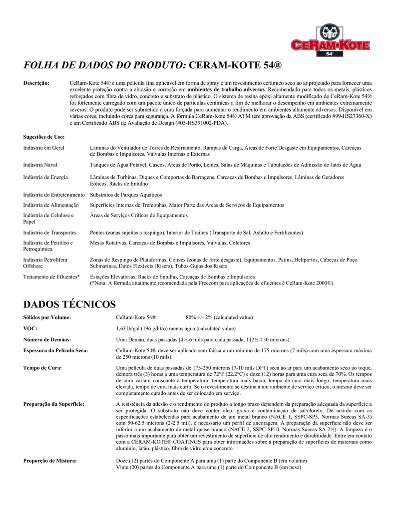 FOLHA DE DADOS DO PRODUTO: CERAM-KOTE 54® Descrição: CeRam-Kote 54® é uma película fina aplicável em forma de spray e um revestimento cerâmico seco ao ar projetado para fornecer uma excelente proteção contra a abrasão e corrosão em ambientes de trabalho adversos. Recomendado para todos os metais, plásticos reforçados com fibra de vidro, concreto e substrato de plástico. O sistema de resina epóxi altamente modificado de CeRam-Kote 54® foi fortemente carregado com um pacote único de partículas cerâmicas a fim de melhorar o desempenho em ambientes extremamente severos. O produto pode ser submetido a cura forçada para aumentar o rendimento em ambientes altamente adversos. Disponível em várias cores, incluindo cores para segurança. A fórmula CeRam-Kote 54® ATM tem aprovação da ABS (certificado #99-HS27360-X) e um Certificado ABS de Avaliação de Design (#03-HS391002-PDA). Sugestões de Uso: Indústria em Geral Lâminas do Ventilador de Torres de Resfriamento, Rampas de Carga, Áreas de Forte Desgaste em Equipamentos, Carcaças de Bombas e Impulsores, Válvulas Internas e Externas Indústria Naval Tanques de Água Potável, Cascos, Áreas de Porão, Lemes, Salas de Máquinas e Tubulações de Admissão de Jatos de Água Indústria de Energia Lâminas de Turbinas, Diques e Comportas de Barragens, Carcaças de Bombas e Impulsores, Lâminas de Geradores Eólicos, Racks de Entulho Indústria do Entretenimento Substratos de Parques Aquáticos Indústria de Alimentação Superfícies Internas de Tremonhas, Maior Parte das Áreas de Serviços de Equipamentos Indústria de Celulose e Papel Áreas de Serviços Críticos de Equipamentos Indústria de Transportes Pontes (zonas sujeitas a respingo), Interior de Trailers (Transporte de Sal, Asfalto e Fertilizantes) Indústria de Petróleo e Petroquímica Mesas Rotativas, Carcaças de Bombas e Impulsores, Válvulas, Coletores Indústria Petrolífera Offshore Zonas de Respingo de Plataformas, Convés (zonas de forte desgaste), Equipamentos, Patins, Heliportos, Cabeças de Poço Submarinas, Dutos Flexíveis (Risers), Tubos-Guias dos Risers Tratamento de Efluentes* Estações Elevatórias, Racks de Entulho, Carcaças de Bombas e Impulsores (*Nota: A fórmula atualmente recomendada pela Freecom para aplicações de efluentes é CeRam-Kote 2000®). DADOS TÉCNICOS Sólidos por Volume: CeRam-Kote 54® 80% +/- 2% (calculated value) VOC: 1,63 lb/gal (196 g/litro) menos água (calculated value) Número de Demãos: Uma Demão, duas passadas (4½-6 mils para cada passada, 112½-150 mícrons) Espessura da Película Seca: CeRam-Kote 54® deve ser aplicado sem faísca a um mínimo de 175 mícrons (7 mils) com uma espessura máxima de 250 mícrons (10 mils). Tempo de Cura: Uma película de duas passadas de 175-250 mícrons (7-10 mils DFT) seca ao ar para um acabamento seco ao toque, demora três (3) horas a uma temperatura de 72°F (22.2°C) e doze (12) horas para uma cura seca de 70%. Os tempos de cura variam consoante a temperatura: temperatura mais baixa, tempo de cura mais longo; temperatura mais elevada, tempo de cura mais curto. Se o revestimento se destina a um ambiente de serviço crítico, o mesmo deve ser completamente curado antes de ser colocado em serviço. Preparação da Superfície: A resistência da adesão e o rendimento do produto a longo prazo dependem da preparação adequada da superfície a ser protegida. O substrato não deve conter óleo, graxa e contaminação de sal/cloreto. De acordo com as especificações estabelecidas para acabamento de um metal branco (NACE 1, SSPC-SP5, Normas Suecas SA-3) com 50-62.5 mícrons (2-2.5 mil), é necessário um perfil de ancoragem. A preparação da superfície não deve ser inferior a um acabamento de metal quase branco (NACE 2, SSPC-SP10, Normas Suecas SA 2½). A limpeza é o passo mais importante para obter um revestimento de superfície de alto rendimento e durabilidade. Entre em contato com a CERAM-KOTE® COATINGS para obter informações sobre a preparação de superfícies de materiais como alumínio, latão, plástico, fibra de vidro e/ou concreto. Proporção de Mistura: Doze (12) partes do Componente A para uma (1) parte do Componente B (em volume) Vinte (20) partes do Componente A para uma (1) parte do Componente B (em peso) Mistura: CeRam-Kote 54® contém uma elevada carga de partículas cerâmicas que devem ser colocadas em total suspensão com a resina epóxi antes da aplicação. CeRam-Kote 54® está embalado em duas latas: Componente A (resina e partículas cerâmicas) e Componente B (agente de cura). Agite o Componente A (revestimento) com um agitador de ar ciclônico ou misture o Componente A com um misturador planetário até todos os pós cerâmicos estarem suspensos na resina. O tempo necessário para colocar as partículas cerâmicas em suspensão depende da temperatura e do tempo de armazenagem do material. Geralmente, a uma temperatura de 72°F (22.2°C) basta agitar entre quatro (4) e seis (6) minutos para as partículas cerâmicas ficarem em suspensão. Independentemente do tempo necessário, agite o material cerâmico em suspensão antes de prosseguir. A mistura incorreta impedirá o rendimento ou a cura adequada do CeRam-Kote 54®. Verifique a lata para certificar-se que todas as partículas sólidas estejam em suspensão antes de prosseguir para a fase de mistura. Misture o Componente A (revestimento) e o Componente B (agente de cura) e agite até ambos os componentes estarem bem misturados (ao misturar somente latas de um quarto de litro ou meio litro, verta o Componente A no Componente B. Use este procedimento somente para latas de um quarto de litro ou meio litro devido à pequena quantidade de agente de cura presente na lata do Componente B). O tempo de agitação depende da temperatura, mas uma agitação de dois (2) a quatro (4) minutos, a uma temperatura de 72°F (22.2°C) deve ser suficiente para misturar completamente os componentes. Não é n