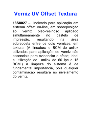 Verniz UV Offset Textura 18S8027 – Indicado para aplicação em sistema offset on-line, em sobreposição ao verniz óleo-resinoso aplicado simultaneamente no castelo de impressão, resultando na área sobreposta entre os dois vernizes, em textura. (A lineatura e BCM do anilox utilizados para aplicação do verniz são essenciais para evidenciar o efeito; Ideal a utilização de anilox de 60 lpc e 15 BCM.) A limpeza do sistema é de fundamental importância, pois qualquer contaminação resultará no nivelamento do verniz.
