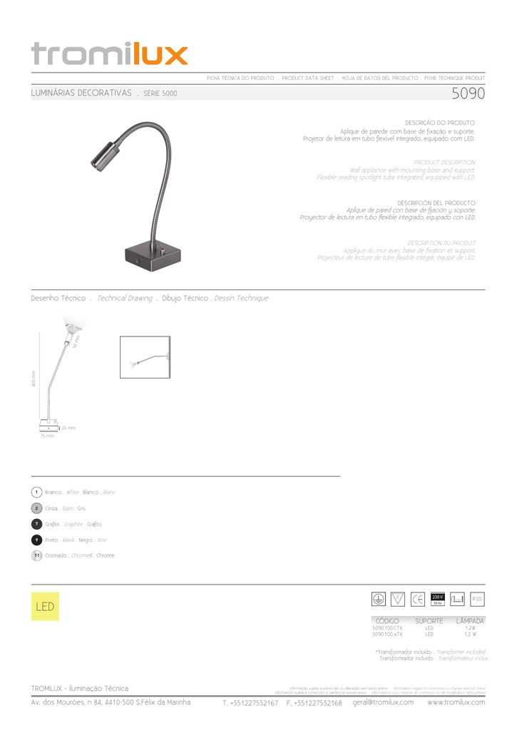 FICHA TÉCNICA DO PRODUTO . PRODUCT DATA SHEET . HOJA DE DATOS DEL PRODUCTO . FICHE TECHNIQUE PRODUIT LUMINÁRIAS DECORATIVAS . 5090 SÉRIE 5000 DESCRIÇÃO DO PRODUTO Aplique de parede com base de fixação e suporte. Projetor de leitura em tubo flexível integrado, equipado com LED. PRODUCT DESCRIPTION Wall appliance with mounting base and support. Flexible reading spotlight tube integrated, equipped with LED. DESCRIPCIÓN DEL PRODUCTO Aplique de pared con base de fijación y soporte. Proyector de lectura en tubo flexible integrado, equipado con LED. DESCRIPTION DU PRODUIT Applique du mur avec base de fixation et support. Projecteur de lecture de tube flexible intégré, équipé de LED. Desenho Técnico . Technical Drawing . Dibujo Técnico . Dessin Technique 25 m m 400 mm 50 m m O 23 mm 75 mm 1 Branco . White . Blanco . Blanc 2 Cinza . Satin . Gris 7 Grafite . Graphite . Grafito 9 Preto . Black . Negro . Noir 11 Cromado . Chromed . Chrome F LED 230 V 50 Hz CÓDIGO 5090.100.CTX 5090.100.xTX SUPORTE LED LED 0,5m IP20 LÂMPADA 1.2W 1,2 W *Transformador incluído . Transformer included . Transformador incluido . Transformateur inclus TROMILUX - Iluminação Técnica Av. dos Mourões, n 84, 4410-500 S.Félix da Marinha Informação sujeita a correcção ou alteração sem aviso prévio . Information subject to correction or change without notice Información sujeta a corrección o cambio sin previo aviso . Informations sous réserve de correction ou de modification sans préavis T. +351227532167 F. +351227532168 [email protected] www.tromilux.com