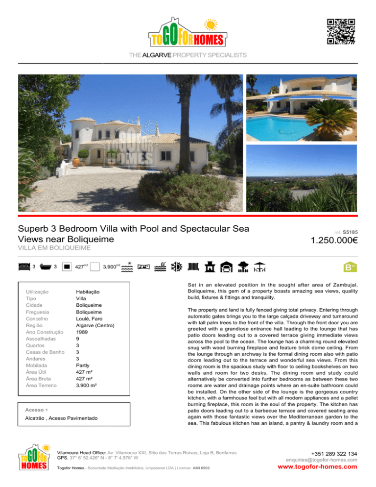 THE ALGARVE PROPERTY SPECIALISTS Superb 3 Bedroom Villa with Pool and Spectacular Sea Views near Boliqueime ref. S5185 1.250.000€ VILLA EM BOLIQUEIME 3 427m2 3 Utilização Tipo Cidade Freguesia Concelho Região Ano Construção Assoalhadas Quartos Casas de Banho Andares Mobilada Área Útil Área Bruta Área Terreno 3.900m2 Habitação Villa Boliqueime Boliqueime Loulé, Faro Algarve (Centro) 1989 9 3 3 3 Partly 427 m² 427 m² 3.900 m² Acesso + Alcatrão , Acesso Pavimentado Set in an elevated position in the sought after area of Zambujal, Boliqueime, this gem of a property boasts amazing sea views, quality build, fixtures & fittings and tranquility. The property and land is fully fenced giving total privacy. Entering through automatic gates brings you to the large calçada driveway and turnaround with tall palm trees to the front of the villa. Through the front door you are greeted with a grandiose entrance hall leading to the lounge that has patio doors leading out to a covered terrace giving immediate views across the pool to the ocean. The lounge has a charming round elevated snug with wood burning fireplace and feature brick dome ceiling. From the lounge through an archway is the formal dining room also with patio doors leading out to the terrace and wonderful sea views. From this dining room is the spacious study with floor to ceiling bookshelves on two walls and room for two desks. The dining room and study could alternatively be converted into further bedrooms as between these two rooms are water and drainage points where an en-suite bathroom could be installed. On the other side of the lounge is the gorgeous country kitchen, with a farmhouse feel but with all modern appliances and a pellet burning fireplace, this room is the soul of the property. The kitchen has patio doors leading out to a barbecue terrace and covered seating area again with those fantastic views over the Mediterranean garden to the sea. This fabulous kitchen has an island, a pantry & laundry room and a Vilamoura Head Office: Av. Vilamoura XXI, Sitio das Terras Ruivas, Loja B, Benfarras GPS. 37° 6' 52,426" N - 8° 7' 4,576" W Togofor Homes - Sociedade Mediação Imobiliária, Unipessoal LDA | License: AMI 6902 +351 289 322 134 [email protected] www.togofor-homes.com THE ALGARVE PROPERTY SPECIALISTS “fonte” which takes purified softened water directly to the side by side fridge freezer giving 500 litres per day. Estacionamento + Garagem, Portão Automático , Acesso Pavimentado Sala Estar + Terraço , Vista Mar, Vista Campo, Chão Mosaico, AC Cozinha + Entrada Independente, Total-/ Equipada, Rústica , Ilha, Lavandaria, Arrecadação , Terraço , Vista Mar Upstairs comprises entirely of the stylish master bedroom suite with dressing area and dressing room, prettily tiled en-suite bathroom and private terrace with amazing sea views. On the lower level of this lovely home are two more large en-suite bedrooms with fitted wardrobes and air conditioning, an extensive recreational games room, a massive storage room and access out to the gardens and tennis court. On the grounds is another entrance gate with access to the double garage, many storage sheds, a tennis court and of course the beautiful terraces and swimming pool. Every inch of this property shouts quality, no expense spared and sold fully furnished and equipped even with brand new sports equipment. Viewing is a must. Outras Divisões + Arrecadação , Sala Jogos/TV, Cave, Escritório/Sala de Estudo Características Quarto + Quarto 1 1° andar, Casa Banho Privativa, Roupeiro Embutido, Área Vestir, AC, Terraço , Vista Mar Cave, Casa Banho Privativa, Roupeiro Embutido, Vista Mar Cave, Casa Banho Privativa, Roupeiro Embutido, Vista Jardim Quarto 2 Quarto 3 Casa de Banho + Casa Banho Hóspedes Sistema Aquecimento/Arrefecimento + Aquecimento Central a Óleo , Lareira, Salamandra, Queimador de Pellets, AC Equipamento + Painéis Solares (Água), Sistema Alarme, Internet/Linha Telefónica , Cofre, Intercomunicador Double glazed windows with fly screens and lockable grilles. Air conditioning throughout Oil central heating radiators throughout 2 x wood burning fireplaces (lounge and dining room) Pellet burning fireplace in kitchen Solar panels for hot water with back up boilers and hot water through central heating system 500 litre industrial reverse osmosis water purifier Alarm system Internet, phone line, satellite T.V. Safe Illuminated swimming pool with outdoor shower and covered terraces with sea views Brick built barbecue Auto irrigated Mediterranean gardens Tennis court with ball launcher machine Extensive storage rooms Double garage Storage sheds Borehole and cisterna water holding tank Laundry room and pantry Study Localização Set in the tranquil area of Zambujal, Boliqueime just 2 km to the town centre with all amenities catered for including supermarkets, banks, international and traditional restaurants, medical centres, schools, newsagents, petrol stations, hairdressers, cafés and much more.... Vilamoura Head Office: Av. Vilamoura XXI, Sitio das Terras Ruivas, Loja B, Benfarras GPS. 37° 6' 52,426" N - 8° 7' 4,576" W Togofor Homes - Sociedade Mediação Imobiliária, Unipessoal LDA | License: AMI 6902 +351 289 322 134 [email protected] www.togofor-homes.com THE ALGARVE PROPERTY SPECIALISTS Água-Electricidade-Esgotos + Cisterna, Furo, Descalcificador de Água, Electricidade da Rede, Fossa Séptica 10 minutes drive to the closest beaches Just a 15 minute drive to world class golf and leisure facilities in the “Golden Triangle” and 10 minutes to the 5 golf courses and marina of Vilamoura 25 minutes drive to Faro international airport Janelas + Vidros Duplos, Mosquiteiros, Grelhas Segurança Piscina + Privado(a), Duche, Iluminação Jardim + Paisagístico , Murado, Gradeamento, Auto-rega, Árvores , Iluminação , Churrasqueira, Terraço de Jardim Exterior + Campo Ténis Vistas + Vista Mar, Vista Panorâmica Vilamoura Head Office: Av. Vila