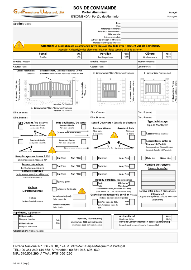 BON DE COMMANDE Portail Aluminium ENCOMENDA - Portão de Alumínio Français Português Date: Data: Référence commande: Referência da encomenda: Délai souhaité: Entrega pretendida: Adresse de livraison si différente: Morada de entrega se diferente: Société / Cliente: Attention! La description de la commande devra toujours être faite avec l' élément vue de l'extérieur. Atenção! A descrição dos elementos deve ser feita sempre vista do exterior. Modèle / Modelo: Couleur / Cor: Si Portail Battant / Se Portão de batente - 70 mm Si Portail Coulissant / Se portão de correr - 95 mm Clôture Qté.: Qtd.: Gradeamento Modèle / Modelo: Modèle / Modelo: Couleur / Cor: Couleur / Cor: C - Largeur entre Pilliers / Largura entre pilares H - Hauteur visible / Altura visivel B - Hauteur Côté Pilliers / Altura até à cota do pilar Côté de Reservation: Cota fixa: Portillon Portão pedonal Qté.: Qtd.: E - Largeur total / Largura total F -Hauteur Côté Pilliers / Altura à cota dos pilares Qté.: Qtd.: Portão D - Hauteur Côté Pilliers / Altura à cota dos pilares Portail à sceller / a chumbar Dim. A (mm): A - Largeur entre Pilliers / Largura entre pilares à sceller / a chumbar Dim. C (mm): Dim. E (mm): Dim. D (mm): Dim. B (mm): Type Ouvrant / De batente Ouverture à Droite Abre para a direita Ouverture à Gauche Abre para a esquerda Type Coulissant / De correr Ouverture à Droite Abre para a direita Dim. F (mm): Type de Montage Sens d`Ouverture / Sentido de abertura Tipo de Montagem Ouverture à Gauche Abre para a esquerda Ouverture à Droite Abre para a direita Ouverture à Gauche Abre para a esquerda À sceller / Para chumbar À visser (fourni pattes de fixation 10 €/unité) Para aparafusar (fornecido com bases de fixação 10€/unidade) Remplissage avec Lames à 45º Enchimento com réguas a 45º Serrure mécanique Fechadura mecânica Serrure électrique (uniquement pour Portail Battant) Fechadura elétrica Oui / Sim Non / Não Oui / Sim Non / Não Oui / Sim Non / Não Oui / Sim Non / Não Oui / Sim Non / Não Oui / Sim Non / Não Folhas Se Portão de batente Inégaux / Desiguais: Vantail gauche (mm): Folha esquerda Vantail droite(mm): Folha direita Non / Não Nombre de tronçons Número de secções Haut du Portillon / Topo do portão Égaux / Iguais Vantaux Si Portail Ouvrant Oui / Sim Droit 1/2 Courbe* Reto Meia Curva* (*Si moins de 1150, flêche de 100 mm) (*Se menos de 1150, flecha de 100 mm) Gâche à plein hauteur du portillon / Chapa de testa da altura total do portão Non Não Oui.Plus value de 35€ / Sim. Acresce o valor de 35€. Largeur entre pilliers X hauteur côté Pilliers (mm) Largura entre pilares X altura à cota do pilar (mm) Suplément / Suplementos: Pillier à sceller Pilar para chumbar Pillier à visser Pilar para aparafusar Qté.: Qtd.: Hauteur / Altura H (mm): Maximum de 2500 mm (voir dessin) Máximo de 2500 mm (ver desenho) Arrêt de Portail Fixador de folhas Barre de Contreventement + Boîtier (1 par portail) Barra de contravento + Suporte (1 por portão). Observations / Observações: Estrada Nacional Nº 356 - 8, 10, 12A /\ 2435-576 Seiça-Mosqueiro /\ Portugal TEL.: 00 351 249 144 568 /\ Portable.: 00 351 913. 695. 539 NIF.: 510.501.290 /\ TVA.: PT510501290 GG.141.E (fr+pt) Qté.: Qtd.:
