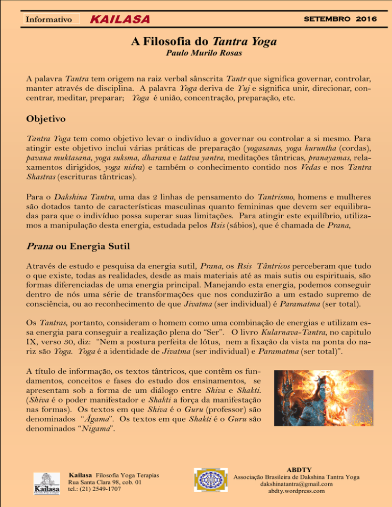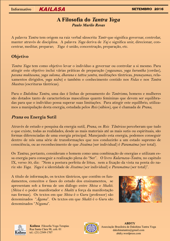 Informativo KAILASA SETEMBRO 2016 A Filosofia do Tantra Yoga Paulo Murilo Rosas A palavra Tantra tem origem na raiz verbal sânscrita Tantr que significa governar, controlar, manter através de disciplina. A palavra Yoga deriva de Yuj e significa unir, direcionar, concentrar, meditar, preparar; Yoga é união, concentração, preparação, etc. Objetivo Tantra Yoga tem como objetivo levar o indivíduo a governar ou controlar a si mesmo. Para atingir este objetivo inclui várias práticas de preparação (yogasanas, yoga kuruntha (cordas), pavana muktasana, yoga suksma, dharana e tattva yantra, meditações tântricas, pranayamas, relaxamentos dirigidos, yoga nidra) e também o conhecimento contido nos Vedas e nos Tantra Shastras (escrituras tântricas). Para o Dakshina Tantra, uma das 2 linhas de pensamento do Tantrismo, homens e mulheres são dotados tanto de características masculinas quanto femininas que devem ser equilibradas para que o indivíduo possa superar suas limitações. Para atingir este equilíbrio, utilizamos a manipulação desta energia, estudada pelos Rsis (sábios), que é chamada de Prana, Prana ou Energia Sutil Através de estudo e pesquisa da energia sutil, Prana, os Rsis Tântricos perceberam que tudo o que existe, todas as realidades, desde as mais materiais até as mais sutis ou espirituais, são formas diferenciadas de uma energia principal. Manejando esta energia, podemos conseguir dentro de nós uma série de transformações que nos conduzirão a um estado supremo de consciência, ou ao reconhecimento de que Jivatma (ser individual) é Paramatma (ser total). Os Tantras, portanto, consideram o homem como uma combinação de energias e utilizam essa energia para conseguir a realização plena do “Ser”. O livro Kularnava-Tantra, no capitulo IX, verso 30, diz: “Nem a postura perfeita de lótus, nem a fixação da vista na ponta do nariz são Yoga. Yoga é a identidade de Jivatma (ser individual) e Paramatma (ser total)”. A título de informação, os textos tântricos, que contêm os fundamentos, conceitos e fases do estudo dos ensinamentos, se apresentam sob a forma de um diálogo entre Shiva e Shakti. (Shiva é o poder manifestador e Shakti a força da manifestação nas formas). Os textos em que Shiva é o Guru (professor) são denominados “Ägama”. Os textos em que Shakti é o Guru são denominados “Nigama”. Kailasa Filosofia Yoga Terapias Rua Santa Clara 98, cob. 01 tel.: (21) 2549-1707 ABDTY Associação Brasileira de Dakshina Tantra Yoga [email protected] abdty.wordpress.com Informativo KAILASA SETEMBRO 2016 2 “Gheranda respondeu: ..... Devo dizer-te, oh filho, o que me pedes. Escuta com bastante atenção. Não existem amarras mais poderosas do que as da ilusão (Maya). Não há força maior da que provem da disciplina (Yoga). Não há amigo mais elevado que o conhecimento (Jnana). E não há maior inimigo que o egoísmo (Ahamkara).” DIA 17 DE SETEMBRO: Sábado: de 9:30 às 13:30 FILOSOFIA DOS TANTRAS: SVADHISTANA CHAKRA Investimento: R$ 120,00 (R$100 para associados da ABDTY) Inscrições abertas na secretaria do Kailasa Prática Tântrica do mês EQUILÍBRIO HORMONAL FEMININO 13 de setembro — terça-feira: 10 às 11:30 21 de setembro — quarta-feira: 18 às 19:30 (Atividade gratuita) CURTA NOSSA PÁGINA NO FACEBOOK ! www.facebook.com/kailasafilosofiayogaterapias