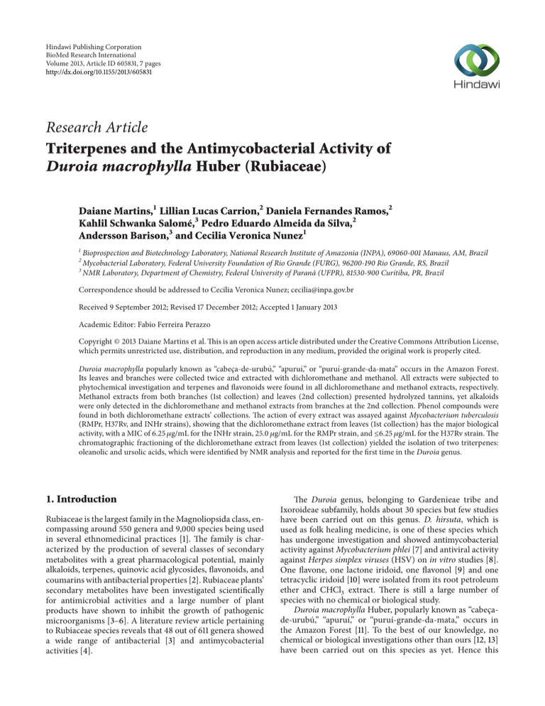 Hindawi Publishing Corporation BioMed Research International Volume 2013, Article ID 605831, 7 pages http://dx.doi.org/10.1155/2013/605831 Research Article Triterpenes and the Antimycobacterial Activity of Duroia macrophylla Huber (Rubiaceae) Daiane Martins,1 Lillian Lucas Carrion,2 Daniela Fernandes Ramos,2 Kahlil Schwanka Salomé,3 Pedro Eduardo Almeida da Silva,2 Andersson Barison,3 and Cecilia Veronica Nunez1 1 Bioprospection and Biotechnology Laboratory, National Research Institute of Amazonia (INPA), 69060-001 Manaus, AM, Brazil Mycobacterial Laboratory, Federal University Foundation of Rio Grande (FURG), 96200-190 Rio Grande, RS, Brazil 3 NMR Laboratory, Department of Chemistry, Federal University of Paraná (UFPR), 81530-900 Curitiba, PR, Brazil 2 Correspondence should be addressed to Cecilia Veronica Nunez; [email protected] Received 9 September 2012; Revised 17 December 2012; Accepted 1 January 2013 Academic Editor: Fabio Ferreira Perazzo Copyright © 2013 Daiane Martins et al. This is an open access article distributed under the Creative Commons Attribution License, which permits unrestricted use, distribution, and reproduction in any medium, provided the original work is properly cited. Duroia macrophylla popularly known as “cabeça-de-urubú,” “apuruı́,” or “puruı́-grande-da-mata” occurs in the Amazon Forest. Its leaves and branches were collected twice and extracted with dichloromethane and methanol. All extracts were subjected to phytochemical investigation and terpenes and flavonoids were found in all dichloromethane and methanol extracts, respectively. Methanol extracts from both branches (1st collection) and leaves (2nd collection) presented hydrolyzed tannins, yet alkaloids were only detected in the dichloromethane and methanol extracts from branches at the 2nd collection. Phenol compounds were found in both dichloromethane extracts’ collections. The action of every extract was assayed against Mycobacterium tuberculosis (RMPr, H37Rv, and INHr strains), showing that the dichloromethane extract from leaves (1st collection) has the major biological activity, with a MIC of 6.25 𝜇g/mL for the INHr strain, 25.0 𝜇g/mL for the RMPr strain, and ≤6.25 𝜇g/mL for the H37Rv strain. The chromatographic fractioning of the dichloromethane extract from leaves (1st collection) yielded the isolation of two triterpenes: oleanolic and ursolic acids, which were identified by NMR analysis and reported for the first time in the Duroia genus. 1. Introduction Rubiaceae is the largest family in the Magnoliopsida class, encompassing around 550 genera and 9,000 species being used in several ethnomedicinal practices [1]. The family is characterized by the production of several classes of secondary metabolites with a great pharmacological potential, mainly alkaloids, terpenes, quinovic acid glycosides, flavonoids, and coumarins with antibacterial properties [2]. Rubiaceae plants’ secondary metabolites have been investigated scientifically for antimicrobial activities and a large number of plant products have shown to inhibit the growth of pathogenic microorganisms [3–6]. A literature review article pertaining to Rubiaceae species reveals that 48 out of 611 genera showed a wide range of antibacterial [3] and antimycobacterial activities [4]. The Duroia genus, belonging to Gardenieae tribe and Ixoroideae subfamily, holds about 30 species but few studies have been carried out on this genus. D. hirsuta, which is used as folk healing medicine, is one of these species which has undergone investigation and showed antimycobacterial activity against Mycobacterium phlei [7] and antiviral activity against Herpes simplex viruses (HSV) on in vitro studies [8]. One flavone, one lactone iridoid, one flavonol [9] and one tetracyclic iridoid [10] were isolated from its root petroleum ether and CHCl3 extract. There is still a large number of species with no chemical or biological study. Duroia macrophylla Huber, popularly known as “cabeçade-urubú,” “apuruı́,” or “puruı́-grande-da-mata,” occurs in the Amazon Forest [11]. To the best of our knowledge, no chemical or biological investigations other than ours [12, 13] have been carried out on this species as yet. Hence this 2 BioMed Research International Leaves DCM (9 g) \\ 1–4 (2 g) 5 (20 mg) SiO2 CC 92 fractions \\ 6–12 (1 g) 14–16 (180 mg) SiO2 CC 63 fractions SiO2 CC \\ 17–21 (60 mg) SiO2 CC 33 fractions \\ 25–40 (900 mg) 41–44 (700 mg) SiO2 CC \\ 46–56 (320 mg) SiO2 CC \\ \\ 27 fractions 6 (130 mg) 57 (50 mg) \\ 63–65 (80 mg) 66–68 (100 mg) \\ 70–74 (75 mg) \\ 76–86 (118 mg) 94–99 (243 mg) SiO2 CC 12 fractions SiO2 CC \\ 4 (4 mg) 1–3 34 HPLC 1 (2 mg) 2 (2 mg) Figure 1: Schematic representation of D. macrophylla dichloromethane extract of leaves (1st collection) fractionation. DCM: dichloromethane; CC: chromatographic column; HPLC: high-performance liquid chromatography. work aims to evaluate the antimycobacterial activity of their extracts and isolate and identify the substances present in D. macrophylla active extracts. 2. Material and Methods 2.1. Plant Material. Two collections were performed, the first one, at the “A. Ducke” Forest Reserve, 26 km from Manaus, was carried out on December 5th, 2008, and a voucher specimen (222383) was deposited at the Herbarium of the Botanical Research Coordination of the National Research Institute of Amazonia (INPA). The second one at the Natural Heritage Private Reserve, locally known as “Cachoeira da Onça,” in “Presidente Figueiredo” County, AM, was carried out on May 18th, 2011. A voucher specimen (222501) was deposited at the same Herbarium. 2.2. Extracts Preparation. Plant material (leaves and branches) was dried in an oven at 50∘ C and powdered. Each plant part was extracted three times separately, first with dichloromethane (DCM) followed by methanol (MeOH), in a sonic bath for 20 minutes. After filtration, DCM and MeOH extracts 