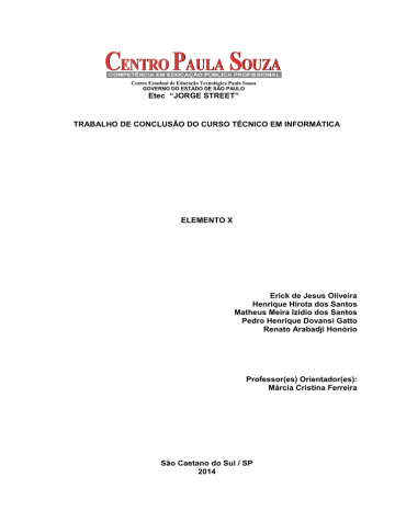 Centro Estadual de Educação Tecnológica Paula Souza GOVERNO DO ESTADO DE SÃO PAULO Etec “JORGE STREET” TRABALHO DE CONCLUSÃO DO CURSO TÉCNICO EM INFORMÁTICA ELEMENTO X Erick de Jesus Oliveira Henrique Hirota dos Santos Matheus Meira Izidio dos Santos Pedro Henrique Dovansi Gatto Renato Arabadji Honório Professor(es) Orientador(es): Márcia Cristina Ferreira São Caetano do Sul / SP 2014 ELEMENTO X Trabalho de Conclusão de Curso apresentado como pré-requisito para obtenção do Diploma de Técnico em informática. São Caetano do Sul / SP 2014 DEDICATÓRIA Dedicamos este trabalho aos nossos professores e colegas de sala. AGRADECIMENTOS Agradecemos especialmente nossos professores em especial: Fernando, Fábio, Carlos, Damélio, Márcia, Valéria, Suely, Nelson e Simone que nos auxiliaram e nos dedicaram parte de seu tempo para a nossa atenção. Sendo nossos conselheiros, amigos e mestres. Colaborando extremamente com o nosso projeto. RESUMO Projeto na área de jogos com a função de exercitar e desenvolver a parte do raciocínio lógico e mental. O jogo Elemento X foi programado em linguagem C na plataforma M.U.G.E.N. ,com uma história desafiadora e uma série de imagens desenhadas e atribuídas a cada função o jogo animado consegue atrair a atenção do usuário proporcionando uma experiência divertida onde ele ganha a função de controlar o personagem que pode executar socos, chutes entre outros movimentos fazendo com que no decorrer do jogo o usuário comece a racionar o que deve ser feito para derrotar um inimigo além de treinar a parte do reflexo para que os dedos da mão possam transmitir através dos controles os movimentos que foram pensados. Palavras-chave: entretenimento; desenvolvimento; raciocínio. " Aqui no entanto nós não olhamos para trás por muito tempo, Nós continuamos seguindo em frente, abrindo novas portas e fazendo coisas novas,Porque somos curiosos... e a curiosidade continua nos conduzindo por novos caminhos. Siga em frente." Walt Disney LISTA DE FIGURAS Figura 1 – Tabela do Ranking ................................................................................... 11 Figura 2 – Programação do jogo ............................................................................... 20 Figura 3 – Modelagem do personagem ..................................................................... 21 Figura 4 – Conjunção ................................................................................................ 22 Figura 5 – Seleção de cores do personagem para o fundo ....................................... 23 Figura 6 – Menu ........................................................................................................ 24 Figura 7 – Tela do modo história ............................................................................... 25 Figura 8 – Tela modo Versus .................................................................................... 26 Figura 9 – Tela equipe arcade................................................................................... 27 Figura 10 – Tela equipe Versus ................................................................................ 28 Figura 11 – Tela equipe co-op................................................................................... 29 Figura 12 – Tela modo sobrevivência ....................................................................... 30 Figura 13 – Tela modo sobrevivência co-op.............................................................. 31 Figura 14 – Tela modo treinamento .......................................................................... 32 Figura 16 – Assistir partida ........................................................................................ 33 Figura 16 – Tela de opções ....................................................................................... 34 Sumário Introdução ................................................................................................................... 8 Abstract ....................................................................................................................... 9 Tema e delimitação ................................................................................................... 10 Objetivos ................................................................................................................... 10 Justificativa ................................................................................................................ 10 Metodologia ............................................................................................................... 10 Dificuldades Linguagem Estudada Principal Desenvolvimento 1 – Mercado de jogos ................................................................................................ 11 1.1 – No Brasil ........................................................................................................ 11 1.2 – Estatísticas do mercado ................................................................................ 11 1.3 – Mercado de trabalho...................................................................................... 12 2 – Consoles e afins .................................................................................................. 14 2.1 – Consoles na liderança ................................................................................... 14 2.2 – Pirataria ......................................................................................................... 14 2.3 – Consumo ....................................................................................................... 14 2.4 – Empresas presentes atualmente envolvidas no mercado ............................. 15 3 – Jogos mais populare no Brasil ............................................................................ 16 3.1 – Importância dos jogos ...................................
