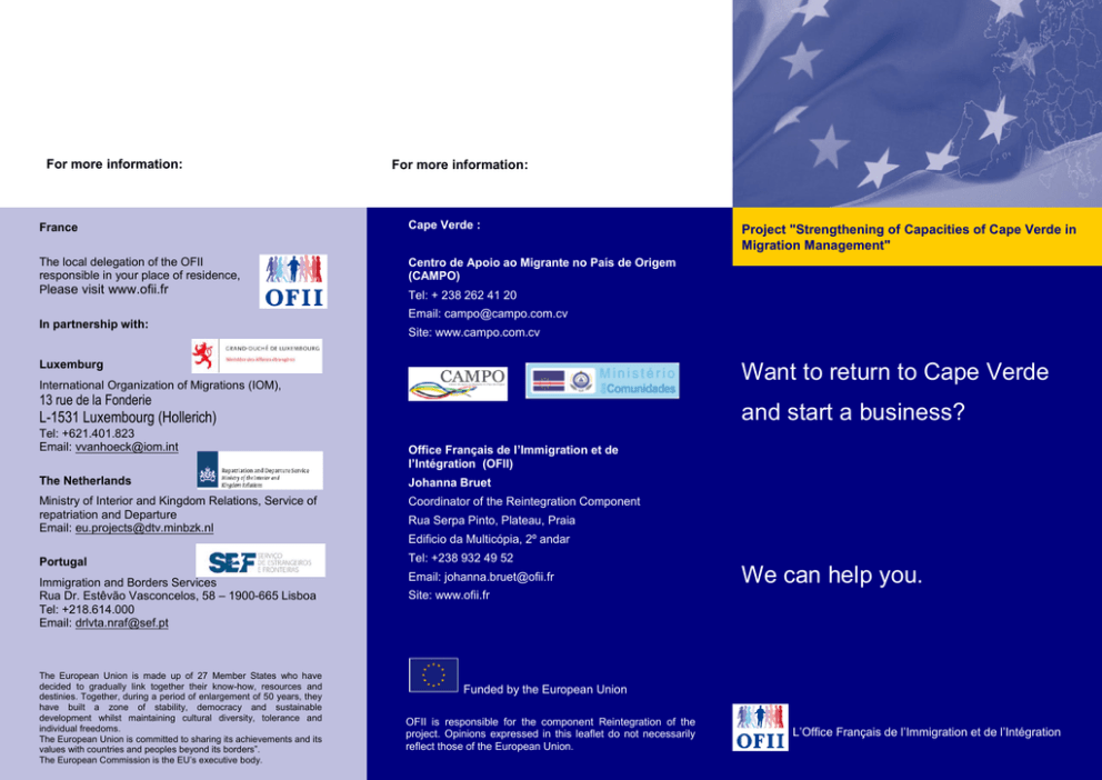 For more information: For more information: France Cape Verde : The local delegation of the OFII responsible in your place of residence, Please visit www.ofii.fr Centro de Apoio ao Migrante no País de Origem (CAMPO) In partnership with: Tel: + 238 262 41 20 Email: [email protected] Site: www.campo.com.cv Luxemburg Want to return to Cape Verde International Organization of Migrations (IOM), 13 rue de la Fonderie and start a business? L-1531 Luxembourg (Hollerich) Tel: +621.401.823 Email: [email protected] Project "Strengthening of Capacities of Cape Verde in Migration Management" Office Français de l’Immigration et de l’Intégration (OFII) The Netherlands Johanna Bruet Ministry of Interior and Kingdom Relations, Service of repatriation and Departure Email: [email protected] Coordinator of the Reintegration Component Rua Serpa Pinto, Plateau, Praia Edificio da Multicópia, 2º andar Portugal Tel: +238 932 49 52 Immigration and Borders Services Rua Dr. Estêvão Vasconcelos, 58 – 1900-665 Lisboa Tel: +218.614.000 Email: [email protected] Email: [email protected] The European Union is made up of 27 Member States who have decided to gradually link together their know-how, resources and destinies. Together, during a period of enlargement of 50 years, they have built a zone of stability, democracy and sustainable development whilst maintaining cultural diversity, tolerance and individual freedoms. The European Union is committed to sharing its achievements and its values with countries and peoples beyond its borders”. The European Commission is the EU’s executive body. We can help you. Site: www.ofii.fr Funded by the European Union OFII is responsible for the component Reintegration of the project. Opinions expressed in this leaflet do not necessarily reflect those of the European Union. L’Office Français de l’Immigration et de l’Intégration You are Cape-Verdean and you want to return to Cape-Verde and start your own business, The Office Français de l’Immigration et de l’Intégration (OFII) and its partners can assist you to implement your project. This is an economic reintegration assistance What kind of assistance is available in Cape program created within an European project Verde? The Partners : and being implemented by the European Union (EU) and the Government of Cape Verde Assistance to start a business: (GOCV). Within the framework of the mobility partnership between the EU and the GOCV, the European project for Reinforcement of Verde’s Cape Capacities for Migration Management foresees an economic reintegration assistance program for Cape-Verdeans who wish to return to their homeland. Immigration and Borders Services Based on your situation you may benefit from: Technical assistance from a local (SEF), the project leader, Portugal consultant to start your business; Financial assistance for the startup of France your business; French Office of Immigration and Integration (OFII), Assistance during the implementation and the monitoring phases; Immigration Directorate, (ID), Ministry of Foreign Training related to your business activity. Affairs, Luxemburg Who is eligible? Service of Repatriation and Departure, Ministry of Job market reintegration: Cape-Verdeans nationals - Depending on your situation, the Centro de who currently live in one of the four European project country (i.e. partners France, of the Luxemburg, Portugal and The Netherlands) and - who wish to return to Cape Verde. Apoio ao Migrante no País de Origem Cape Verdeans who have been expelled from any of the aforementioned countries. The Netherlands (CAMPO) (Center to Support Migrants in their Country of Origin) and the Instituto de Emprego e Formação Profissional (IEFP)(Employment and Professional Training Institute) can assist you with your job search in Cape Who is not eligible? Interior and Kingdom Relations, (DT&V), Verde. The Ministry of Emigrated Communities, Cape Verde.