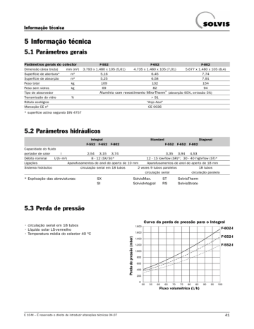 Informação técnica 5 Informação técnica 5.1 Parâmetros gerais Parâmetros gerais do colector Dimensão (área bruta) Superfície de abertura* Superfície de absorção Peso total Peso sem vidros Tipo de absorvedor Transmissão do vidro Rótulo ecológico Marcação CE nº mm (m²) m² m² kg kg F-552 3.793 x 1.480 x 105 (5,61) 5,16 5,25 109 69 F-652 F-802 4.735 x 1.480 x 105 (7,01) 5.677 x 1.480 x 105 (8,4) 6,45 7,74 6,58 7,91 132 154 82 94 Alumínio com revestimento Miro-Therm® (absorção 95%, emissão 5%) > 91 “Anjo Azul” CE 0036 % * superfície activa segundo DIN 4757 5.2 Parâmetros hidráulicos Integral F-552 F-652 F-802 Standard Diagonal F-552 F-652 F-802 Capacidade do fluido portador de calor l 2,54 3,15 3,74 3,35 3,94 4,53 Débito nominal l/(h•m²) 8 - 12 (SX/SI)* 12 - 15 low-flow (SR)*; 30 - 40 high-flow (ST)* Ligações Aparafusamentos de anel de aperto de 10 mm Aparafusamentos de anel de aperto de 18 mm Sistema hidráulico circulação serial em 18 tubos 2 vezes 9 tubos paralelos 18 tubos circulação serial circulação paralela * Explicação das abreviaturas: SX SI SolvisMax. SolvisIntegral ST RS SolvisTherm SolvisStrato 5.3 Perda de pressão Curva da perda de pressão para o Integral • circulação serial em 18 tubos • Líquido solar LS-vermelho • Temperatura média do colector 40 ºC F-802-I Perda de pressão (mbar) F-652-I F-552-I Fluxo volumétrico (l/h) E 10-M – É reservado o direito de introduzir alterações técnicas 04.07 41 Informação técnica Perda de pressão (mbar) Curva da perda de pressão para o Standard • 2 vezes 9 tubos com circulação serial • Líquido solar LS-vermelho • Temperatura média do colector 40 ºC F-802-S F-652-S F-552-S Fluxo volumétrico Curva da perda de pressão para o Diagonal 80 Perda de pressão (mbar) Druckverlust [mbar] • circulação paralela em 18 tubos • Líquido solar LS-vermelho • Temperatura média do colector 40 ºC F-802-D 60 F-652-D F-552-D 40 20 0 100 200 300 400 500 600 700 800 900 1.000 Fluxo volumétrico (l/h) Volumenstrom in l/h 42 E 10-M – É reservadoEo10 direito – Sobdereserva introduzir de alterações técnicas 04.07
