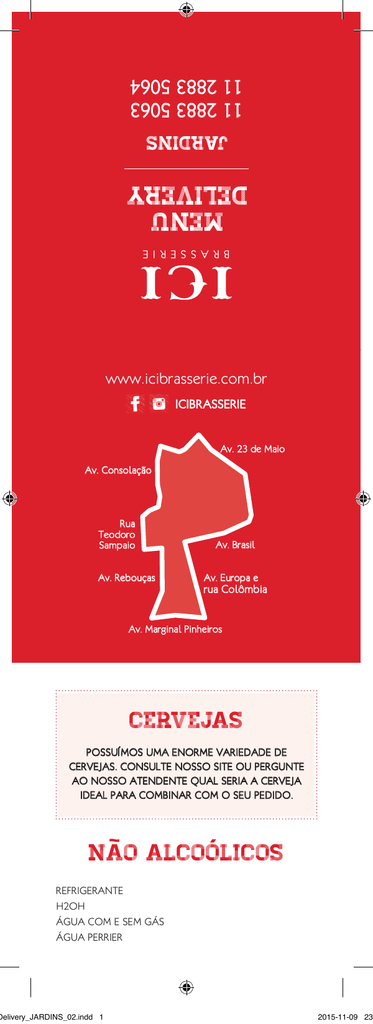 11 2883 5063 11 2883 5064 Jardins MENU DELIVERY www.icibrasserie.com.br ICIBRASSERIE Av. 23 de Maio Av. Consolação Rua Teodoro Sampaio Av. Rebouças Av. Brasil Av. Europa e rua Colômbia Av. Marginal Pinheiros CERVEJAS POSSUÍMOS UMA ENORME VARIEDADE DE CERVEJAS. CONSULTE NOSSO SITE OU PERGUNTE AO NOSSO ATENDENTE QUAL SERIA A CERVEJA IDEAL PARA COMBINAR COM O SEU PEDIDO. NÃO ALCOÓLICOS REFRIGERANTE H2OH ÁGUA COM E SEM GÁS ÁGUA PERRIER Delivery_JARDINS_02.indd 1 2015-11-09 23 ENTRADAS E PARA COMPARTILHAR • SALADA VERDE, QUEIJO DE CABRA EM PRALINÉ * • SALADA DE BETERRABA ASSADA E CROSTINI DE ROQUEFORT * • SALADA DE FRANGO SPICY * • STEAK TARTARE * • TARTAR DE ATUM * • PORTOBELO TRUFADO COM BRIE PANÈE • RILLETTES DE PORC - PORCO CONFITADO 3 HORAS E DESFIADO • GOUGÈRES - CAROLINAS SALGADAS RECHEADAS COM QUEIJO • MUSSARELA DE BÚFALA, PRESUNTO DE PARMA E RÚCULA * • MOULES ET FRITES BRASSERIE * = PRATOS COM 2 TAMANHOS croque, quiche, tarte e sandwich COM FRITAS OU SALADA • CROQUE MONSIEUR • CROQUE MADAME • PORQUINHO CROCANTE • CHIEN CHAUD (HOT DOG) • QUICHE DE CEBOLAS DOURADAS E BACON CROCANTE • TORTA DE FRANGO TIA OLGA • ICI BURGER Prato • L INGUINE BRASSERIE •G NOCCHI DE BATATA, MINI LEGUMES E VELOUTÉ DE MILHO •S TEAK FRITES - BÉARNAISE / DIJONNAISE / POIVRE •S CHNITZEL DE VITELA COM SALADA DE BATATA •A TUM “MI CUIT” DO ICI BISTRO • P ESCADO DO DIA COM CROSTA DE AZEITONAS E RATATOUILLE • CONFIT DE PATO COM LARANJA •C ARRÉ DE PORCO CHARCUTIÈRE • F RANGO ASSADO BRASSERIE •B LANQUETTE DE VEAU PEITO DE VITELA, MINI LEGUMES E ERVAS. ACOMPANHA SPEATZLE • BOEUF BOURGUIGNON • RISOTTO DE COGUMELOS TRUFADO Sobremesa • MOUSSE AU CHOCOLAT • PAIN PERDU ICI • MIL FOLHAS • FRUTAS Delivery_JARDINS_02.indd 2 2015-11-09 23