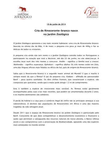 18 de junho de 2014 Cria de Rinoceronte-branco nasce no Jardim Zoológico O Jardim Zoológico apresenta o seu mais recente habitante: uma cria de Rinoceronte-branco. Nascida no último dia da Mãe, 4 de maio, a pequena cria pesa já mais de 40Kg e faz as delícias de todos os visitantes. A pequena cria ainda não tem nome e o Jardim Zoológico convida todos os Portugueses a participarem na votação que está a decorrer, até dia 22 de junho, no site www.zoo.pt. A escolha recai num dos três nomes a concurso: Andile – significa a família está a crescer; Nothemba - significa esperança; Siphokazi - significa dádiva. Os três nomes estão em Zulu, uma das línguas oficiais mais faladas na Africa do Sul, país de origem do Rinoceronte-branco. Sabia que o Rinoceronte-branco é o segundo maior animal do Mundo? E que o macho é sempre maior do que a fêmea? O pai da pequena cria, Globani - afilhado do patrocinador Banif - pesa quatro toneladas. Os dois chifres frontais, que caracterizam a espécie, são compostos por queratina, sendo que o maior pode atingir 1,5 m de comprimento. Esta é também a espécie de rinoceronte mais sociável. As fêmeas estão geralmente acompanhadas pelas suas crias mais recentes, que podem ser amamentadas durante 2 anos, e os machos dominantes são solitários. A perda do habitat e a caça para o comércio ilegal do chifre são as principais ameaças à sua sobrevivência. O declínio das populações de Rinocerontes em África é uma das maiores tragédias da vida selvagem atual. Desde 2011 que o espaço do Rinoceronte-branco no Jardim Zoológico é patrocinado pelo Banif. Consciente de que deve compatibilizar o desenvolvimento económico e financeiro a ações que permitam a salvaguarda dos recursos naturais do nosso planeta, o Banco reforça assim o seu compromisso com a preservação da Biodiversidade, apoiando uma das espécies mais ameaçadas no mundo animal. Visite o Jardim Zoológico e divirta-se com as primeiras brincadeiras da nova cria. Fique a saber tudo sobre esta espécie que encanta miúdos e graúdos.