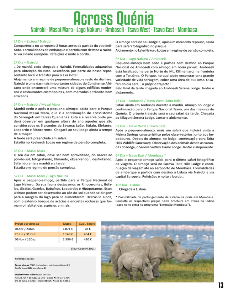 Across Quénia Nairobi - Masai Mara - Lago Nakuru - Amboseli - Tsavo West - Tsavo East - Mombasa 1º Dia – Lisboa / Nairobi O almoço será no seu lodge e, após um merecido repouso, saída Comparência no aeroporto 2 horas antes da partida do voo indi- para safari fotográfico no parque. cado. Formalidades de embarque e partida com destino a Nairo- Alojamento no Lake Nakuru Lodge em regime de pensão completa. bi via cidade europeia. Refeições e noite a bordo… 6º Dia – Lago Nakuru / Amboseli 2º Dia – Nairobi Pequeno-almoço bem cedo e partida com destino ao Parque …De manhã cedo chegada a Nairobi. Formalidades aduaneiras Nacional de Amboseli com almoço em bolsa pic-nic. Amboseli para obtenção do visto. Assistência por parte do nosso repre- está localizado na parte Norte do Mt. Kilimanjaro, na fronteira sentante local e transfer para o Eka Hotel. com a Tanzânia. O Parque, no qual pode encontrar uma grande Alojamento em regime de pequeno-almoço e resto do dia livre. variedade de vida selvagem, cobre uma área de 392 Km2. O saNairobi é uma das mais importantes cidades do Continente Afri- fari do dia será… o próprio trajecto! cano onde encontrará uma mistura de alguns edifícios moder- Pelo final da tarde chegada ao Amboseli Serena Lodge. Jantar e nos e restaurantes cosmopolitas, com mercados e trânsito bem alojamento. africanos. 7º Dia – Amboseli / Tsavo West (Taita Hills) 3º Dia – Nairobi / Masai Mara Safari ainda em Amboseli durante a manhã. Almoço no lodge e Manhã cedo e após o pequeno-almoço, saída para o Parque continuação para o Parque Nacional Tsavo, um dos maiores do Nacional Masai Mara, que é a continuação do ecossistema Quénia. O próprio trajecto será o seu safari da tarde. Chegada do Serengeti em terras Quenianas. Esta é a reserva onde po- ao Kilaguni Serena Lodge. Jantar e alojamento. derá observar em qualquer altura do ano aqueles que são considerados os 5 grandes da Savana: Leão, Búfalo, Elefante, 8º Dia – Tsavo West / Tsavo East Leopardo e Rinoceronte. Chegará ao seu lodge ainda a tempo Após o pequeno-almoço, mais um safari que incluirá visita a de almoçar. Mzima Springs caracterisitico pelos observatórios junto aos beA tarde será preenchida em safari. bedouros. Depois do almoço, no lodge, continuação para Taita Estadia no Keekorok Lodge em regime de pensão completa. Hills Wildlife Sanctuary. Observação dos animais desde as varandas do lodge, o Sarova Saltlick Game Lodge. Jantar e alojamento. 4º Dia – Masai Mara O seu dia em safari, deve ser bem aproveitado, do nascer ao 9º Dia – Tsavo East / Mombasa * pôr-do-sol, fotografando, filmando, observando… desfrutando. Após o pequeno-almoço saída para o último safari fotográfico Safari durante a manhã e a tarde. da viagem. O almoço será no Sarova Taita Hills Lodge e contiEstadia em regime de pensão completa. nuação da viagem até ao aeroporto de Mombasa. Formalidades de embarque e partida com destino a Lisboa via Nairobi e via 5º Dia – Masai Mara / Lago Nakuru capital Europeia. Refeições e noite a bordo… Após o pequeno-almoço, partida para o Parque Nacional de Lago Nakuru. Da sua fauna destacamos os Rinocerontes, Búfa- 10º Dia - Lisboa los, Girafas, Gazelas, Babuínos, Leopardos e Hipopótamos. Estes … Chegada a Lisboa. últimos podem ser observados ao pôr-do-sol quando se dirigem para a margem do lago para se alimentarem. Delicie-se ainda, * Possibilidade de prolongamento de estadia na praia em Mombasa. com o extenso bosque de acácias e encostas rochosas que for- Consulte os respectivos preços nesta brochura em Praias no Indico (base noite extra no programa “Extensão Mombasa”). mam o habitat das espécies animais. Preço por pessoa Duplo 01Abr / 24Jun 25Jun / 31 Out 01Nov / 15Dez Supl. Single 2.871 € 78 € 3.148 € 454 € 2.996 € 420 € (Tour Code PT3901) Partidas: Sábados Taxas aéreas 298€ (incluídas e sujeitas a alteração) Tarifa Voos KLM em classe R Suplementos Aéreos por pessoa: Até 28 Jun + 15 Ago/15 Dez - classe N 70 €; T 145€ De 29 Jun a 14 Ago - classe R 80€; N 155 €; T 235€ 13