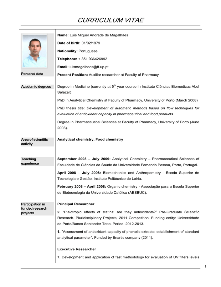 CURRICULUM VITAE Name: Luís Miguel Andrade de Magalhães Date of birth: 01/02/1979 Nationality: Portuguese Telephone: + 351 936426992 Email: [email protected] Personal data Present Position: Auxiliar researcher at Faculty of Pharmacy Academic degrees Degree in Medicine (currently at 5th year course in Instituto Ciências Biomédicas Abel Salazar) PhD in Analytical Chemistry at Faculty of Pharmacy, University of Porto (March 2008) PhD thesis title: Development of automatic methods based on flow techniques for evaluation of antioxidant capacity in pharmaceutical and food products. Degree in Pharmaceutical Sciences at Faculty of Pharmacy, University of Porto (June 2003). Area of scientific activity Analytical chemistry, Food chemistry Teaching experience September 2008 – July 2009: Analytical Chemistry – Pharmaceutical Sciences of Faculdade de Ciências da Saúde da Universidade Fernando Pessoa, Porto, Portugal. April 2008 ‒ July 2008: Biomechanics and Anthropometry - Escola Superior de Tecnologia e Gestão, Instituto Politécnico de Leiria. February 2008 ‒ April 2008: Organic chemistry - Associação para a Escola Superior de Biotecnologia da Universidade Católica (AESBUC). Participation in funded research projects Principal Researcher 2. “Pleiotropic effects of statins: are they antioxidants?” Pre-Graduate Scientific Research. Pluridisciplinary Projects, 2011 Competition. Funding entity: Universidade do Porto/Banco Santander Totta. Period: 2012-2013. 1. "Assessment of antioxidant capacity of phenolic extracts: establishment of standard analytical parameter". Funded by Enartis company (2011). Executive Researcher 7. Development and application of fast methodology for evaluation of UV filters levels 1 CURRICULUM VITAE in coastal bathing waters, Project PTDC/AAC-AMB/104882/2008, 2010-2012. 6. QREN, SI Qualificação PME/Vale Inovação, Promotor Maria Joaquim Braga Herdeiros, "VinusSanus: potencialização da capacidade antioxidante do vinho tinto" (2012). 5. Characterization and evaluation of performance of nano-structured sorbents for automatic extraction and preconcentration of pollutants, Acções Integradas LusoEspanholas nº E-48/2009, 2008-2009. 4. Development of azacalix(hetero)arene transporters for mediated anionic flux across membranes: a novel approach for studying ionic passive diffusion, Project PTDC/QUIQUI/101022/2008. 3. Novel strategies for implementation of process control based on Green Chemistry concepts, 2005-2008, funded by Fundação para a Ciência e Tecnologia and by Gabinete de Relações Internacionais da Ciência e do Ensino Superior. 2. Bioassay–guided isolation and identification of anti-inflammatory and antioxidant compounds from a medicinal extract of Pedilanthus tithymaloides, 2004-2005, funded by REQUIMTE-Laboratório Associado para a Química Verde, Tecnologias e Processos Limpos. 1. Assessing the dietary exposure of Portuguese consumers to acrylamide. Improvement, developement and validation of rapid screening procedures and confirmatory analytical methodologies. Project POCTI/AGR/61543/2004, 2005-2008. Supervising experience 2011-2013: Supervision of degree students Ana Mota and Tânia Soares. 2009-2011: Supervision of degree student Miguel Araújo Maia. 2009-2010: Co-supervision of PhD student Joana P.N. Ribeiro 2006-2007: Supervision of degree student Fernando Santos, work entitled “Highthroughput Folin-Ciocalteu assay: application to food products” Publications Bibliometric data (Thomson Reuters): Records found: 20; Sum of the Times Cited: 373; Average Citations per Article 18.65; h-index: 9. PhD Thesis L.M. Magalhães, Development of automatic methods based on flow techniques for evaluation of antioxidant capacity in pharmaceutical and food products. Faculty of Pharmacy, University of Porto (2008). 2 CURRICULUM VITAE Chapter in book 4. Use of near infrared spectroscopy for coffee beans quality assessment, M.C. Sarraguça, J.R. Santos, L.M. Magalhães, R.N.M.J. Páscoa, A.O.S.S. Rangel, J. A. Lopes, Chapter X: pag. XX. In: Coffee in Health and Disease Prevention. Edited by Victor R. Preedy, Elsevier, Amsterdam. 2013 (in-print). 3. Assays of riboflavin in food using solid-phase extraction, M.A. Segundo, M.V. Osório, L. Barreiros, L.M. Magalhães, H.M. Oliveira, in "B Vitamins and Folate Chemistry, Analysis, Functions and Effects", in Food and Nutritional Components in Focus series, edited by Victor R. Preedy, Royal Society of Chemistry, Cambridge, 2012, ISBN: 978-1-84973-369-4. 2. Determination of scavenging capacity against hydrogen peroxide: recent trends on chemical methods, M.A. Segundo, C. Castro, L.M. Magalhães, S. Reis, in "Hydrogen Peroxide: Detection, Applications and Health Implications", edited by Gilberto Aguilar and Raphael A. Guzman, Nova Publishers, Hauppauge, 2012, ISBN: 978-1-62257414-8. 1. Chapter 8. Determination of the Scavenging Capacity Against Reactive Nitrogen Species by Automatic Flow Injection-Based Methodologies, M.A. Segundo, L.M. Magalhães, J.P.N. Ribeiro, M. Lúcio, S. Reis, 91-104, in "Nitric Oxide - Methods and Protocols", edited by Helen O. McCarthy and Jonathan A. Coulter, Humana Press, New York, 2011, ISBN: 978-1-61737-963-5. Papers in peer reviewed international scientific journals 21) L.M. Magalhães*, L. Barreiros, S. Reis, M.A. Segundo, Kinetic matching approach applied to ABTS assay for high-throughput determination of total antioxidant capacity of food products. Submitted to Journal of Food and Composition Analysis (2013). 20) L.M. Magalhães*, I. Ramos, S. Reis, M. A. Segundo, Antioxidant profile of commercial enological tannins determined by multiple chemical assays. Accepted for publication in Australian Journal of Wine and Grape Research (2013). 19) M. Rosende, L.M. Magalhães, M.A. Segundo, M. Miró, Automated microdialysisbased system for in-situ microsampling and investigation of lead bioavailability in terrestrial environments under physiologically-based extraction conditions. Envir