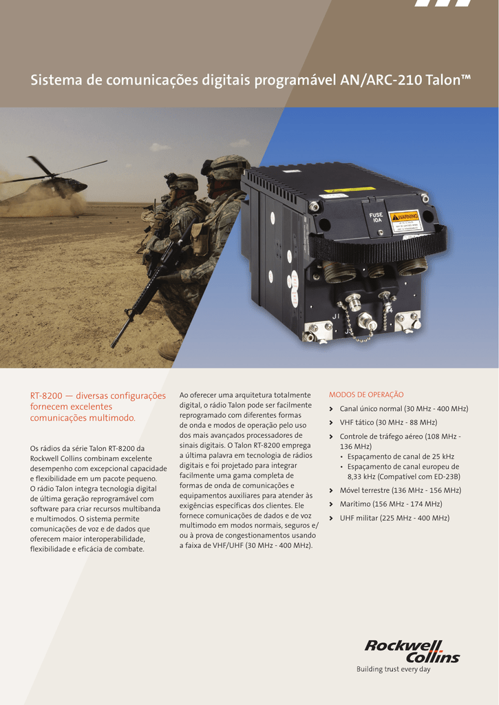 Sistema de comunicações digitais programável AN/ARC-210 Talon™ RT-8200 — diversas configurações fornecem excelentes comunicações multimodo. Os rádios da série Talon RT-8200 da Rockwell Collins combinam excelente desempenho com excepcional capacidade e flexibilidade em um pacote pequeno. O rádio Talon integra tecnologia digital de última geração reprogramável com software para criar recursos multibanda e multimodos. O sistema permite comunicações de voz e de dados que oferecem maior interoperabilidade, flexibilidade e eficácia de combate. Ao oferecer uma arquitetura totalmente digital, o rádio Talon pode ser facilmente reprogramado com diferentes formas de onda e modos de operação pelo uso dos mais avançados processadores de sinais digitais. O Talon RT-8200 emprega a última palavra em tecnologia de rádios digitais e foi projetado para integrar facilmente uma gama completa de formas de onda de comunicações e equipamentos auxiliares para atender às exigências específicas dos clientes. Ele fornece comunicações de dados e de voz multimodo em modos normais, seguros e/ ou à prova de congestionamentos usando a faixa de VHF/UHF (30 MHz - 400 MHz). Modos de operação >> Canal único normal (30 MHz - 400 MHz) >> VHF tático (30 MHz - 88 MHz) >> Controle de tráfego aéreo (108 MHz - 136 MHz) • Espaçamento de canal de 25 kHz • Espaçamento de canal europeu de 8,33 kHz (Compatível com ED-23B) >> Móvel terrestre (136 MHz - 156 MHz) >> Marítimo (156 MHz - 174 MHz) >> UHF militar (225 MHz - 400 MHz) características >> 250 canais normais pré-configurados >> 250 canais ECCM pré-configurados >> Varredura de canal (4 canais pré-configurados) >> Duas frequências de receptor de proteção: 121,5 MHz e 243 MHz >> Reprogramável por software >> Filtro de imunidade FM integrado >> Atualização disponível para interoperabilidade portátil, incluindo • forma de onda Quicklook 1A* ECCM • Criptografia Citadel®* • “Encriptação A” Rockwell Collins integrada >> Compatível com diversos equipamentos auxiliares • Unidades de controle remoto • Amplificadores de alta potência • Carregadores de dados • Montagens • Filtros/antenas sintonizáveis potência de saída >> NLT 15 watts/NMT 23 watts FM >> NLT 10 watts/NMT 15 watts AM (potência da transportadora) >> Redução da potência e desligamentos programáveis distintos >> Tabelas de desligamento de energia programáveis interfaces >> Portas RF • Porta única (Tx/Rx) • ADF/porta Rx dedicada >> E/S distintas para controle/status flexíveis >> Barramento de controle para antenas/filtros ajustáveis >> Entrada de horário padrão externa (horário GPS) >> ICS (sistema de intercomunicações) • Níveis de áudio programáveis >> Interface de controle MIL-STD-1553B >> Interface de controle RS-48 (para unidades de controle remotas) >> Interface de alimentação de ponto único DS-101 • Parâmetros ECCM • Pré-configurações RT >> Interface de alimentação de ponto único MIL-STD-1553B • Parâmetros ECCM • Pré-configurações RT >> Interface de alimentação RS-232 • Parâmetros ECCM • Pré-configurações RT >> Interface de alimentação DS-102 • HQ/SATURN WOD/MWOD >> Porta de dados RS-232 Modos de operação ECCM >> Have Quick I/II >> SINCGARS (V) >> SATURN >> TALON™ (exclusivo para o país) >> especificações sujeitas a mudanças sem aviso prévio. *Permite a interoperabilidade com outros sistemas de rádio usando criptografia criptográfica Citadel Citadel é marca comercial registrada da Harris Corporation. 147-1274-001 10/13 © 2013 Rockwell Collins. Todos os direitos reservados. especificações Energia Peso Largura Altura Comprimento Especificações de teste +28 V cc 154 watts TX 34 watts RCV 5,5 kg (12,2 lbs ) 12,7 cm (5,0 pol. ) 17,01 cm (6,7 pol.) 24,89 cm (9,8 pol.) MIL-STD-461E MIL-STD-810E equipamento auxiliar Unidade de controle remoto RCU-815X Carregador de dados DL-8171 Montagem com perfil baixo MT-6567 Montagem isolada MT-4935 Montagem 994M-4 Construindo confiança todos os dias. A Rockwell Collins fornece soluções de comunicação e de componentes eletrônicos da aviação inteligentes para clientes no mundo todo. Apoiada por uma rede global de serviços e suporte, estamos comprometidos em por a tecnologia e a inovação prática para trabalhar para você, quando e onde precisar de nós. Desta forma, trabalhando juntos, construímos confiança. Todos os dias. Para mais informações, entre em contato com: Rockwell Collins 400 Collins Road NE Cedar Rapids, Iowa 52498 +1.800.321.2223 +1.319.295.5100 fax: +1.319.378.1172 email: [email protected] www.rockwellcollins.com