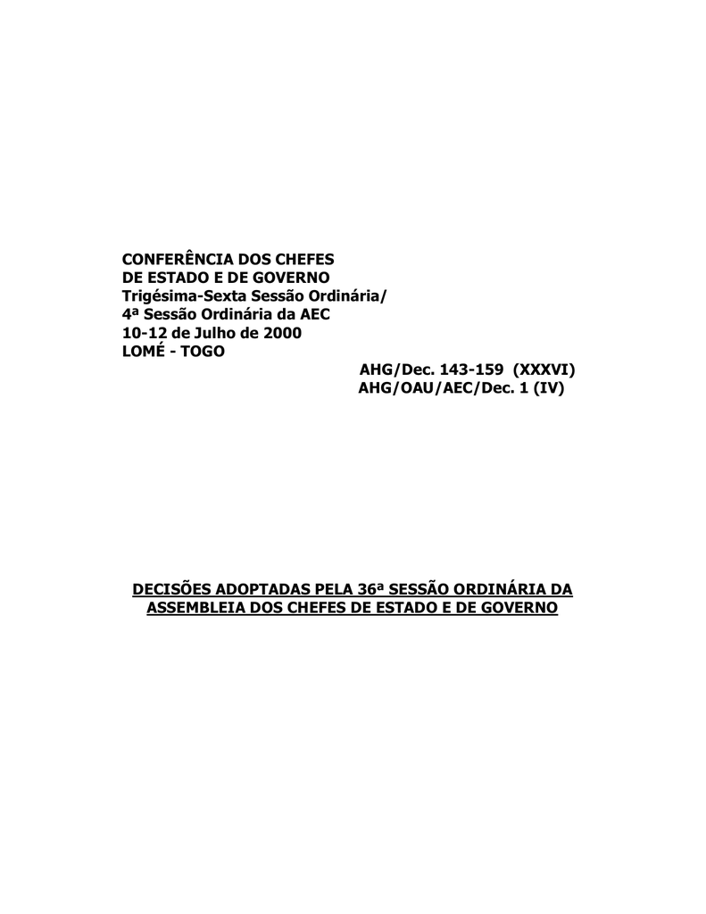 CONFERÊNCIA DOS CHEFES DE ESTADO E DE GOVERNO Trigésima-Sexta Sessão Ordinária/ 4ª Sessão Ordinária da AEC 10-12 de Julho de 2000 LOMÉ - TOGO AHG/Dec. 143-159 (XXXVI) AHG/OAU/AEC/Dec. 1 (IV) DECISÕES ADOPTADAS PELA 36ª SESSÃO ORDINÁRIA DA ASSEMBLEIA DOS CHEFES DE ESTADO E DE GOVERNO AHG/Dec. 143 (XXXVI) DECISÃO SOBRE O ESTABELECIMENTO DA UNIÃO AFRICANA E DO PARLAMENTO PAN-AFRICANO A Conferência: 1. Toma nota do Relatório e Recomendação da 72ª Sessão Ordinária do Conselho de Ministros; 2. Louva o excelente trabalho realizado, num curto espaço de tempo, pelo Conselho de Ministros assistido por Peritos e Parlamentares; 3. Aprova e Adopta o Projecto de Acto Constitutivo sobre a criação da União Africana; 4. Exorta a todos os Estados Membros a tomarem as medidas necessárias para a sua assistência e ratificação, o mais breve possível, por forma a garantir a sua rápida implementação; 5. Pede ao Secretário Geral que convoque uma reunião de Parlamentares para analisarem o Projecto de Protocolo ao Tratado de criação da Comunidade Económica Africana relativo ao Parlamento Pan-Africano e a submetê-lo à análise e aprovação pelas próximas sessões do Conselho de Ministros e subsequente adopção pela Conferência dos Chefes de Estado e de Governo. AHG/Dec. 144 (XXXVI) DECISÃO SOBRE O CONFLITO ENTRE A ETIÓPIA E A ERITREIA A Conferência. 1. Felicita-se pelo Acordo sobre a Cessação das hostilidades assinado em Argel, a 18 de Junho de 2000, pelo Governo da República Federal Democrática da Etiópia e o Governo do Estado da Eritreia; 2. Presta homenagem ao Presidente Abdelaziz Bouteflika, Presidente Cessante da OUA e ao Secretário Geral da OUA, pelos esforços contínuos envidados no sentido de promover uma solução pacífica ao conflito entre a Etiópia e a Eritreia; 3. Exprime a sua apreciação à ONU, União Europeia, Estados Unidos da América e aos outros membros da Comunidade Internacional, pelo apoio que continuam concedendo aos esforços da OUA; 4. Encoraja as duas partes a prosseguirem as negociações, sob os auspícios da OUA, a fim de conseguir uma paz duradoura e definitiva; 5. Pede ao Conselho de Segurança da ONU para tomar as disposições necessárias com vista a um envio rápido da Missão de Manutenção da Paz, prevista no Acordo sobre a Cessação das hostilidades; 6. Pede aos Estados Membros para continuarem a conceder o seu apoio e assistência aos esforços da OUA, em particular, no sentido de lhe permitir assumir as suas responsabilidade na implementação do Acordo sobre a Cessação das hostilidades; 7. Solicita expressamente ao Presidente Abdelaziz Bouteflika para prosseguir a sua acção com vista a conseguir uma solução pacífica e duradoura ao conflito entre os dois países irmãos. AHG/Dec. 145 (XXXVI) DECISÃO SOBRE O CONFLITO NA REPÚBLICA DEMOCRÁTICA DO CONGO A Conferência: 1. Reitera o seu apoio ao Acordo de Cessar-Fogo de Lusaka, sobre a República Democrática do Congo, que constitui o único quadro negociado e aceite por todas as partes para a solução da crise na RDC; 2. Exorta as Partes a aplicarem estritamente o Acordo em todos os seus aspectos; 3. Felicita Sir Ketumile Masire, Facilitador do Diálogo Inter-Congolês e a Comissão Militar Mista pelos esforços envidados no quadro da implementação do Acordo de Lusaka; 4. Solicita ao Governo da República Democrática do Congo, assim como as outras partes congolesas, a cooperarem plenamente com o Facilitador, a fim de que o diálogo inter-congolês possa iniciar, o mais brevemente possível; 5. Exorta os países que têm as suas forças na República Democrática do Congo a retirá-las, em conformidade com os Acordos de Cessar-Fogo de Lusaka; 6. Pede instantemente à Organização das Nações Unidas para completar o mais breve possível, o envio dos observadores da ONU, conforme a Resolução 1291 de 29 de Abril de 2000, do Conselho de Segurança e tomar as disposições necessárias com vista ao envio da Força de Manutenção da Paz na RDC, conforme os termos do Acordo de Cessar-Fogo de Lusaka; 7. Presta homenagem ao Presidente Frederick Chiluba, Presidente da Iniciativa Regional da Paz na República Democrática do Congo, assim como ao Presidente Cessante da OUA, Sua Excelência Sr. Abdelaziz Bouteflika e aos outros dirigentes africanos e o Secretário Geral da OUA pelos esforços incansáveis que desenvolveram para o regresso da paz na RDC; AHG/Dec. 145 (XXXVI) Pág. 2 8. Encoraja o Presidente Frederick Chiluba, conjuntamente com o Presidente em Exercício, o Secretário Geral da OUA e os outros Chefes de Estado a prosseguirem os seus esforços para a implementação do Acordo de Cessar-Fogo de Lusaka, sobre a República Democrática do Congo; 9. Exorta a Comunidade Internacional a continuar a apoiar o processo de paz na RDC e apoiar os esforços do Facilitador e a Comissão Militar Mista. AHG/Dec. 146 (XXXVI) DECISÃO SOBRE A SOMÁLIA A Conferência: 1. Reitera o seu compromisso em relação à unidade e à integridade territorial da Somália; 2. Felicita o Presidente da República do Djibouti, Sr. Ismail Omar Guelleh e apoia firmemente a sua iniciativa visando a restauração do Estado e as instituições somalianas e promover uma solução pacífica e duradoura do conflito neste país mortificado por longos anos de guerra civil; 3. Concede o seu apoio à Conferência Nacional Somaliana para a Paz, reunida em Arta (Djibouti) e as instituições somalianas que serão obtidas desta Conferência; 4. Pede à Comunidade Internacional para conceder o seu apoio político, financeiro e logístico, com vista a assegurar o sucesso da Conferência Nacional Somaliana para a Paz e a implementação das decisões emanadas desta Conferência; AHG/Dec. 147 (XXXVI) DECISÃO SOBRE SIERRA LEONE A Assembleia: 1. Manifesta o seu apreço ao Presidente em Exercício da CEDEAO, Presidente Alpha Omar Konaré, e aos líderes da região, pelos esforços que empreenderam para tr