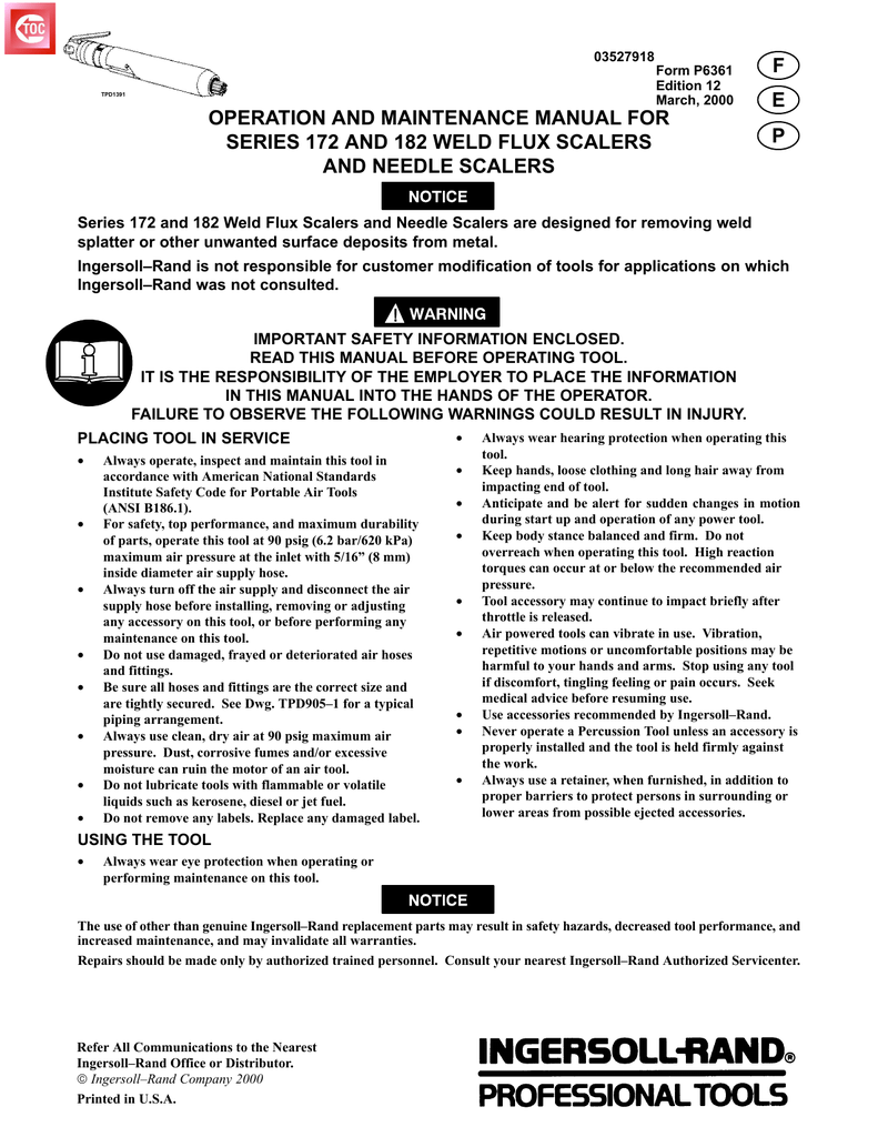 03527918 Form P6361 Edition 12 March, 2000 TPD1391 OPERATION AND MAINTENANCE MANUAL FOR SERIES 172 AND 182 WELD FLUX SCALERS AND NEEDLE SCALERS F E P Series 172 and 182 Weld Flux Scalers and Needle Scalers are designed for removing weld splatter or other unwanted surface deposits from metal. Ingersoll–Rand is not responsible for customer modification of tools for applications on which Ingersoll–Rand was not consulted. IMPORTANT SAFETY INFORMATION ENCLOSED. READ THIS MANUAL BEFORE OPERATING TOOL. IT IS THE RESPONSIBILITY OF THE EMPLOYER TO PLACE THE INFORMATION IN THIS MANUAL INTO THE HANDS OF THE OPERATOR. FAILURE TO OBSERVE THE FOLLOWING WARNINGS COULD RESULT IN INJURY. PLACING TOOL IN SERVICE • • • • • • • • Always operate, inspect and maintain this tool in accordance with American National Standards Institute Safety Code for Portable Air Tools (ANSI B186.1). For safety, top performance, and maximum durability of parts, operate this tool at 90 psig (6.2 bar/620 kPa) maximum air pressure at the inlet with 5/16” (8 mm) inside diameter air supply hose. Always turn off the air supply and disconnect the air supply hose before installing, removing or adjusting any accessory on this tool, or before performing any maintenance on this tool. Do not use damaged, frayed or deteriorated air hoses and fittings. Be sure all hoses and fittings are the correct size and are tightly secured. See Dwg. TPD905–1 for a typical piping arrangement. Always use clean, dry air at 90 psig maximum air pressure. Dust, corrosive fumes and/or excessive moisture can ruin the motor of an air tool. Do not lubricate tools with flammable or volatile liquids such as kerosene, diesel or jet fuel. Do not remove any labels. Replace any damaged label. • • • • • • • • • Always wear hearing protection when operating this tool. Keep hands, loose clothing and long hair away from impacting end of tool. Anticipate and be alert for sudden changes in motion during start up and operation of any power tool. Keep body stance balanced and firm. Do not overreach when operating this tool. High reaction torques can occur at or below the recommended air pressure. Tool accessory may continue to impact briefly after throttle is released. Air powered tools can vibrate in use. Vibration, repetitive motions or uncomfortable positions may be harmful to your hands and arms. Stop using any tool if discomfort, tingling feeling or pain occurs. Seek medical advice before resuming use. Use accessories recommended by Ingersoll–Rand. Never operate a Percussion Tool unless an accessory is properly installed and the tool is held firmly against the work. Always use a retainer, when furnished, in addition to proper barriers to protect persons in surrounding or lower areas from possible ejected accessories. USING THE TOOL • Always wear eye protection when operating or performing maintenance on this tool. The use of other than genuine Ingersoll–Rand replacement parts may result in safety hazards, decreased tool performance, and increased maintenance, and may invalidate all warranties. Repairs should be made only by authorized trained personnel. Consult your nearest Ingersoll–Rand Authorized Servicenter. Refer All Communications to the Nearest Ingersoll–Rand Office or Distributor. Ingersoll–Rand Company 2000 Printed in U.S.A. WARNING LABEL IDENTIFICATION FAILURE TO OBSERVE THE FOLLOWING WARNINGS COULD RESULT IN INJURY. WARNING WARNING Always wear eye protection when operating or performing maintenance on this tool. Always wear hearing protection when operating this tool. WARNING WARNING Air powered tools can vibrate in use. Vibration, repetitive motions or uncomfortable positions may be harmful to your hands and arms. Stop using any tool if discomfort, tingling feeling or pain occurs. Seek medical advice before resuming use. Do not carry the tool by the hose. WARNING Always turn off the air supply and disconnect the air supply hose before installing, removing or adjusting any accessory on this tool, or before performing any maintenance on this tool. WARNING Do not use damaged, frayed or deteriorated air hoses and fittings. WARNING 90 psig (6.2bar/620kPa) Operate at 90 psig (6.2 bar/ 620 kPa) Maximum air pressure. WARNING Keep body stance balanced and firm. Do not overreach when operating this tool. PERCUSSIVE TOOL SPECIFIC WARNINGS • • • • • • • • • • • When wearing gloves and operating models with inside trigger, always be sure that the gloves will not prevent the trigger from being released. Wear safety shoes, hard hat, safety goggles, gloves, dustmask and any other appropriate protective clothing while operating the tool. Do not indulge in horseplay. Distraction can cause accidents. Keep hands and fingers away from the throttle lever until it is time to operate the tool. Never rest the tool or chisel on your foot. Never point the tool at anyone. Compressed air is dangerous. Never point an air hose at yourself or co–workers. Never blow clothes free of dust with compressed air. Be sure all hose connections are tight. A loose hose not only leaks but can come completely off the tool and while whipping under pressure, can injure the operator and others in the area. Attach safety cables to all hoses to prevent injury in case a hose is accidentally broken. Never disconnect a pressurized air hose. Always turn off the air supply and bleed the tool before disconnecting a hose. • • • • • • • • 2 The operator must keep limbs and body clear of the chisel. If a chisel breaks, the tool with the broken chisel projecting from the tool will suddenly surge forward. Do not ride the tool with one leg over the handle. Injury can result if the chisel breaks while riding the tool. Know what is underneath the material being worked. Be alert for hidden water, gas, sewer, telephone or electric lines. Use only proper cleaning solvents to clean parts. Use only cleaning solvents which meet current 