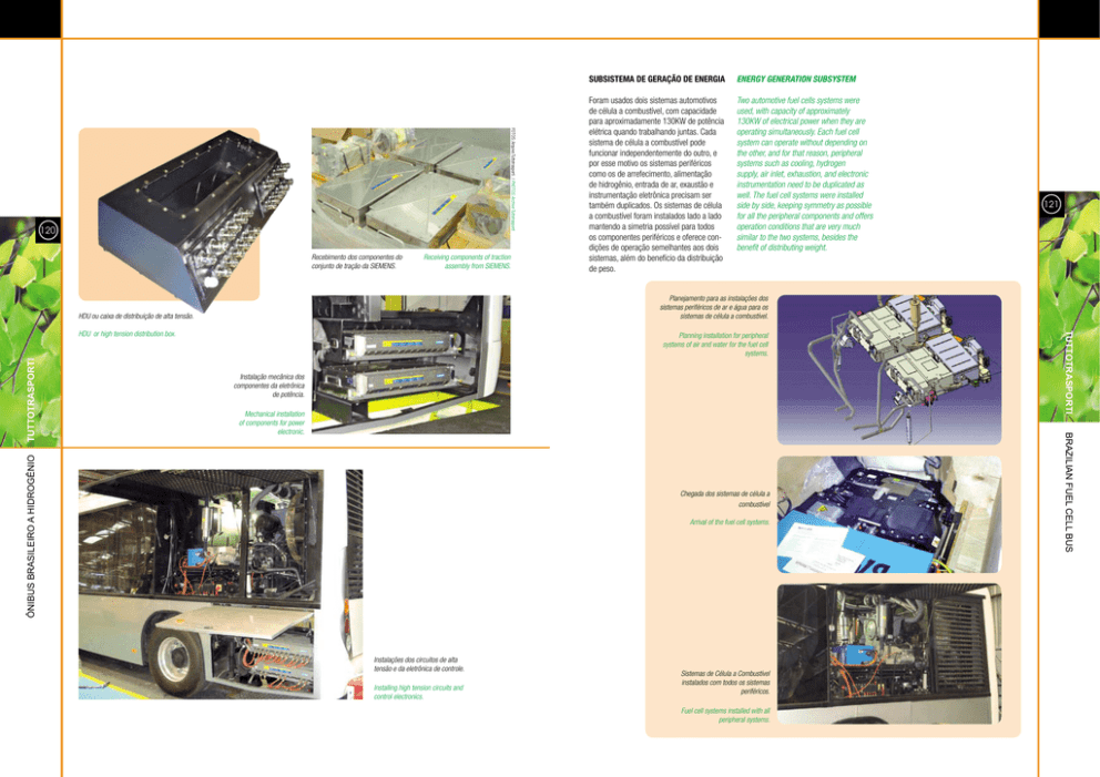 FOTOS: Arquivo Tuttotrasporti / PHOTOS: Archive Tuttotrasporti 120 Recebimento dos componentes do conjunto de tração da SIEMENS. Receiving components of traction assembly from SIEMENS. ENERGY GENERATION SUBSYSTEM Foram usados dois sistemas automotivos de célula a combustível, com capacidade para aproximadamente 130KW de potência elétrica quando trabalhando juntas. Cada sistema de célula a combustível pode funcionar independentemente do outro, e por esse motivo os sistemas periféricos como os de arrefecimento, alimentação de hidrogênio, entrada de ar, exaustão e instrumentação eletrônica precisam ser também duplicados. Os sistemas de célula a combustível foram instalados lado a lado mantendo a simetria possível para todos os componentes periféricos e oferece condições de operação semelhantes aos dois sistemas, além do benefício da distribuição de peso. Two automotive fuel cells systems were used, with capacity of approximately 130KW of electrical power when they are operating simultaneously. Each fuel cell system can operate without depending on the other, and for that reason, peripheral systems such as cooling, hydrogen supply, air inlet, exhaustion, and electronic instrumentation need to be duplicated as well. The fuel cell systems were installed side by side, keeping symmetry as possible for all the peripheral components and offers operation conditions that are very much similar to the two systems, besides the benefit of distributing weight. 121 Planejamento para as instalações dos sistemas periféricos de ar e água para os sistemas de célula a combustível. HDU ou caixa de distribuição de alta tensão. Planning installation for peripheral systems of air and water for the fuel cell systems. Instalação mecânica dos componentes da eletrônica de potência. Ônibus Brasileiro a Hidrogênio Chegada dos sistemas de célula a combustível Arrival of the fuel cell systems. Instalações dos circuitos de alta tensão e da eletrônica de controle. Installing high tension circuits and control electronics. Sistemas de Célula a Combustível instalados com todos os sistemas periféricos. Fuel cell systems installed with all peripheral systems. Brazilian Fuel Cell Bus Mechanical installation of components for power electronic. Tuttotrasporti HDU or high tension distribution box. Tuttotrasporti SUBSISTEMA DE GERAÇÃO DE ENERGIA 123 COOLING SYSTEMS O ônibus possui dois diferentes sistemas de arrefecimento, um que chamamos de LT, ou de baixa temperatura, e um HT ou de alta temperatura. O sistema de LT é composto por uma bomba d’água, um radiador e um ventilador hidráulico, além da instrumentação e controle necessários. Esse sistema é responsável pelo arrefecimento dos motores elétricos e toda a eletrônica de potência, e inclui ainda a função de alimentar os condensadores das células a combustível. The bus has two different cooling systems, one that we call LT, or low temperature, and the other one is HT or high temperature. The LT system is made up of a water pump, a radiator, and a hydraulic fan, in addition to all the instruments and control switches that is necessary. This system is responsible for cooling the electric motors and all the power electronic, and it also has the function of feeding the fuel cell condensers. Existem dois sistemas de HT, um para cada sistema de célula a combustível. Esses sistemas são essenciais para o funcionamento das células, que necessitam de um controle eficiente e preciso das temperaturas de entrada e saída de suas stacks. A stack é o módulo onde ocorre a reação entre hidrogênio e oxigênio e a consequente produção de eletricidade. Dentro desses módulos existe alta tensão, e por esse motivo o fluido de refrigeração precisa ter baixíssima condutividade elétrica. É usado nesse sistema água deionizada e componentes especiais para evitar a contaminação do líquido refrigerante, além disso, filtros limpam removendo partículas e íons mantendo a qualidade da água. There are two HT systems, one for each fuel cell system. These systems are essential for the operation of the cells, which need an efficient and accurate control of the temperatures in and out of their stacks. A stack is the module where the reaction between hydrogen and oxygen takes place, and the consequent production of energy. Inside those modules there is high voltage and because of that cooling fluid must have very low electric conductivity. Deionized water and special components are used in this system to prevent contamination of coolant, and in addition to that filters are used to remove particles and ions and keep the quality of the water. Diagrama esquemático do sistema de arrefecimento de baixa temperatura. Schematics for the low temperature cooling system. Componentes usados para os sistemas de arrefecimento. Components used for the cooling system. Diagrama esquemático do sistema de arrefecimento de alta temperatura. Schematics for the high temperature cooling system. Planejamento para instalação dos radiadores. Planning to install radiators. Projeto dos dispositivos de fixação dos radiadores. Project for radiator fixing devices. Instalação dos radiadores. Installing radiators. Brazilian Fuel Cell Bus FOTOS: Arquivo Tuttotrasporti / PHOTOS: Archive Tuttotrasporti Ônibus Brasileiro a Hidrogênio SISTEMAS DE ARREFECIMENTO Tuttotrasporti Tuttotrasporti 122 SUBSISTEMA DE ARMAZENAMENTO DE ENERGIA ELÉTRICA A energia que movimenta os motores elétricos do veículo é produzida pelas células a combustível e pode ser armazenada em baterias de alta capacidade. O veículo possui três baterias instaladas na parte traseira abaixo dos radiadores. Essas baterias trabalham a ELECTRIC ENERGY STORAGE SUBSYSTEM independent forced ventilation systems. Even though the external temperature of the batteries does not exceed 50º, in case of accidents where isolation is lost, there might be some elevation in the external temperat