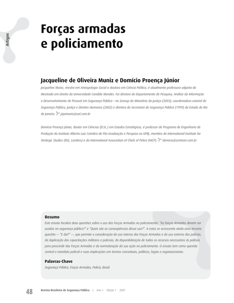 Artigos Forças armadas e policiamento Jacqueline de Oliveira Muniz e Domício Proença Júnior Jacqueline Muniz, mestre em Antropologia Social e doutora em Ciência Política, é atualmente professora adjunta do Mestrado em Direito da Universidade Candido Mendes. Foi diretora do Departamento de Pesquisa, Análise da Informação e Desenvolvimento de Pessoal em Segurança Pública – na Senasp do Ministério da Justiça (2003); coordenadora setorial de Segurança Pública, Justiça e Direitos Humanos (2002) e diretora da Secretaria de Segurança Pública (1999) do Estado do Rio de Janeiro. [email protected] Domício Proença Júnior, doutor em Ciências (D.Sc.) em Estudos Estratégicos, é professor do Programa de Engenharia de Produção do Instituto Alberto Luiz Coimbra de Pós-Graduação e Pesquisa na UFRJ, membro do International Institute for Strategic Studies (IISS, Londres) e da International Association of Chefs of Police (IACP). [email protected] Resumo Este ensaio focaliza duas questões sobre o uso das Forças Armadas no policiamento: “As Forças Armadas devem ser usadas na segurança pública?” e “Quais são as conseqüências desse uso?”. A estas se acrescenta ainda uma terceira questão — “E daí?” —, que permite a consideração do uso interno das Forças Armadas e do uso externo das polícias, da duplicação das capacitações militares e policiais, da disponibilização de todos os recursos necessários às polícias para prescindir das Forças Armadas e da normatização da sua ação no policiamento. O ensaio tem como questão central o mandato policial e suas implicações em termos conceituais, políticos, legais e organizacionais. Palavras-Chave Segurança Pública, Forças Armadas, Polícia, Brasil. 48 Revista Brasileira de Segurança Pública | Ano 1 Edição 1 2007 Artigos Este ensaio busca dar conta de duas questões que ambicionam circunscrever a questão de forma exaustiva — “As Força Armadas devem ser usadas na segurança pública?” e “Quais são as conseqüências desse uso?” —, às quais se acrescenta ainda, com amplo ganho, uma terceira: “E daí?”. 1. As Forças Armadas devem ser usadas na segurança pública? “Claro, sempre que necessário” – essa é a resposta política simples e direta que, por isso mesmo, serve de parâmetro para o debate e para a formulação de políticas públicas. Não há outra resposta conseqüente possível que não se arrisque a cair numa perspectiva fundamentalista da segurança pública e da defesa nacional. Qualquer outra resposta conflita com a realidade, aliena-se das evidências históricas. Forças armadas e policiamento Jacqueline de Oliveira Muniz e Domício Proença Júnior Q ual seja, ou deva ser, o papel das forças armadas na segurança pública brasileira, ele tem permanecido numa espécie de limbo. Isso tem possibilitado toda sorte de ruídos na compreensão das composições do policiamento público, dos seus propósitos e formas de emprego nas sociedades democráticas. De jure, a destinação constitucional do artigo 142 da Constituição franqueia a ação das Forças Armadas na “garantia da lei e da ordem” — “GLO”, no jargão militar — por iniciativa dos poderes constitucionais. Essa autorização se confronta com a prática de arranjos políticos, expedientes entre estados e União numa ampla variedade de circunstâncias. De facto, pode-se elencar algumas dezenas de ocasiões em que as Forças Armadas e, por razões razoavelmente evidentes, o Exército brasileiro foram utilizados para substituir, complementar ou suplementar a ação policial. É uma marca do nosso tempo que respostas simples necessitem de qualificativos e explicações. Desse modo, é oportuno iniciar pela afirmativa de que esta é a resposta mais abrangente e desafiante, para todas as questões que se possam colocar quanto à ação das Forças Armadas no provimento da segurança pública. O uso doméstico das Forças Armadas para respaldar a paz social e as leis sobre a população de que se originam dá conta de todas as circunstâncias nas quais elas fazem policiamento. Qualquer outro policiamento é de fato provisional ou colateral diante dessa tarefa doméstica. Não esperamos que esta afirmação baste por si mesma e por isso é de alguma utilidade demonstrá-la. Desde logo, todas as aplicações das Forças Armadas no policiamento em contextos inter-polity (internacionais, no uso corrente atual), tais como contra o terrorismo, contra o crime organizado, nas operações de paz etc., podem ser reveladas como variações do seu uso doméstico. Seus contextos específicos são Ano 1 Edição 1 2007 | Revista Brasileira de Segurança Pública 49 Forças armadas e policiamento Jacqueline de Oliveira Muniz e Domício Proença Júnior Artigos menos problemáticos do que este uso, ainda que ocasionalmente tenham que dar conta de dinâmicas pontuais complexas ou de oponentes desafiantes. Mas o uso para fazer valer a paz, ou as “leis” da ONU, ou de outro organismo internacional, é um uso externo no qual a presença militar não causa surpresa. Quem mais poderia exercer tal policiamento onde não existe uma soberania estabelecida, mas apenas o acordo político internacional? Note-se que todo tipo de “constabularidade” das forças armadas em terra, mar ou ar, que provê atividades de policiamento em fronteiras ou, por tratado, em áreas internacionais, se encontra incluída nesta consideração. O mesmo se pode dizer de todos os arranjos parciais, temporários ou ad hoc, que lidam com as formas de “constabularidade” doméstica, nesse sentido, intra-polity, independentemente da sua jurisdição. Estes dois casos apenas reafirmam o desafio do policiamento por forças armadas em cenários quase domésticos (ou provisoriamente domésticos) e encontram-se, por isso mesmo, contidos na resposta à pergunta inicial: “claro, sempre que necessário”. Haveria ainda o uso no policiamento,