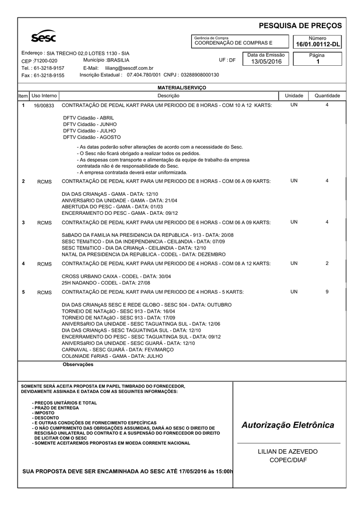 PESQUISA DE PREÇOS Número Gerência de Compra COORDENAÇÃO DE COMPRAS E Endereço : SIA TRECHO 02,0 LOTES 1130 - SIA Município : BRASILIA UF : DF CEP :71200-020 Tel. : 61-3218-9157 E-Mail: [email protected] Inscrição Estadual : 07.404.780/001 CNPJ : 03288908000130 Fax : 61-3218-9155 16/01.00112-DL Data da Emissão Página 13/05/2016 1 MATERIAL/SERVIÇO Item Uso Interno 1 16/00833 Descrição CONTRATAÇÃO DE PEDAL KART PARA UM PERIODO DE 8 HORAS - COM 10 A 12 KARTS: Unidade Quantidade UN 4 UN 4 UN 4 UN 2 UN 9 DFTV Cidadão - ABRIL DFTV Cidadão - JUNHO DFTV Cidadão - JULHO DFTV Cidadão - AGOSTO - As datas poderão sofrer alterações de acordo com a necessidade do Sesc. - O Sesc não ficará obrigado a realizar todos os pedidos. - As despesas com transporte e alimentação da equipe de trabalho da empresa contratada não é de responsabilidade do Sesc. - A empresa contratada deverá estar uniformizada. 2 RCMS CONTRATAÇÃO DE PEDAL KART PARA UM PERIODO DE 8 HORAS - COM 06 A 09 KARTS: DIA DAS CRIANçAS - GAMA - DATA: 12/10 ANIVERSáRIO DA UNIDADE - GAMA - DATA: 21/04 ABERTUDA DO PESC - GAMA - DATA: 01/03 ENCERRAMENTO DO PESC - GAMA - DATA: 09/12 3 RCMS CONTRATAÇÃO DE PEDAL KART PARA UM PERIODO DE 6 HORAS - COM 06 A 09 KARTS: SáBADO DA FAMíLIA NA PRESIDêNCIA DA REPúBLICA - 913 - DATA: 20/08 SESC TEMáTICO - DIA DA INDEPENDêNCIA - CEILâNDIA - DATA: 07/09 SESC TEMáTICO - DIA DA CRIANçA - CEILâNDIA - DATA: 12/10 NATAL DA PRESIDENCIA DA REPúBLICA - CODEL - DATA: DEZEMBRO 4 RCMS CONTRATAÇÃO DE PEDAL KART PARA UM PERIODO DE 4 HORAS - COM 08 A 12 KARTS: CROSS URBANO CAIXA - CODEL - DATA: 30/04 25H NADANDO - CODEL - DATA: 27/08 5 RCMS CONTRATAÇÃO DE PEDAL KART PARA UM PERIODO DE 4 HORAS - 5 KARTS: DIA DAS CRIANçAS SESC E REDE GLOBO - SESC 504 - DATA: OUTUBRO TORNEIO DE NATAçãO - SESC 913 - DATA: 16/04 TORNEIO DE NATAçãO - SESC 913 - DATA: 17/09 ANIVERSáRIO DA UNIDADE - SESC TAGUATINGA SUL - DATA: 12/06 DIA DAS CRIANçAS - SESC TAGUATINGA SUL - DATA: 12/10 ENCERRAMENTO DO PESC - SESC TAGUATINGA SUL - DATA: 09/12 ANIVERSáRIO DA UNIDADE - SESC GUARÁ - DATA: 12/10 CARNAVAL - SESC GUARÁ - DATA: FEV/MARÇO COLôNIADE FéRIAS - GAMA - DATA: JULHO Observações SOMENTE SERÁ ACEITA PROPOSTA EM PAPEL TIMBRADO DO FORNECEDOR, DEVIDAMENTE ASSINADA E DATADA COM AS SEGUINTES INFORMAÇÕES: - PREÇOS UNITÁRIOS E TOTAL - PRAZO DE ENTREGA - IMPOSTO - DESCONTO - E OUTRAS CONDIÇÕES DE FORNECIMENTO ESPECÍFICAS - O NÃO CUMPRIMENTO DAS OBRIGAÇÕES ASSUMIDAS, DARÁ AO SESC O DIREITO DE RESCISÃO UNILATERAL DO CONTRATO E A SUSPENSÃO DO FORNECEDOR DO DIREITO DE LICITAR COM O SESC - SOMENTE ACEITAREMOS PROPOSTAS EM MOEDA CORRENTE NACIONAL Autorização Eletrônica LILIAN DE AZEVEDO COPEC/DIAF SUA PROPOSTA DEVE SER ENCAMINHADA AO SESC ATÉ 17/05/2016 às 15:00h PESQUISA DE PREÇOS Número Gerência de Compra COORDENAÇÃO DE COMPRAS E Endereço : SIA TRECHO 02,0 LOTES 1130 - SIA Município : BRASILIA UF : DF CEP :71200-020 Tel. : 61-3218-9157 E-Mail: [email protected] Inscrição Estadual : 07.404.780/001 CNPJ : 03288908000130 Fax : 61-3218-9155 16/01.00112-DL Data da Emissão Página 13/05/2016 2 MATERIAL/SERVIÇO Item Uso Interno Descrição Unidade Quantidade Notas 1) NOS PREÇOS DEVERÃO ESTAR INCLUSOS OS VALORES DE FRETES, TAXAS, IMPOSTOS E DEMAIS ENCARGOS LEGAIS. 2) SOLICITAMOS ENCAMINHAR PROPOSTA PARA PARTICIPAÇÃO NO PROCESSO OU CARTA DE AGRADECIMENTO. 3) PAGAMENTO: PRAZO MÍNIMO DE 10 (DEZ) DIAS APÓS O RECEBIMENTO DO MATERIAL OU SERVIÇO COM A RESPECTIVA NOTA FISCAL. O PAGAMENTO SERÁ CREDITADO EM CONTA CORRENTE BANCÁRIA INDICADA PELA EMPRESA E OS DADOS CADASTRAIS APRESENTADOS (RAZÃO SOCIAL E CNPJ) DEVERÃO SER OS MESMOS, TANTO NA NOTA FISCAL QUANTO NO CADASTRO BANCÁRIO, EVITANDO A DEVOLUÇÃO DO PAGAMENTO PELO BANCO. É VEDADA A NEGOCIAÇÃO DE FATURAS OU TÍTULOS DE CRÉDITO COM INSTITUIÇÕES FINANCEIRAS. 4) BOLETO BANCÁRIO NÃO SERÁ ACEITO E SUA APRESENTAÇÃO ACARRETARÁ A NÃO ACEITAÇÃO DO PRODUTO E CONSEQÜENTE DEVOLUÇÃO. 5) NA NOTA FISCAL DEVERÃO CONSTAR OS DADOS BANCÁRIOS DA EMPRESA: NÚMERO E NOME DO BANCO, AGÊNCIA E CONTA. 6) PARA PARTICIPAR DO PRESENTE PROCESSO DE COMPRA, AS EMPRESAS DEVERÃO APRESENTAR A SEGUINTE DOCUMENTAÇÃO DE REGULARIDADE FISCAL: A) PROVA DE REGULARIDADE PARA COM A FAZENDA FEDERAL, ESTADUAL E MUNICIPAL DO DOMICÍLIO OU SEDE DA EMPRESA, NA FORMA DA LEI; E B) PROVA DE REGULARIDADE RELATIVA À SEGURIDADE SOCIAL - INSS, CONJUNTA E AO FUNDO DE GARANTIA POR TEMPO DE SERVIÇO - FGTS, NO CUMPRIMENTO DOS ENCARGOS INSTITUÍDOS POR LEI. 7) CONTATO PARA DÚVIDAS: LILIAN DE AZEVEDO GONCALVES TELEFONE: (61) 3218-9156 FAX: (61) 3218-9154 EMAIL: [email protected] 8) DAS PENALIDADES PARA PRESTAÇÃO DO SERVIÇO: EM CASO DE INEXECUÇÃO TOTAL OU PARCIAL, OU QUALQUER OUTRA INADIMPLÊNCIA SEM MOTIVO DE FORÇA MAIOR, A EMPRESA CONTRATADA ESTARÁ SUJEITA, SEM PREJUÍZO DA RESPONSABILIDADE CIVIL E CRIMINAL, NO QUE COUBER, GARANTIDA PRÉVIA DEFESA, ÀS PENALIDADES PREVISTAS NA LEGISLAÇÃO APLICÁVEL, PARA AS SEGUINTES HIPÓTESES: I) por inexecução parcial ou total do Contrato: a) advertência; b) multa de 5% (cinco por cento) sobre o valor total do Contrato c) suspensão temporária de participar em licitações e impedimento de contratar com o SESC/AR/DF, por um prazo de até 2 (dois) anos; SOMENTE SERÁ ACEITA PROPOSTA EM PAPEL TIMBRADO DO FORNECEDOR, DEVIDAMENTE ASSINADA E DATADA COM AS SEGUINTES INFORMAÇÕES: - PREÇOS UNITÁRIOS E TOTAL - PRAZO DE ENTREGA - IMPOSTO - DESCONTO - E OUTRAS CONDIÇÕES DE FORNECIMENTO ESPECÍFICAS - O NÃO CUMPRIMENTO DAS OBRIGAÇÕES ASSUMIDAS, DARÁ AO SESC O DIREITO DE RESCISÃO UNILATERAL DO CONTRATO E A SUSPENSÃO DO FORNECEDOR DO DIREITO DE LICITAR COM O SESC - SOMENTE ACEITAREMOS PROPOSTAS EM MOEDA CORRENTE NACIONAL Autorização Eletrônica LILIAN DE AZEVEDO COPEC/DIAF SUA PROPOSTA DEVE SER ENCAMINHADA AO SESC ATÉ 17/05/2016 às 15:00h PESQUISA DE PREÇOS Número Gerência de Compra COORDENAÇÃO DE COMP