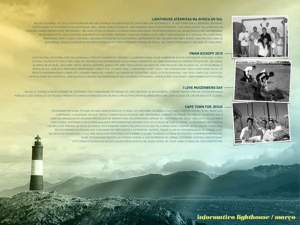 LIGHTHOUSE ATERRISSA NA ÁFRICA DO SUL NO DIA 3 DE MARÇO DE 2010 A SOUTH AFRICAN AIRLINES ENTREGA NO AEROPORTO DE CAPETOWN COM SEGURANÇA E, SE NOS PERMITEM A LIBERDADE, BASTANTE SOFISTICAÇÃO, OS INTEGRANTES DA LIGHTHOUSE: ABEL, DIOGO, GISELE E VANESSA. UMA BAGAGEM, MAIS ESPECIFICAMENTE A DO DIOGO, QUASE FICA ATRACADA NA CONEXÃO JOHANESBURGO-CAPE, NO ENTANTO, TÃO LOGO FOI SOLUCIONADO O EXTRAVIO FOMOS RECEBIDOS PELOS MISSIONÁRIOS DA JOCUM, QUE ALI NOS AGUARDAVAM. MUIZENBERG ESTÁ LOCALIZADA NOS SUBÚRBIOS DE CAPETOWN, PRÓXIMA À CURVA DA PENÍNSULA DO CABO. É UMA PEQUENA VILA RODEADA PELA NATUREZA: MONTANHAS, MAR E LAGOS, E AS CASAS SÃO ARQUITETADAS NO ESTILO EUROPEU. ANTIGAMENTE ERA UMA BASE MILITAR E SERVIA COMO REFÚGIO PARA OS VERANISTAS, SENDO SUA ENCOSTA UM PONTO DE ENCONTRO PARA ATIVIDADES COMUNS DA ÉPOCA, TAIS COMO O PIQUENIQUE E REUNIÃO DE FAMILIARES. YWAM KICKOFF 2010 LOGO NO FINAL DA ÚLTIMA COPA NA ALEMANHA, O PROJETO KICKOFF FOI PENSADO E ELABORADO PARA ATUAR TAMBÉM EM 2010 NO CONTINENTE AFRICANO. A IDÉIA CENTRAL DO PROJETO É FACILITAR A VIDA DAS EQUIPES E VOLUNTÁRIOS QUE ESCOLHERAM A ÁFRICA DO SUL PARA MISSIONAR NO PERÍODO EM QUESTÃO. SÃO VÁRIAS AS ÁREAS DE ATUAÇÃO, TAIS COMO: ARTES, MÚSICA, ESPORTE, DANÇA, ETC. ABEL TEM AJUDADO NA PARTE DE COMUNICAÇÃO COM AS BASES DA JOCUM DO BRASIL E ÁFRICA DO SUL, IGREJAS E PARCEIROS IMPORTANTES, COMO O THE ULTIMATE GOAL E SAMARITAN´S FEET. DIOGO TEM DESENVOLVIDO TODA A IDENTIDADE VISUAL DO PROJETO INCREMENTANDO O WEB-SITE, CRIANDO CAMISETAS, FLYERS E DECORAÇÃO DO ESCRITÓRIO. GISELE ESTÁ RESPONSÁVEL POR TODA A PARTE DE LOGÍSTICA E HOSPITALIDADE DOS INSCRITOS. VANESSA ESTÁ AJUDANDO NA COORDENAÇÃO DAS ATIVIDADES ROTINEIRAS. CONHEÇA MAIS ACESSANDO: WWW.YWAMKICKOFF2010.ORG I LOVE MUIZENBERG DAY NO DIA 12, TIVEMOS A OPORTUNIDADE DE COOPERAR COM A COMUNIDADE RETIRANDO OS LIXOS DAS RUAS DE MUIZENBERG. O EVENTO INICIOU COM UM LOUVOR EM PRAÇA PÚBLICA E LOGO DEPOIS AS 150 PESSOAS PRESENTES FORAM DISTRIBUÍDAS EM GRUPOS A FIM DE PERCORRER OS ARREDORES COM LUVAS E SACOS DE LIXO EM BUSCA DE SUJEIRA. CAPE TOWN FOR JESUS ESPERAVAM POR 65 MIL PESSOAS NO MAIS NOVO ESTÁDIO DE FUTEBOL DE CAPETOWN. FALTANDO 5 DIAS PARA O EVENTO APENAS 35 MIL INGRESSOS COMPRADOS. A ANSIEDADE ATÉ QUE TENTOU CHAMAR NOSSA ATENÇÃO, MAS PREFERIMOS COMBATÊ-LA ATRAVÉS DA ORAÇÃO. SOUBEMOS QUE A COMITIVA ORGANIZADORA BRADAVA POR AJUDA E DE IMEDIATO NOS VOLUNTARIAMOS; APESAR DE “CAPETOWN FOR JESUS” NÃO ESTAR RELACIONADO COM FUTEBOL SOPRAMOS O APITO PARA QUALQUER IMPEDIMENTO AO ATENDER ESTA SOLICITAÇÃO DE AUXÍLIO, AFINAL, A LIGHTHOUSE NÃO PODERIA FALTAR A ESTA PARTIDA! NO DIA 22 DE MARÇO, FOI O PRIMEIRO EVENTO RELIGIOSO ACOLHIDO PELO GREEN POINT STADIUM. NOSSA EQUIPE TRABALHOU RECEPCIONANDO AS PESSOAS QUE CHEGAVAM POR TRÊS PORTÕES DIFERENTES. INCRÍVEL PODER OLHAR AS ARQUIBANCADAS JÁ LOTADAS LOGO NO INÍCIO DA CELEBRAÇÃO! A FILA PARA INGRESSAR NO ESTÁDIO ERA ENORME, E SE NÃO PERDEMOS A CONTA FOI POSSÍVEL CUMPRIMENTAR MAIS DE 55 MIL PESSOAS NOS PORTÕES DO ESTÁDIO! CHEGOU A SER INFORMADO NO JORNAL O ESTADÃO, CONFIRA A REPORTAGEM: HTTP://WWW.ESTADAO.COM.BR/NOTICIAS/ESPORTES,EVENTO-RELIGIOSO-SERVE-DE-TESTE-PARA-ESTADIO-DA-COPA,528079,0.HTM. informativo lighthouse / março