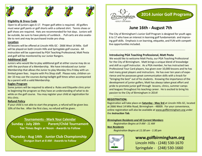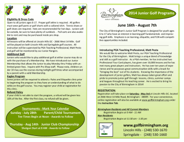 2014 Junior Golf Programs Eligibility & Dress Code Open to all juniors ages 6-17. Proper golf attire is required. All golfers must wear golf pants or golf shorts with a collared shirt. Tennis shoes or golf shoes are required. Hats are recommended for hot days. Juniors will be outside, be sure to have plenty of sunblock. . Pull carts are also available to rent and may be purchased inside pro shop. Location All lessons will be offered at Lincoln Hills GC - 2666 West 14 Mile. Golf will be played on both Lincoln Hills and Springdale golf courses. All instruction will be supervised by PGA Teaching Professional, Matt Pesta and golf will be monitored by our Junior Rangers. Additional Golf Juniors who would like to play additional golf at either course may do so with the purchase of a Membership. We have introduced our Junior Membership that allows the Junior to play Monday thru Friday with unlimited green fees. Inquire with Pro Shop staff. Please note, children under 10 may use the courses during twilight golf times when accompanied by a parent with a valid Membership. Eagles Program Some juniors will be required to attend a Rules and Etiquette clinic prior to beginning the program so they have an understanding of what to do while on the golf course. You may register your child at registration for this clinic. Refund Policy If your child is not able to start the program, a refund will be given less 10% of the fee. After the first class, no refund will be given. Tournaments - Mark Your Calendar Sunday - July 28th Parent/Child Tournament Tee Times Begin at Noon - Awards to Follow Thursday - Aug 14th Junior Club Championship Shotgun Start at 8 AM - Awards to Follow June 16th - August 7th The City of Birmingham’s Junior Golf Program is designed for youth ages 6 to 17 who have an interest in learning golf fundamentals and improving golf skills. Emphasis is on learning, etiquette, and FUN with competitive opportunities included. Introducing PGA Teaching Professional, Matt Pesta We would like to welcome Matt Pesta, our PGA Teaching Professional for the City of Birmingham. Matt brings a unique blend of knowledge and skill as a golf instructor. As a PGA member, he has instructed two Professional Tour Card players, has given over 10,000 lessons and he has met many great players and instructors. He has over ten years of experience and he possesses great communication skills with a knack for “bringing the best” out of his students. Knowing the importance of the development of junior golfers, Matt has always taken great effort and pride to promote junior golf through lessons, clinics, summer camps and leagues throughout his teaching career. He is excited to bring his passion to the City of Birmingham in 2014! REGISTRATION: Registration will take place on Saturday - May 3rd at Lincoln Hills GC, located at 2666 West 14 Mile Road, Birmingham - 48009. For your convenience, online registration will also be available at www.golfbirmingham.org under the Instruction Tab. Birmingham Residents and All Current Members Registration Begins at 9 AM - 11 AM Non Residents Registration Begins at 11:30 am - 1:30 pm www.golfbirmingham.org Lincoln Hills - (248) 530-1670 Springdale - (248) 530-1660 “The Birdies” AGES: 6-12 Residents $120 Non-Residents $130 This program is structured for children with little or no golf experience. Basic swing fundamentals will be taught in a fun and learning environment. Group lessons will consist of approximately 10-12 children per 1 hour session which will meet for 7 consecutive weeks. A basic set of equipment will be required for each student, to include a putter, 9-iron and/ or 7-iron, and driver or 3-wood. If you child will need clubs, we will take those request at registration on May 3rd. SELECTION OF CLASSES: Monday B1 1:30 pm B2 4:00 pm Tuesday B3 11:00 am B4 5:00 pm B5 6:30 pm “The Eagles” AGES: 9-17 Residents $215 Non-Residents $240 This program is designed for students who have some experience playing and want to improve their skills. Basic fundamentals will be taught in a structured format with an emphasis on learning certain swing elements in grip, stance, posture & balance, chipping, ball-striking, and putting on a weekly basis. Group lessons will consist of approximately 10-12 children per 1 hour session which will meet for 7 consecutive weeks. Also included will be 8 prearranged weekly tee times for playing golf with other students. These activities will be on 2 different days and the juniors should have a basic set of equipment. Please note, Make-ups for instruction are available at other classes on the schedule and we will also do make-ups during the week of Aug 4th 7th, and need to be arranged with Matt Pesta. Make-ups for golf, are available on the designated days of play and need to be arranged with pro shop. SELECTION OF CLASSES: Wednesday B6 9:00 am B7 11:00 am B8 2:30 pm B9 5:00 pm Thursday B10 10:00 am B11 4:00 pm B12 5:00 pm B13 6:30 pm Friday B14 11:00 am B15 6:00 pm Please note, Make-ups are available at other classes on the schedule and we will also do make-ups during the week of Aug 4th - 7th, and need to be arranged with Matt Pesta. Monday E1 9 :00 am E2 10:00 am E3 11:00 am E4 2:30 pm E5 5:00 pm E6 6:30 pm Tuesday E7 9:00 am E8 10:00 am E9 1:30 pm E10 2:30 pm E11 4:00 pm Wednesday E12 10:00 am E13 1:30 pm E14 4:00 pm E15 6:30 pm Thursday E16 9:00 am E17 11:00 am E18 1:30 pm E19 2:30 pm Friday E20 9:00 am E21 10:00 am E22 1:30 pm Saturday E23 10:00 am