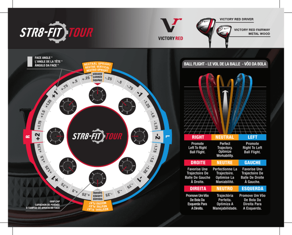 +.25 SQUAR E CARRÉE SQUARE -.25 -.5 - .7 5 - - 1 1 .25 +1 NEUTRAL LEFT Perfect Trajectory. Optimize Workability. Promote Right To Left Ball Flight. DROITE NEUTRE GAUCHE +2 RIGHT Promote Left To Right Ball Flight. R +2 + 1. - 1. 5 1.75 5 + - 1.7 5 - 1. 25 -.7 5 -.5 -.25 SQUAR E CARRÉE SQUARE +.25 NEUTRAL FLAT NEUTRE PLÂT N E UT RO F L A T +.5 + .7 5 + GRIP CAP CAPUCHON DE POIGNÉE O TAMPÃO DO APERTO DO TACO L -2 R -1.7 5 +1.75 + 1. - 1. 5 5 .25 -1 +1 . 25 1 75 +. +.5 FACE ANGLE ° L’ANGLE DE LA ÂNGULO DA FA BALL FLIGHT - LE VOL DE LA BALLE - VÔO DA BOLA NEUTRAL UPRIGHT NEUTRE VERTICAL NE UTRO UPR I GHT 1 + FACE ANGLE ° L’ANGLE DE LA TÊTE ° ÂNGULO DA FACE ° Favorise Une Perfectionne La Favorise Une Trajectoire De Trajectoire. Trajectoire De Balle De Gauche Optimise La Balle De Droite À Droite. Maniabilité. À Gauche. DIREITA Promove Um Vôo De Bola Da Esquerda Para A Direita. NEUTRO ESQUERDA Trajectória Promove Um Vôo Perfeita. De Bola Da Optimiza A Direita Para Manejabilidade. A Esquerda. G CAPUCHON DE O TAMPÃO DO APERTO FACE ANGLE ° L’ANGLE DE LA TÊTE ° ÂNGULO DA FACE ° BALL FLIGHT - LE VOL DE LA BALLE - VÔO DA BOLA NEUTRAL UPRIGHT NEUTRE VERTICAL NEUTRO UPRI GHT +2 1 - 1 + RIGHT NEUTRAL LEFT Promote Left To Right Ball Flight. Perfect Trajectory. Optimize Workability. Promote Right To Left Ball Flight. DROITE NEUTRE GAUCHE Favorise Une Perfectionne La Favorise Une Trajectoire De Trajectoire. Trajectoire De Balle De Gauche Optimise La Balle De Droite À Droite. Maniabilité. À Gauche. DIREITA SQUARE CARRÉE SQUARE NEUTRAL FLAT NEUTRE PLÂT N E UT RO F L A T GRIP CAP CAPUCHON DE POIGNÉE O TAMPÃO DO APERTO DO TACO L -2 R - 1 1 + SQUAR E CARRÉE SQUARE Promove Um Vôo De Bola Da Esquerda Para A Direita. NEUTRO ESQUERDA Trajectória Promove Um Vôo Perfeita. De Bola Da Optimiza A Direita Para Manejabilidade. A Esquerda.