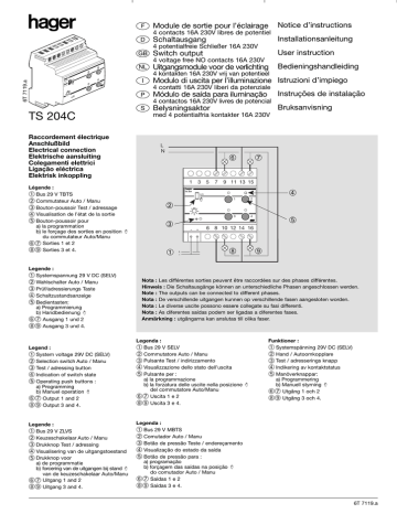F Notice d’instructions Module de sortie pour l’éclairage 4 contacts 16A 230V libres de potentiel D Installationsanleitung Schaltausgang 4 potentialfreie Schließer 16A 230V GB User instruction Switch output 4 voltage free NO contacts 16A 230V 2 NL 6T 7119.a 204 TS 230 auto 4 V I 1 16A Uitgangsmodule voor de verlichting Bedieningshandleiding 4 kontakten 16A 230V vrij van potentieel 1 AC Modulo di uscita per l’illuminazione Istruzioni d’impiego 4 contatti 16A 230V liberi da potenziale 3 P Instruções de instalação Módulo de saída para iluminação 4 contactos 16A 230V livres de potencial S TS 204C Raccordement électrique Anschlußbild Electrical connection Elektrische aansluiting Colegamenti elettrici Ligação eléctrica Elektrisk inkoppling med 4 potentialfria kontakter 16A 230V L N Legende : ➀ Systemspannung 29 V DC (SELV) ➁ Wahlschalter Auto / Manu ➂ Prüf/adressierungs Taste ➃ Schaltzustandsanzeige ➄ Bedientasten: a) Programmierung b) Handbedienung ➅➆ Ausgang 1 und 2 ➇➈ Ausgang 3 und 4. ➆ ➅ 1 Légende : ➀ Bus 29 V TBTS ➁ Commutateur Auto / Manu ➂ Bouton-poussoir Test / adressage ➃ Visualisation de l’état de la sortie ➄ Bouton-poussoir pour a) la programmation b) le forçage des sorties en position du commutateur Auto/Manu ➅➆ Sorties 1 et 2 ➇➈ Sorties 3 et 4. Bruksanvisning Belysningsaktor 3 5 7 9 11 13 15 ➃ TS 204 auto ➁ ➂ ➀ 1 2 3 4 ➄ 6 8 10 12 14 16 ➇ ➈ Nota : Les différentes sorties peuvent être raccordées sur des phases différentes. Hinweis : Die Schaltausgänge können an unterschiedliche Phasen angeschlossen werden. Note : The outputs can be connected to different phases. Nota : De verschillende uitgangen kunnen op verschillende fasen aangesloten worden. Nota : Le diverse uscite possono essere collegate su fasi differenti. Nota : As diferentes saídas podem ser ligadas a diferentes fases. Anmärkning : utgångarna kan anslutas till olika faser. Legend : ➀ System voltage 29V DC (SELV) ➁ Selection switch Auto / Manu ➂ Test / adressing button ➃ Indication of switch state ➄ Operating push buttons : a) Programming b) Manuel operation ➅➆ Output 1 and 2 ➇➈ Output 3 and 4. Legenda : ➀ Bus 29 V SELV ➁ Commutatore Auto / Manu ➂ Pulsante Test / indirizzamento ➃ Visualizzazione dello stato dell’uscita ➄ Pulsante per : a) la programmazione b) la forzatura delle uscite nella posizione del commutatore Auto/Manu ➅➆ Uscita 1 e 2 ➇➈ Uscita 3 e 4. Legende : ➀ Bus 29 V ZLVS ➁ Keuzeschakelaar Auto / Manu ➂ Drukknop Test / adressing ➃ Visualisering van de uitgangstoestand ➄ Drukknop voor a) de programmatie b) forcering van de uitgangen bij stand van de keuzeschakelaar Auto/Manu ➅➆ Uitgang 1 and 2 ➇➈ Uitgang 3 and 4. Legenda : ➀ Bus 29 V MBTS ➁ Comutador Auto / Manu ➂ Botão de pressão Teste / endereçamento ➃ Visualização do estado da saída ➄ Botão de pressão para : a) programação b) forçagem das saídas na posição do comutador Auto / Manu ➅➆ Saídas 1 e 2 ➇➈ Saídas 3 e 4. Funktioner : ➀ Systemspänning 29V DC (SELV) ➁ Hand / Autoomkopplare ➂ Test / adresserings knapp ➃ Indikering av kontaktstatus ➄ Manöverknappar: a) Programmering b) Manuell styrning ➅➆ Utgång 1 och 2 ➇➈ Utgång 3 och 4. 6T 7119.a F GB D Attention : Sicherheitshinweise: Safety Recommendations: -Appareil à installer uniquement par un installateur électricien. -Respecter les règles d’installation TBTS. - Einbau und Montage dürfen nur durch eine Elektrofachkraft erfolgen. - Installationsvorschriften zur Schutzmaßnahme SELV beachten. - Installation should only be carried out by a suitably qualified electrician - Observe the installation regulations of the protection measures SELV. Principe de fonctionnement Funktionsbeschreibung Function Le module TS 204C assure : - l’allumage et l’extinction des appareils d’éclairage - la mise en service et l’arrêt des prises de courants commandées - la mise en service et l’arrêt de la VMC - la commande d’appareils électriques nécessitant un contact libre de potentiel. En mode “Auto”, les ordres d’allumage et d’extinction proviennent des modules d’entrées du système Tébis TS. En mode “Manu” , ces commandes sont accessibles par les boutons poussoirs en façade du module (forçage). Ausgangsgerät mit 4 Schließerkontakten zum Schalten von Beleuchtungs- oder Steckdosenkreisen oder anderer Verbraucher. Der TS 204C wird über die Systemleitung von den zugeordneten Bus Eingängen gesteuert. Das Gerät verfügt zusätzlich über Handbedienmöglichkeit und Schaltzustandsanzeige für EIN/AUS. Output device with 4 NO contacts to switch lighting or socket circuits or other consumers. The TS 204C is controlled over the system line by allocated bus inputs. The device also provides a manual override facility and a visual indicator ON/OFF. Spécifications techniques Technische Daten Technical Specifications Caractéristiques électriques ● tension d’alimentation : bus 29V ● dissipation maximum du produit : < 8 W Elektrische Daten ● Versorgungsspannung: Systemspannung 29 V ● Verlustleistung: < 8 W Electrical data ● supply voltage: System voltage 29 V ● watts loss: < 8 W Caractéristiques fonctionnelles ● pouvoir de coupure : - AC1 : 16 A 250 V - incandescent : 2300 W - halogène BT : 2300 W - halogène TBT : - transformateur ferromagnétique : 1600VA - transformateur électronique : 1200 VA - fluorescent non compensé : 1200 W - fluorescent compensé parallèle : 200 W (22,5µF) ● durée de vie des contacts : 35 000 cycles par type de charge. Betriebsdaten ● Kontaktbelastbarkeit - AC1: 16 A 250 V - Glühlampen: 2300 W - V Halogen: 2300 W - NV Halogen: - konventionellen Transformator: 1600 VA - electronischen Transformator: 1200 VA - unkompensierte Leuchtstofflampen: 1200 W - parallel kompensierte Leuchtstofflampen: 200 W (22,5 µF). ● Kontaktlebensdauer: 35 000 Schaltspiele f