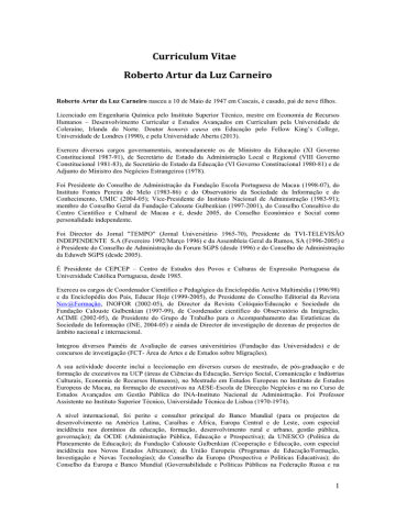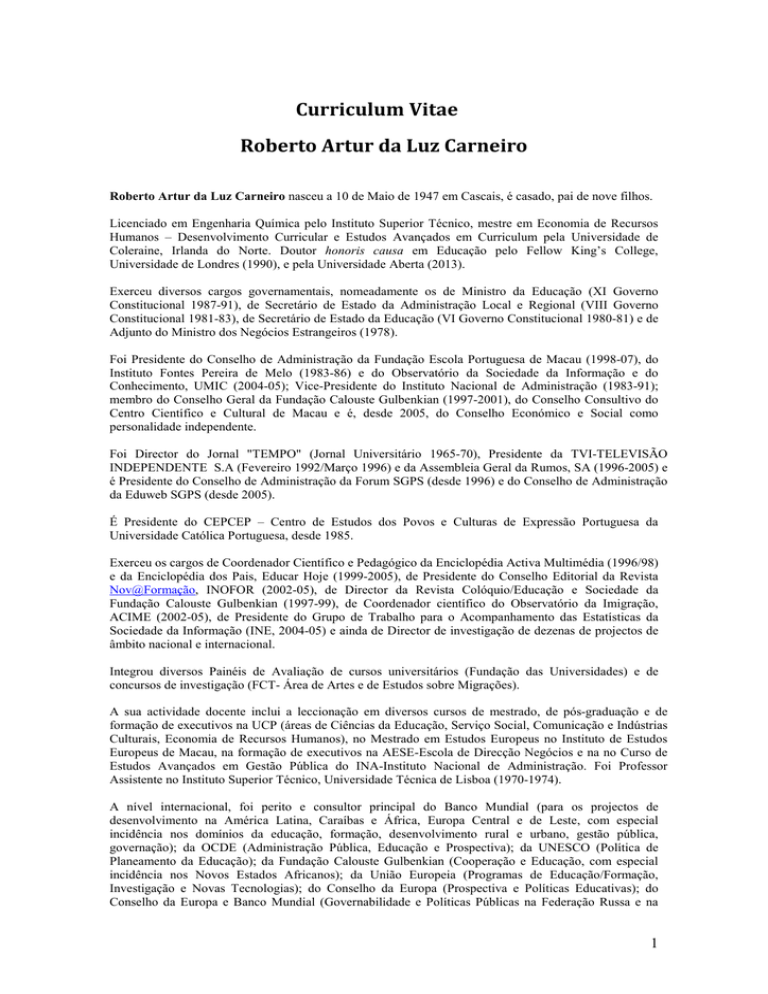 Curriculum Vitae Roberto Artur da Luz Carneiro Roberto Artur da Luz Carneiro nasceu a 10 de Maio de 1947 em Cascais, é casado, pai de nove filhos. Licenciado em Engenharia Química pelo Instituto Superior Técnico, mestre em Economia de Recursos Humanos – Desenvolvimento Curricular e Estudos Avançados em Curriculum pela Universidade de Coleraine, Irlanda do Norte. Doutor honoris causa em Educação pelo Fellow King’s College, Universidade de Londres (1990), e pela Universidade Aberta (2013). Exerceu diversos cargos governamentais, nomeadamente os de Ministro da Educação (XI Governo Constitucional 1987-91), de Secretário de Estado da Administração Local e Regional (VIII Governo Constitucional 1981-83), de Secretário de Estado da Educação (VI Governo Constitucional 1980-81) e de Adjunto do Ministro dos Negócios Estrangeiros (1978). Foi Presidente do Conselho de Administração da Fundação Escola Portuguesa de Macau (1998-07), do Instituto Fontes Pereira de Melo (1983-86) e do Observatório da Sociedade da Informação e do Conhecimento, UMIC (2004-05); Vice-Presidente do Instituto Nacional de Administração (1983-91); membro do Conselho Geral da Fundação Calouste Gulbenkian (1997-2001), do Conselho Consultivo do Centro Científico e Cultural de Macau e é, desde 2005, do Conselho Económico e Social como personalidade independente. Foi Director do Jornal "TEMPO" (Jornal Universitário 1965-70), Presidente da TVI-TELEVISÃO INDEPENDENTE S.A (Fevereiro 1992/Março 1996) e da Assembleia Geral da Rumos, SA (1996-2005) e é Presidente do Conselho de Administração da Forum SGPS (desde 1996) e do Conselho de Administração da Eduweb SGPS (desde 2005). É Presidente do CEPCEP – Centro de Estudos dos Povos e Culturas de Expressão Portuguesa da Universidade Católica Portuguesa, desde 1985. Exerceu os cargos de Coordenador Científico e Pedagógico da Enciclopédia Activa Multimédia (1996/98) e da Enciclopédia dos Pais, Educar Hoje (1999-2005), de Presidente do Conselho Editorial da Revista Nov@Formação, INOFOR (2002-05), de Director da Revista Colóquio/Educação e Sociedade da Fundação Calouste Gulbenkian (1997-99), de Coordenador científico do Observatório da Imigração, ACIME (2002-05), de Presidente do Grupo de Trabalho para o Acompanhamento das Estatísticas da Sociedade da Informação (INE, 2004-05) e ainda de Director de investigação de dezenas de projectos de âmbito nacional e internacional. Integrou diversos Painéis de Avaliação de cursos universitários (Fundação das Universidades) e de concursos de investigação (FCT- Área de Artes e de Estudos sobre Migrações). A sua actividade docente inclui a leccionação em diversos cursos de mestrado, de pós-graduação e de formação de executivos na UCP (áreas de Ciências da Educação, Serviço Social, Comunicação e Indústrias Culturais, Economia de Recursos Humanos), no Mestrado em Estudos Europeus no Instituto de Estudos Europeus de Macau, na formação de executivos na AESE-Escola de Direcção Negócios e na no Curso de Estudos Avançados em Gestão Pública do INA-Instituto Nacional de Administração. Foi Professor Assistente no Instituto Superior Técnico, Universidade Técnica de Lisboa (1970-1974). A nível internacional, foi perito e consultor principal do Banco Mundial (para os projectos de desenvolvimento na América Latina, Caraíbas e África, Europa Central e de Leste, com especial incidência nos domínios da educação, formação, desenvolvimento rural e urbano, gestão pública, governação); da OCDE (Administração Pública, Educação e Prospectiva); da UNESCO (Política de Planeamento da Educação); da Fundação Calouste Gulbenkian (Cooperação e Educação, com especial incidência nos Novos Estados Africanos); da União Europeia (Programas de Educação/Formação, Investigação e Novas Tecnologias); do Conselho da Europa (Prospectiva e Políticas Educativas); do Conselho da Europa e Banco Mundial (Governabilidade e Políticas Públicas na Federação Russa e na 1 Bósnia-Herzegovina, 1997-1999). Foi também fundador e membro do Conselho de Administração e do Conselho Consultivo da South East European University, Tetovo, Macedónia. Entre outras responsabilidades internacionais assumidas, destacam-se as de Consultor e Coordenador do Programa SIGMA, programa da OCDE/CEE visando o apoio às Reformas Institucionais e de Estado nos Países da Europa Central e de Leste (1992/95); Presidente da Comissão de Apoio ao Planeamento e Implantação da Universidade Católica de Angola; na OCDE, Examinador da Política Educativa da Turquia (1995), França (1993), Grécia (1995) e do Ensino Superior em França (1997); Membro da Comissão Internacional para a Educação no Século XXI, presidida por Jacques Delors (UNESCO, desde 1993); Vice-Presidente e Membro do Forum Sociedade da Informação criado no âmbito da Comissão Europeia, sob a iniciativa do Comissário M. Bangemann (desde Julho 1995-99); Vice-Presidente e Membro do Bureau que coordena o Grupo de Reflexão sobre Educação-Formação da Comissão Europeia, sob iniciativa da Comissária Edith Cresson (1995/98); Presidente do Painel de Avaliação quinquenal do Programa ESPRIT da UE (tecnologias da informação - 1996/97); Membro do Senior Expert Group do programa INFO 2000 (UE - 1997/98); Presidente do Painel de Avaliação Interina do programa INFO 2000 (UE – 1998); Membro do International Futures Forum, St. Andrews (2001-05); Membro do Conselho Científico do WEM (World Education Market) (2000-03); Membro da 2ª Câmara da e-Europa (2004-05) e Presidente da Task-Force sobre o futuro da Sociedade da Informação; Perito e Membro do Conselho Director da Conferência eLearning da Comissão Europeia (2005); Membro do ISTAG – Information Society Technologies Advisory Group – da Comissão Europeia (2005-06); Presidente do Conselho Científico da 3ª Conferência IberoAmericana sobre Indicadores para a Sociedad