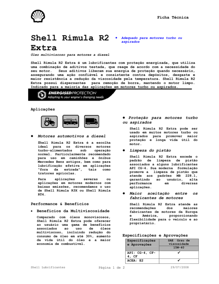 Ficha Técnica Shell Rimula R2 Extra • Adequado para motores turbo ou aspirados Óleo multiviscoso para motores a diesel Shell Rimula R2 Extra é um lubrificantes com proteção energizada, que utiliza uma combinação de aditivos testada, que reage de acordo com a necessidade do seu motor. Seus aditivos liberam sua energia de proteção quando necessário, assegurando uma ação confiável e consistente contra depósitos, desgaste e maior resistência a redução da viscosidade pela temperatura. Shell Rimula R2 Extra possui dispersantes para remoção de borra, mantendo o motor limpo. Indicado para a maioria das aplicações em motores turbo ou aspirados. Aplicações Proteção para motores turbo ou aspirados Shell Rimula R2 Extra pode ser usado em muitos motores turbo ou maior aspirados para promover proteção e longa vida útil do motor. Motores automotivos a diesel Shell Rimula R2 Extra é a escolha ideal para os diversos motores turbo-alimentados sob operação normal. Particularmente recomendado para uso em caminhões e ônibus Mercedes Benz antigos, bem como para lubrificação efetiva em aplicações “fora da estrada”, tais como tratores agrícolas. Para aplicações severas ou aplicações em motores modernos com baixas emissões, recomendamos o uso de Shell Rimula R3X ou Shell Rimula RT4. Shell Rimula R2 Extra excede o padrão de limpeza de pistão associados a alguns lubrificantes API CG-4. Sua moderna formulação promove a limpeza de pistão que atende aos padrões MB 228.1, garantindo ao usuário, alta performance em diversas aplicações. Performance & Benefícios • Shell Lubrificantes Maior aceitação entre fabricantes de motores os Shell Rimula R2 Extra atende as recomendações dos maiores fabricantes de motores da Europa e América, proporcionando flexibilidade para o veículo e ao proprietário. Benefícios da Multiviscosidade Comparado com óleos monoviscosos, Shell Rimula R2 Extra pode oferecer ao usuário uma gama de benefícios associados ao uso de óleos multiviscoso, incluindo redução do consumo de óleo em até 30%, aumento da vida útil do óleo e a maior economia de combustível. Limpeza do pistão Especificações e Aprovações Página 1 de 2 Especificações e Aprovações SAE Grau de viscosidade 15W-40 API: CG-4, CF4, CF ACEA: E2 29/07/2008 Ficha Técnica MAN: 271 MB Approval: 228.1 Volvo VDS Atendimento ao cliente Saúde e Segurança Para evitar danos aos indivíduos ou ao meio ambiente, utilize o produto de forma adequada e siga corretamente as indicações do fabricante do equipamento.Caso necessário, solicite a “Ficha de Informação de Segurança de Produtos Químicos”. Para mais informações, entre em contato com o TELETEC, nosso Serviço Técnico, através do telefone (11) 2171-0440 ou pelo correio eletrônico [email protected]. Visite nosso site www.shell.com.br Embalagens Caixa de 12 x 1L; Caixa de 4 x 4L; Bombona de 20L; Tambor de 200L; Granel; Características Típicas SAE Densidade @ 20/ 4ºC, g/ mL (ASTM D 1298) Viscosidade Cinemática a 40ºC, cSt (ASTM D 445) Viscosidade Cinemática a 100ºC, cSt (ASTM D 445) Índice de Viscosidade (ASTM D 2270) Ponto de Fulgor (COC), ºC (ASTM D 92) Ponto de Fluidez, ºC (ASTM D 97) TBN, mg KOH/g (ASTM D 4739) 15W-40 0,881 102 14.4 143 226 - 30 7.5 Todas as informações contidas nesse folheto baseiam-se em dados disponíveis na época de sua publicação. Reservamo-nos o direito de fazer modificações a qualquer momento, tanto no produto quanto na sua formulação, sem prévio aviso. Shell Lubrificantes Página 2 de 2 29/07/2008