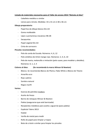 Listado de materiales necesarios para el Taller de verano 2014 “Retrato al óleo” - Caballete metálico o similar - Lienzo para retrato. Medidas: 33 x 41 cm ó 38 x 46 cm Dibujo preparatorio: - Papel liso de dibujo blanco Din-A3 - Goma moldeable - Lápiz o portaminas mecánico HB-2B - Sacapuntas - Papel vegetal Din-A3 - Cinta de carrocero Pinceles recomendados: - Pelo de cerda de Escoda. Números: 4, 6, 12 - Pelo sintético de Artist mango rojo. Números: 2, 4, 6, 10 - Pelo de marta, meloncillo o imitación (pelo suave, para modelar y detalles). Números: 0, 1, 2, 4 Colores al óleo: (Se recomienda la marca Winsor & Newton) - Blanco. Se recomienda Blanco de Plomo, Flake White o Blanco de Titanio - Amarillo ocre - Rojo cadmio - Sombra natural - Negro marfil Varios: - Esencia de petróleo inodora - Aceite de linaza - Barniz de retoques Winsor & Newton - Paleta (asegurarse que esté barnizada) - Recipientes metálicos para aceite y aguarrás (para paleta) - Espátula Talens 3013 - Espejo - Varilla de metal para medir - Rollo de papel para limpiar y trapos - Bote de cristal o similar para limpiar los pinceles