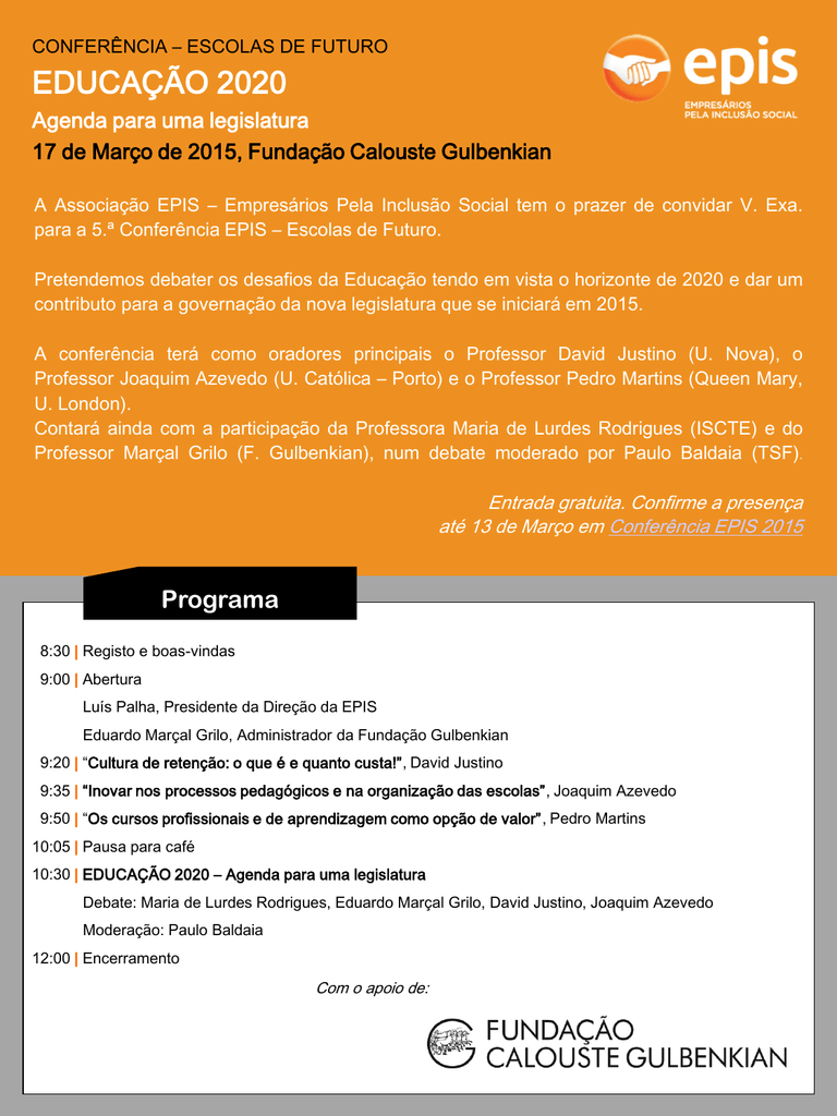 CONFERÊNCIA – ESCOLAS DE FUTURO EDUCAÇÃO 2020 Agenda para uma legislatura 17 de Março de 2015, Fundação Calouste Gulbenkian A Associação EPIS – Empresários Pela Inclusão Social tem o prazer de convidar V. Exa. para a 5.ª Conferência EPIS – Escolas de Futuro. Pretendemos debater os desafios da Educação tendo em vista o horizonte de 2020 e dar um contributo para a governação da nova legislatura que se iniciará em 2015. A conferência terá como oradores principais o Professor David Justino (U. Nova), o Professor Joaquim Azevedo (U. Católica – Porto) e o Professor Pedro Martins (Queen Mary, U. London). Contará ainda com a participação da Professora Maria de Lurdes Rodrigues (ISCTE) e do Professor Marçal Grilo (F. Gulbenkian), num debate moderado por Paulo Baldaia (TSF). Entrada gratuita. Confirme a presença até 13 de Março em Conferência EPIS 2015 Programa 8:30 | Registo e boas-vindas 9:00 | Abertura Luís Palha, Presidente da Direção da EPIS Eduardo Marçal Grilo, Administrador da Fundação Gulbenkian 9:20 | “Cultura de retenção: o que é e quanto custa!”, David Justino 9:35 | “Inovar nos processos pedagógicos e na organização das escolas”, Joaquim Azevedo 9:50 | “Os cursos profissionais e de aprendizagem como opção de valor”, Pedro Martins 10:05 | Pausa para café 10:30 | EDUCAÇÃO 2020 – Agenda para uma legislatura Debate: Maria de Lurdes Rodrigues, Eduardo Marçal Grilo, David Justino, Joaquim Azevedo Moderação: Paulo Baldaia 12:00 | Encerramento Com o apoio de: