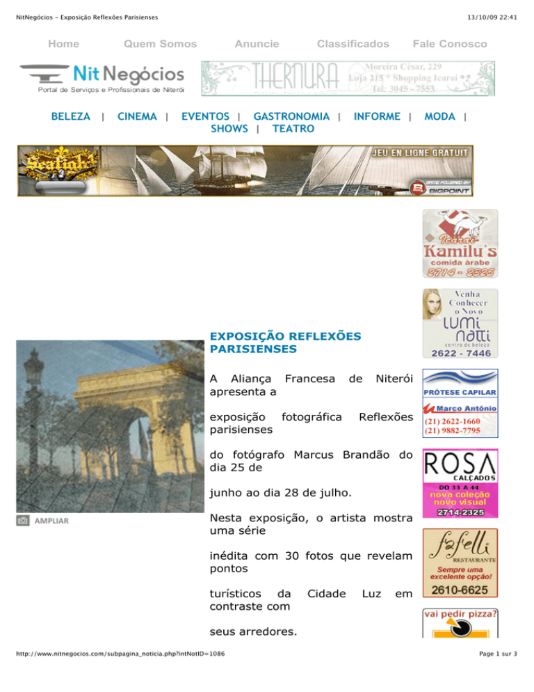 NitNegócios - Exposição Reflexões Parisienses Home BELEZA | 13/10/09 22:41 Quem Somos CINEMA | Anuncie Classificados EVENTOS | GASTRONOMIA | SHOWS | TEATRO Fale Conosco INFORME | MODA | EXPOSIÇÃO REFLEXÕES PARISIENSES A Aliança Francesa apresenta a de exposição fotográfica parisienses Niterói Reflexões do fotógrafo Marcus Brandão do dia 25 de junho ao dia 28 de julho. Nesta exposição, o artista mostra uma série inédita com 30 fotos que revelam pontos turísticos da contraste com Cidade Luz em seus arredores. http://www.nitnegocios.com/subpagina_noticia.php?intNotID=1086 Page 1 sur 3 NitNegócios - Exposição Reflexões Parisienses 13/10/09 22:41 Curioso e observador, fotografia que Marcus Brandão sentimentos e é divide na seus emoções. Observando-os, associá-los aos planos de próximo, revela tive a seu idéia de ambiente Marcus. Marcus Brandão Marcus Brandão mora há quase é recifense, e duas décadas na Europa. Durante uma Alemanha, temporada na encantou-se pela arte fotográfica ao visitar uma exposição da lendária Escola Bauhaus. Em Paris, faz diversos cursos de fotografias e aperfeiçoa sua técnica nos estúdios pin up. Depois de concluir sua formação na escola Gobelins, torna-se profissional e fotógrafo atualmente trabalha para algumas das http://www.nitnegocios.com/subpagina_noticia.php?intNotID=1086 Page 2 sur 3 NitNegócios - Exposição Reflexões Parisienses 13/10/09 22:41 principais revistas parisienses onde vive e exerce. Serviço: Aliança Francesa Niterói Exposição Reflexões Parisienses Data: De 25/06 a 28/07/2009 Horário: de segunda a sextafeira das 8h às 21h, Sábado das 8h às 12 horas. Endereço: Rua Lopes Trovão, 52 - Icaraí Niterói (Brasil) Entrada Franca Tel: 2610 3966 PUBLICADO EM: 23/06/2009 23:43 POR: RICARDO OLIVEIRA / plantão 17h34 | economia e negócios 17h32 | política http://www.nitnegocios.com/subpagina_noticia.php?intNotID=1086 17h31 | cinema Page 3 sur 3