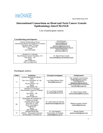 InterCHANGE Study 2016 International Consortium on Head and Neck Cancer Genetic Epidemiology-InterCHANGE List of participant centres Coordinating participants: Genetic Epidemiology Group International Agency for Research on Cancer 150 cours Albert Thomas 69372 Lyon cedex 08 Françe +33 47273 8391 Hospital A C Camargo Rua Professor Antonio Prudente, 211 Sao Paulo – SP Brazil CEP 01509-010 +55 (11) 2189 5178 Paul Brennan [email protected] Sandra Perdomo [email protected] [email protected] Valerie Gaborieau [email protected] Dr. Maria Paula Curado [email protected] Participant centres: CODE 11 12 20 17 Institution Instituto Nacional do Câncer – INCA Pça. Cruz Vermelha, 23 - 6o. andar Rio de Janeiro - RJ Brazil CEP 20230-130 Hospital A C Camargo Rua Professor Antonio Prudente, 211 Sao Paulo – SP Brazil CEP 01509-010 Associação de Combate ao Câncer em Goiás Hospital Araújo Jorge Rua 239, no. 236 Setor Universitário Goiânia-GO Brazil CEP 74605-070 Hospital Santa Rita AFECC - Associação Feminina de Educação e Combate ao Principal Investigator Luis Felipe Ribeiro Pinto [email protected] Dr. Luiz Paulo Kowalski [email protected] Dr. José Carlos de Oliveira [email protected] Dr. Jose Roberto Vasconcelos de Podesta [email protected] Collaborators Dra. Isabella Costa Santos [email protected] Anke Bergmann [email protected] Flávia Nascimento de Carvalho [email protected] Dr. Mauro Kasuo Ikeda [email protected] Matinair siqueira mineiro [email protected] Sandra Zeidler [email protected] 1 InterCHANGE Study 2016 Câncer Av. Marechal Campos, 1579 - Santos Dumont, Vitória/ES - CEP: 29040-091 Vitoria 31 Instituto de Oncología “Angel Roffo” Universidad de Buenos Aires Av. San Martin, 5481 Buenos Aires Argentina 32 Instituto Universitario del Hospital Italiano de Buenos Aires C/ Potosí 4234 C1417DTB Buenos Aires Argentina 41 Hospital de Clínicas Grupo Oncologico Cooperativo Uruguayo Av ItaliaS/N 11600 Montevideo Uruguay 51 52 Hospital Universitario Fundación Santa Fe de Bogotá Calle 119 No. 7-75 111111 Bogotá Colombia Hospital Pablo Tobón Uribe Calle 78B # 69-240 050034 Medellín Colombia [email protected] Dra. Marta Vilensky [email protected] Dr. Raul Eduardo Giglio [email protected] Francisco Javier Olivier Martos Dr, Marcelo Fernando Figari marcelo.figari@hospitalitalia no.org.ar [email protected] Dr. Andres Munyo [email protected] Dr. Mauricio Cuello [email protected] Dr. Paula Andrea Rodríguez Urrego [email protected] Dr. Ricardo D´Albora [email protected] Dr. Luis Eduardo Barrera Herrera [email protected] Dr. Jose Hakim [email protected] Dr. Álvaro Sanabria [email protected] 2