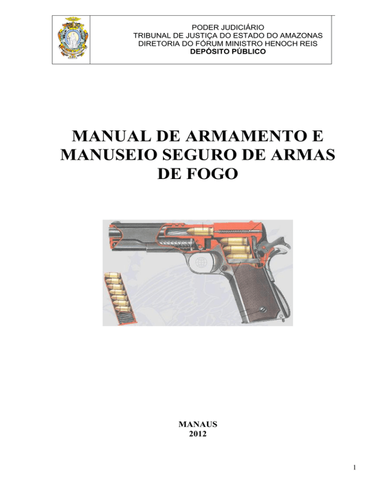 PODER JUDICIÁRIO TRIBUNAL DE JUSTIÇA DO ESTADO DO AMAZONAS DIRETORIA DO FÓRUM MINISTRO HENOCH REIS DEPÓSITO PÚBLICO MANUAL DE ARMAMENTO E MANUSEIO SEGURO DE ARMAS DE FOGO MANAUS 2012 1 PODER JUDICIÁRIO TRIBUNAL DE JUSTIÇA DO ESTADO DO AMAZONAS DIRETORIA DO FÓRUM MINISTRO HENOCH REIS DEPÓSITO PÚBLICO SUMÁRIO APRESENTAÇÃO ................................................................................................................ 03 1 Manuseio seguro com armas de fogo ................................................................................ 04 1.1 Conceito ............................................................................................................................ 04 1.2 Regras de segurança ........................................................................................................ 04 2 Arma de fogo ....................................................................................................................... 05 2.1 Conceito ............................................................................................................................ 05 2.2 Classificação ..................................................................................................................... 05 2.2.1 Quanto à alma do cano................................................................................................. 05 2.2.2 Quanto ao tamanho ...................................................................................................... 06 2.2.3 Quanto ao sistema de carregamento ........................................................................... 07 2.2.4 Quanto ao sistema de funcionamento ......................................................................... 08 2.2.5 Quanto ao sistema de acionamento ............................................................................. 08 3 Munição ............................................................................................................................... 09 3.1 Definição ........................................................................................................................... 09 3.2 Projétil .............................................................................................................................. 10 3.2.1 Tipos de pontas ............................................................................................................. 10 3.2.2 Projéteis encamisados .................................................................................................. 11 3.2.3 Estojo ............................................................................................................................. 12 3.2.4 Quanto aos tipos de base .............................................................................................. 13 3.2.5 Quanto ao tipo de iniciação ......................................................................................... 13 3.3 Propelente ......................................................................................................................... 14 3.4 Espoleta ............................................................................................................................ 14 3.4.1 Calibres medidos em centésimos de polegada............................................................ 17 3.4.2 Calibres medidos em milímetros ................................................................................. 18 3.4.3 Calibres no sistema “gauge“ ........................................................................................ 18 4. LEGISLAÇÃO .................................................................................................................. 22 4.1 LEIS .................................................................................................................................. 22 4.2 DECRETOS ..................................................................................................................... 23 4.3 PORTARIAS E INSTRUÇÕES NORMATIVAS POLÍCIA FEDERAL .................. 23 4.4 LEGISLAÇÃO CORRELATADA ................................................................................ 23 5. PARTES DA ARMA DE FOGO ...................................................................................... 24 REFERENCIAS .................................................................................................................... 29 ANEXOS ................................................................................................................................ 30 2 PODER JUDICIÁRIO TRIBUNAL DE JUSTIÇA DO ESTADO DO AMAZONAS DIRETORIA DO FÓRUM MINISTRO HENOCH REIS DEPÓSITO PÚBLICO APRESENTAÇÃO Este manual foi elaborado pelo setor de Depósito Público do Tribunal de Justiça do Amazonas e tem como objetivo principal preparar o servidor para o manuseio seguro e correto de armas de fogo, fornecendo conteúdos sobre conceito de armas de fogo e normas de segurança. A finalidade do manual é torna o manuseio de armamento a mais prática possível, padronizando a linguagem, de modo que todos possam falar a mesma língua, além de servir para consulta permanente. Para tanto ela foi dividida em quatro partes: 1. Manuseio seguro com armas de fogo 2. Conceito e classificação de armas de fogo 3. Calibre e conhecimento básico de munições 4. Legislações 3 PODER JUDICIÁRIO TRIBUNAL DE JUSTIÇA DO ESTADO DO AMAZONAS DIRETORIA DO FÓRUM MINISTRO HENOCH REIS DEPÓSITO PÚBLICO 1. MANUSEIO SEGURO COM ARMAS DE FOGO 1.1. CONCEITO O homem deve conhecer as regras indispensáveis à segurança com armas de fogo. As normas seguintes devem ser incutidas pela repetição constante na instrução, até que sua observância se torne um ato reflexo no manuseio com armas de fogo. 1.2. REGRAS DE SEGURANÇA 1. Escolher local seguro para o manuseio de uma arma de fogo; 2. A arma de fogo, carregada ou não JAMAIS deverá ser apontada para alg