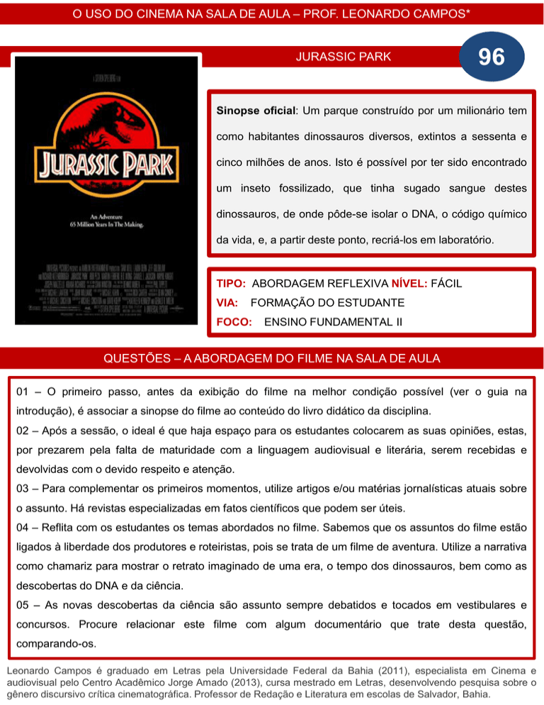 O USO DO CINEMA NA SALA DE AULA – PROF. LEONARDO CAMPOS* JURASSIC PARK 96 Sinopse oficial: Um parque construído por um milionário tem como habitantes dinossauros diversos, extintos a sessenta e cinco milhões de anos. Isto é possível por ter sido encontrado um inseto fossilizado, que tinha sugado sangue destes dinossauros, de onde pôde-se isolar o DNA, o código químico da vida, e, a partir deste ponto, recriá-los em laboratório. TIPO: ABORDAGEM REFLEXIVA NÍVEL: FÁCIL VIA: FORMAÇÃO DO ESTUDANTE FOCO: ENSINO FUNDAMENTAL II QUESTÕES – A ABORDAGEM DO FILME NA SALA DE AULA 01 – O primeiro passo, antes da exibição do filme na melhor condição possível (ver o guia na introdução), é associar a sinopse do filme ao conteúdo do livro didático da disciplina. 02 – Após a sessão, o ideal é que haja espaço para os estudantes colocarem as suas opiniões, estas, por prezarem pela falta de maturidade com a linguagem audiovisual e literária, serem recebidas e devolvidas com o devido respeito e atenção. 03 – Para complementar os primeiros momentos, utilize artigos e/ou matérias jornalísticas atuais sobre o assunto. Há revistas especializadas em fatos científicos que podem ser úteis. 04 – Reflita com os estudantes os temas abordados no filme. Sabemos que os assuntos do filme estão ligados à liberdade dos produtores e roteiristas, pois se trata de um filme de aventura. Utilize a narrativa como chamariz para mostrar o retrato imaginado de uma era, o tempo dos dinossauros, bem como as descobertas do DNA e da ciência. 05 – As novas descobertas da ciência são assunto sempre debatidos e tocados em vestibulares e concursos. Procure relacionar este filme com algum documentário que trate desta questão, comparando-os. Leonardo Campos é graduado em Letras pela Universidade Federal da Bahia (2011), especialista em Cinema e audiovisual pelo Centro Acadêmico Jorge Amado (2013), cursa mestrado em Letras, desenvolvendo pesquisa sobre o gênero discursivo crítica cinematográfica. Professor de Redação e Literatura em escolas de Salvador, Bahia.