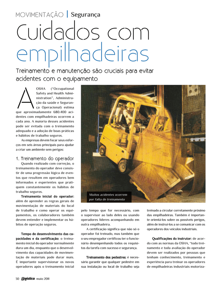 movimentação Segurança Cuidados com empilhadeiras Treinamento e manutenção são cruciais para evitar acidentes com o equipamento A OSHA (“Occupational Safety and Health Administration”, Administração da saúde e Segurança Operacional) estima que aproximadamente 680.400 acidentes com empilhadeiras ocorrem a cada ano. A maioria desses acidentes pode ser evitada com o treinamento adequado e a adoção de boas práticas e hábitos de trabalho seguros. As empresas devem focar seus esforços em seis áreas principais para ajudar a criar um ambiente sem perigos: 1. Treinamento do operador Quando realizado com correção, o treinamento do operador deve consistir de uma progressão lógica de eventos que resultem em operadores bem informados e experientes que pratiquem constantemente os hábitos de trabalho seguros. Treinamento inicial do operador: além de aprender as regras gerais de movimentação de materiais do local de trabalho e como operar os equipamentos, os colaboradores também devem entender e implementar os hábitos de operação seguros. Tempo de desenvolvimento das capacidades e da certificação: o treinamento inicial do operador normalmente dura um dia, enquanto que o desenvolvimento das capacidades de movimentação de materiais pode durar mais. É importante supervisionar os novos operadores após o treinamento inicial 30 maio 2011 Muitos acidentes ocorrem por falta de treinamento pelo tempo que for necessário, com o supervisor ao lado deles ou usando operadores líderes acompanhando em outra empilhadeira. A certificação significa que não só o operador foi treinado, mas também que o seu empregador certificou ter o funcionário desempenhando todos os requisitos da tarefa com sucesso e segurança. Treinamento dos pedestres: é necessário garantir que qualquer pedestre em sua instalação ou local de trabalho seja treinado a circular corretamente próximo das empilhadeiras. Também é importante orientá-los sobre os possíveis perigos, além de instruí-los a se comunicar com os operadores dos veículos industriais. Qualificações do instrutor: de acordo com as normas da OSHA, “todo treinamento e toda avaliação do operador devem ser realizados por pessoas que tenham conhecimento, treinamento e experiência para treinar os operadores de empilhadeiras industriais motoriza- S das e avaliar suas competências.” É necessário garantir que os instrutores sejam qualificados. É preciso também determinar onde termina o treinamento inicial e onde começam o treinamento e a avaliação no local de trabalho. e o gestor ignorar os equipamentos e manutenção, sacrificará a segurança do funcionário, além do tempo de operação, a produtividade e a vida útil dos equipamentos 2. Supervisão de explicar a necessidade de buzinar nos cruzamentos e reduzir a velocidade em tráfego pesado, provavelmente já estará perdendo a batalha. Os supervisores também devem passar pelo treinamento de operadores e entender completamente as regras da operação segura em todos os tipos de equipamentos dentro de seu local de trabalho. Mesmo se o programa de treinamento do operador de empilhadeira for dos melhores, ele só será eficaz se for apoiado por uma forte estrutura de supervisão. Se, após o término do treinamento, seus novos operadores entrarem em um ambiente onde os supervisores experientes desrespeitarem os hábitos de segurança, existe uma boa chance de qualquer lição aprendida pelos novos operadores ser esquecida rapidamente. É necessário garantir que os supervisores conheçam os hábitos a serem reforçados e possam identificar corretamente os hábitos operacionais seguros. Se o gestor perceber indiferença depois 3. Manutenção A manutenção bem planejada, realizada em intervalos adequados, junto com o uso de peças e métodos de reparos adequados, é a base de um bom programa de manutenção de equipamentos. Para formar essa base, é necessário também levar a sério as inspeções pré-expediente dos equipamentos e as queixas dos operadores e não deixar que os equipamentos sejam operados exceto se todos os sistemas estiverem atuando corretamente. Essa não é uma área onde se onde é possível trabalhar com um mínimo indispensável. Se o gestor sacrificar os equipamentos e facilitar a manutenção, sacrificará a segurança do funcionário, além do tempo de operação, a produtividade e a vida útil dos equipamentos. 4. Inspeção pré-uso Embora uma inspeção pré-uso cuidadosa seja exigida pela OSHA, é tam- ligue para: 11 2462-4622 Coberturas Nautika. Proteção especial para o seu patrimônio. www.nautika.com.br (11) 2462-4622 BA (71) 3378-1689 ..................................... SP ..................................... As coberturas da linha armazenagem são desenvolvidas especialmente para manter seus produtos protegidos contra qualquer tipo de adversidade externa. Comercializamos diversos tamanhos e modelos, tanto para locação quanto para venda, todos com montagem rápida e segura, sem causar danos ao meio ambiente. Entre em contato com a nossa equipe, temos uma cobertura ideal para o seu projeto. BH (31) 3492-6800 Focando a atenção nessas seis áreaschave, é possível aumentar a segurança do local de trabalho de forma significativa. A criação de um ambiente mais seguro para a operação das empilhadeiras ajuda a evitar acidentes aos operadores e danos aos equipamentos, à instalação e aos produtos, além de protegê-lo de possíveis responsabilidades e multas e até mesmo reduzir os custos do seu seguro e da manutenção. Causas das lesões Treino correto garante ambiente operacional seguro bém uma prática inteligente das empresas. Essas inspeções sempre devem ser feitas antes que qualquer equipamento seja colocado em operação durante um expediente. As inspeções pré-uso normalmente ocupam pouco tempo dos operadores experientes. Quando feitas correta e regularmente, elas permitem que os operadores entendam completamente 