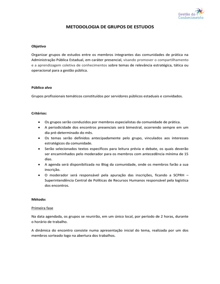 METODOLOGIA DE GRUPOS DE ESTUDOS Objetivo Organizar grupos de estudos entre os membros integrantes das comunidades de prática na Administração Pública Estadual, em caráter presencial, visando promover o compartilhamento e a aprendizagem coletiva de conhecimentos sobre temas de relevância estratégica, tática ou operacional para a gestão pública. Público alvo Grupos profissionais temáticos constituídos por servidores públicos estaduais e convidados. Critérios: Os grupos serão conduzidos por membros especialistas da comunidade de prática. A periodicidade dos encontros presenciais será bimestral, ocorrendo sempre em um dia pré-determinado do mês. Os temas serão definidos antecipadamente pelo grupo, vinculados aos interesses estratégicos da comunidade. Serão selecionados textos específicos para leitura prévia e debate, os quais deverão ser encaminhados pelo moderador para os membros com antecedência mínima de 15 dias. A agenda será disponibilizada no Blog da comunidade, onde os membros farão a sua inscrição. O moderador será responsável pela apuração das inscrições, ficando a SCPRH – Superintendência Central de Políticas de Recursos Humanos responsável pela logística dos encontros. Método: Primeira fase Na data agendada, os grupos se reunirão, em um único local, por período de 2 horas, durante o horário de trabalho. A dinâmica do encontro consiste numa apresentação inicial do tema, realizada por um dos membros sorteado logo na abertura dos trabalhos. Na seqüência, o grupo debate as idéias em torno do tema tratado e elege um relator, que produzirá, ao final da discussão, um relatório contendo a síntese das conclusões do grupo. Para tanto, será disponibilizado um formulário padrão na ferramenta tecnológica. Segunda fase A cada ciclo bimestral de estudos será gerado um Fórum de Discussões, a fim de que os diversos grupos participantes possam trocar idéias entre si, dando margem para que sejam afloradas dúvidas, divergências e pontos de consenso, permitindo o efetivo aprendizado organizacional, inclusive pela incorporação de servidores que não tenham participado diretamente dos encontros. Os Fóruns serão conduzidos pelo moderador, com o apoio de membros especialistas, que deverão apresentar domínio técnico sobre o tema e produzir um relatório sintético de fechamento da discussão. Este relatório, disponibilizado na ferramenta tecnológica, traduzirá o posicionamento final da comunidade sobre o tema em questão, servindo como referência para a reflexão de todos os servidores, quando cabível e pertinente.